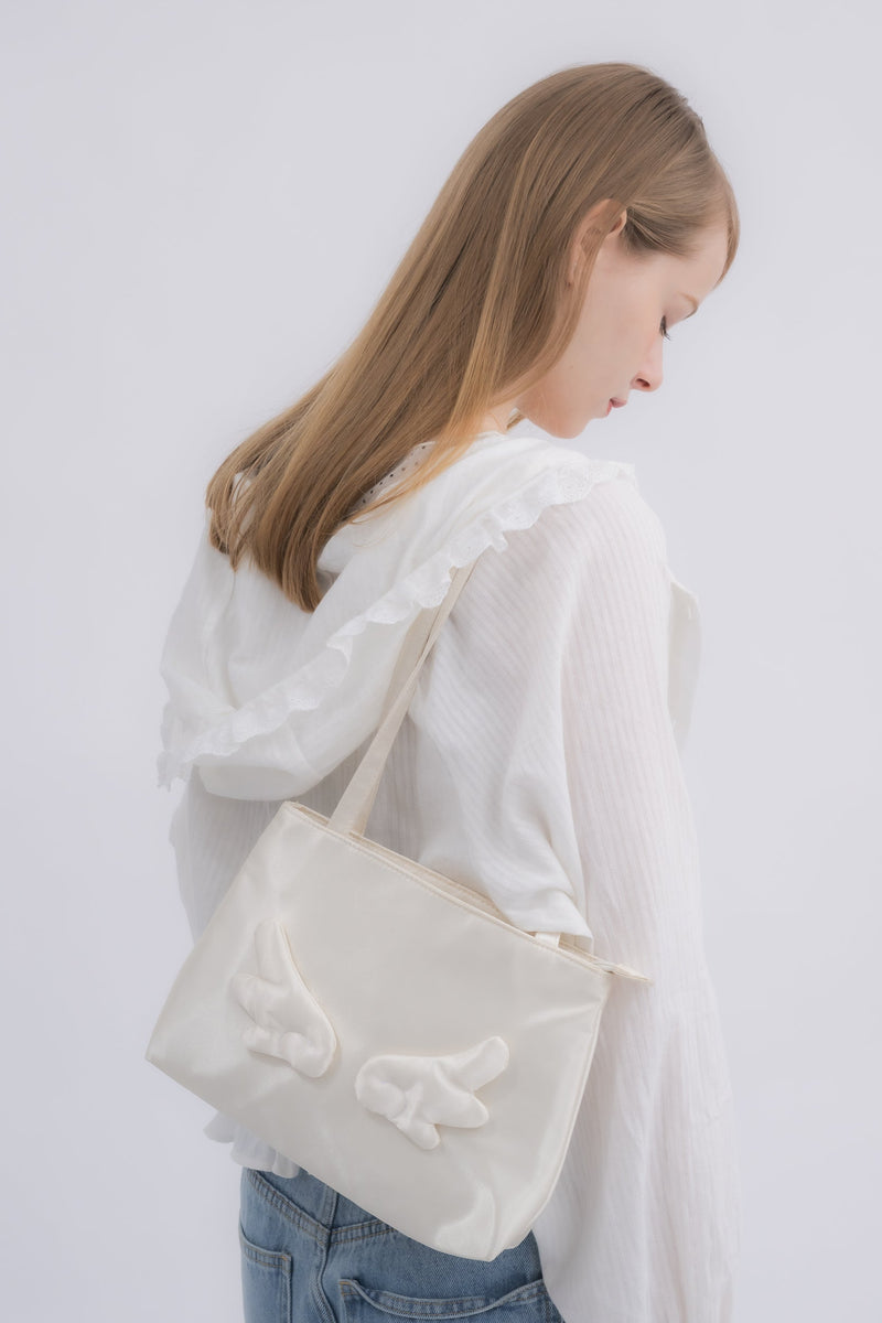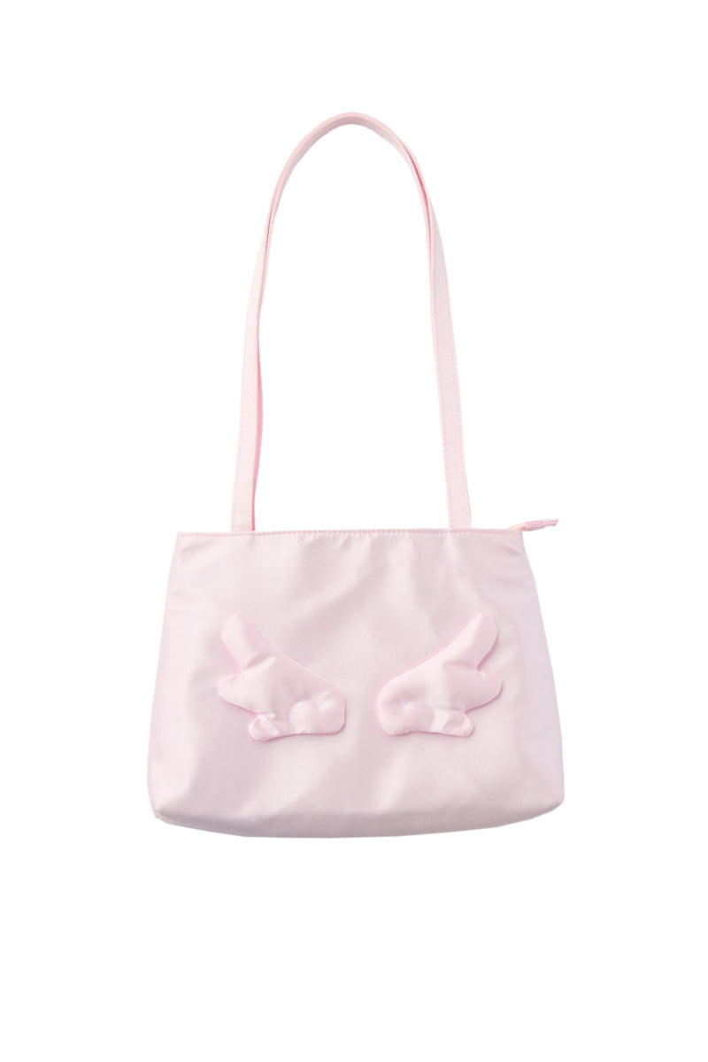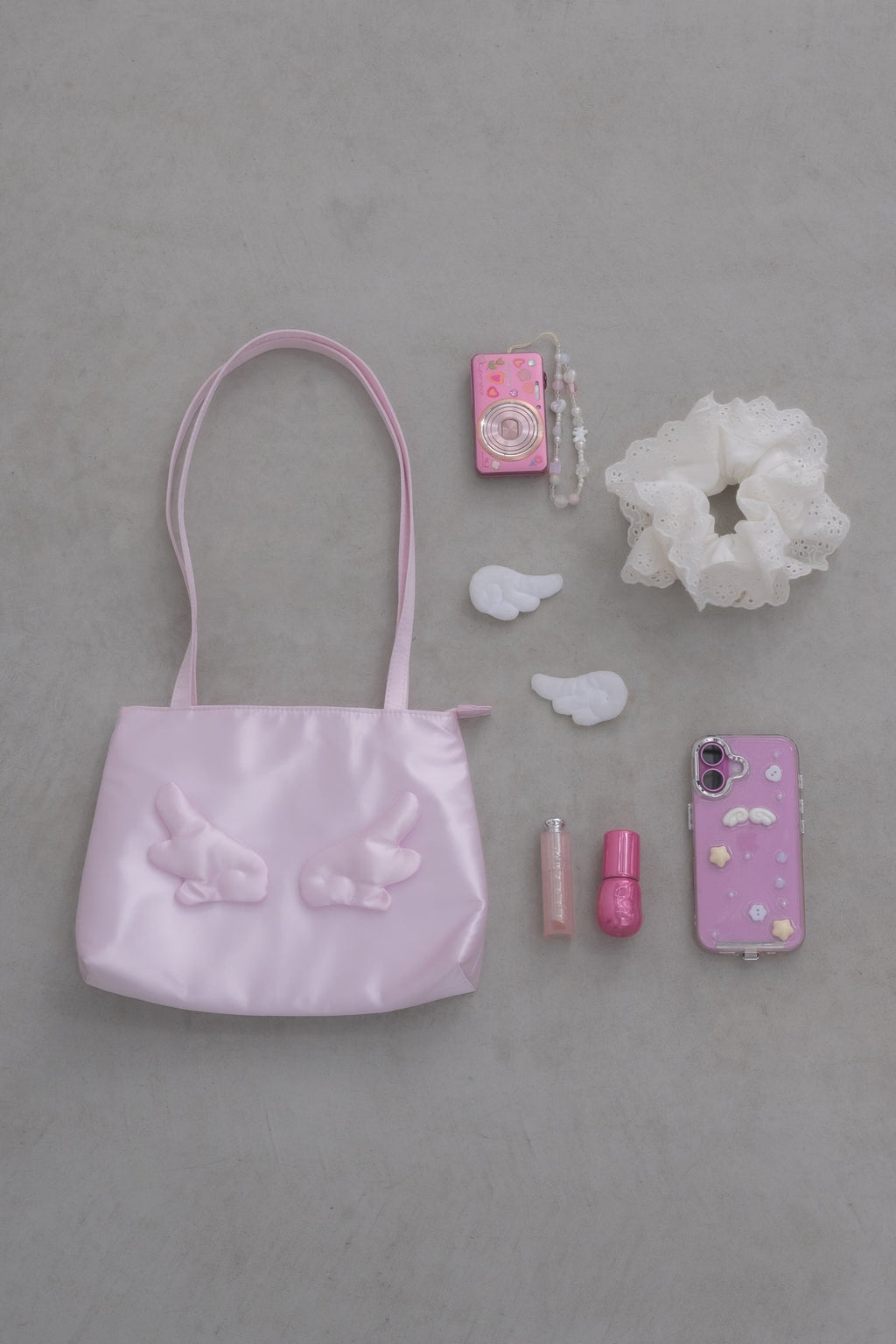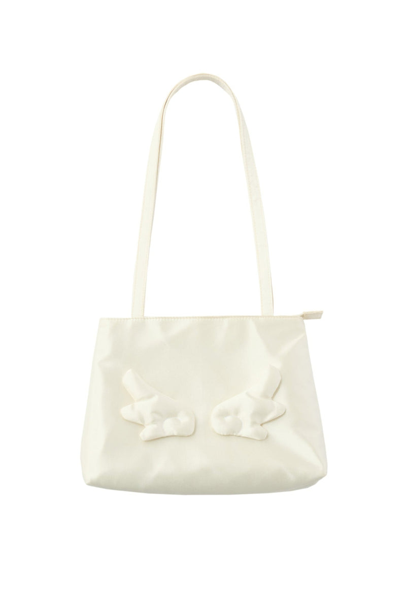 羽モチーフが印象的なサテン風ナイロンバッグ