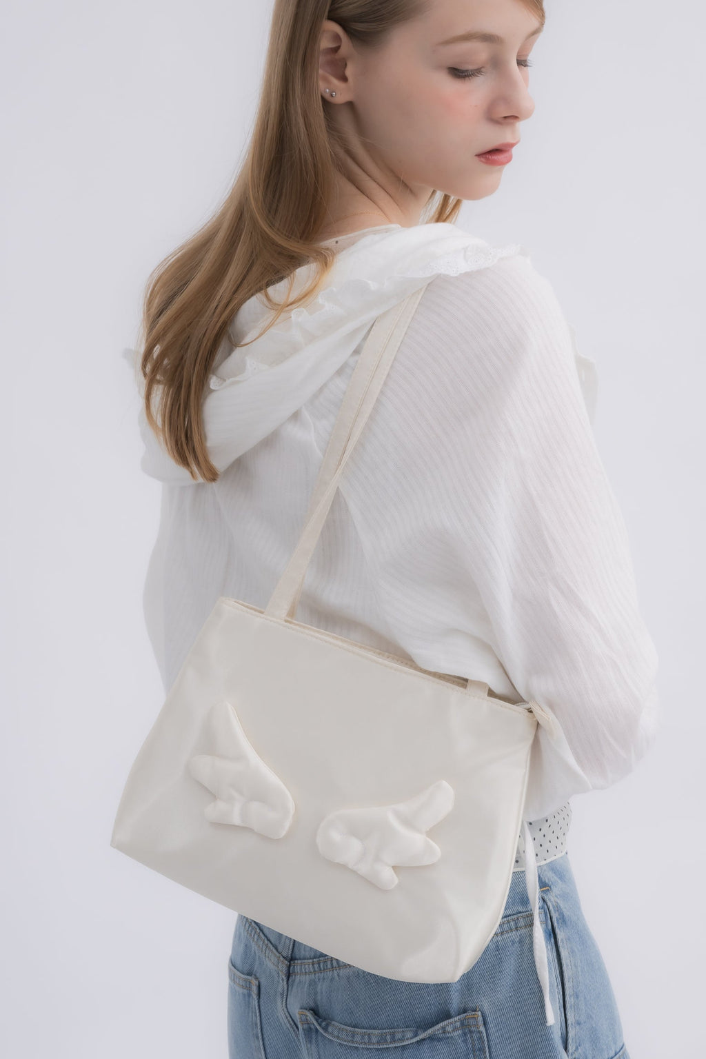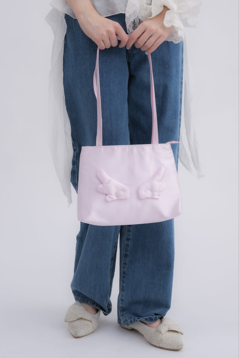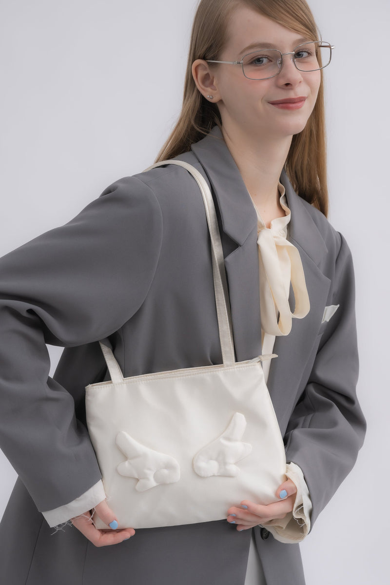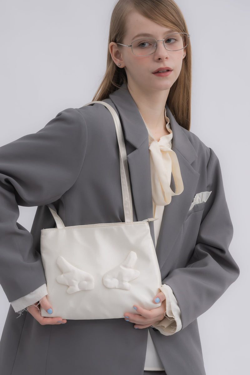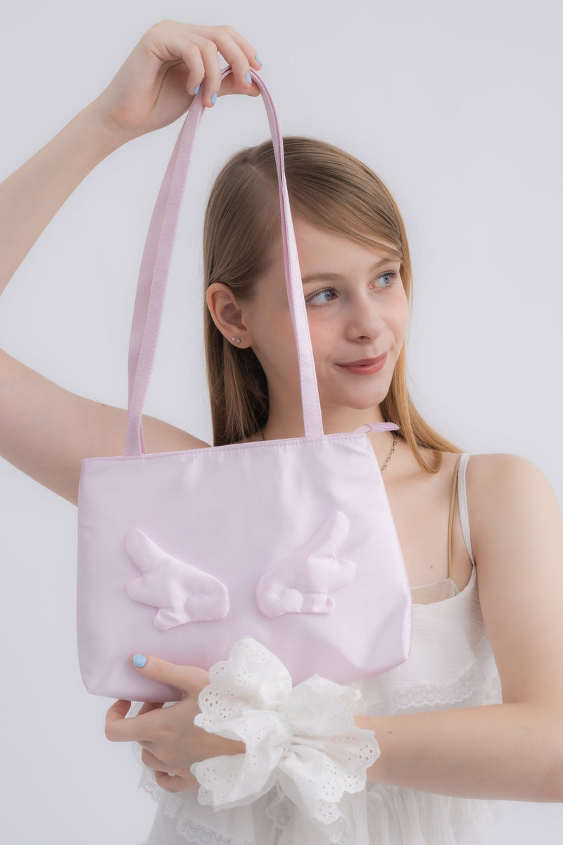 羽モチーフが印象的なサテン風ナイロンバッグ
