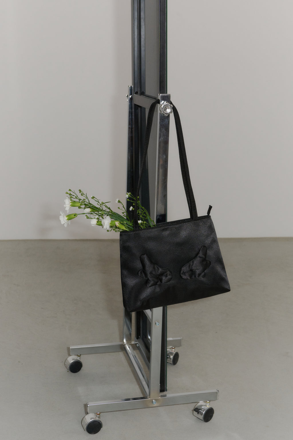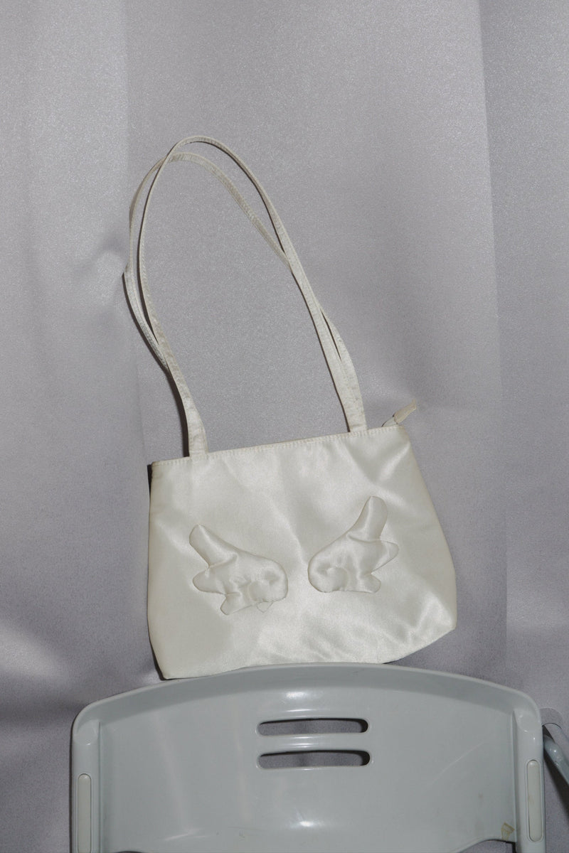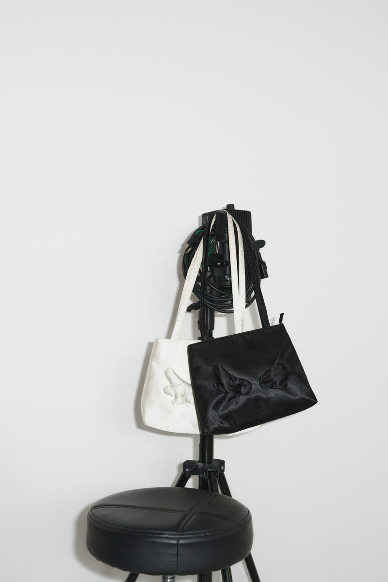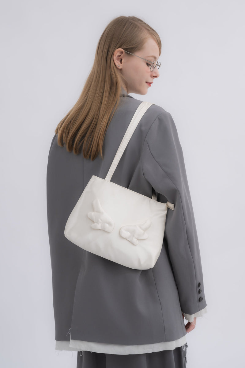 羽モチーフが印象的なサテン風ナイロンバッグ