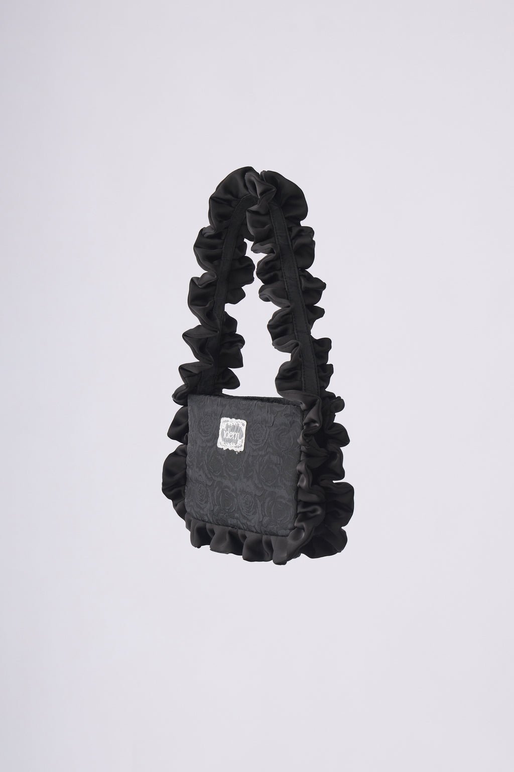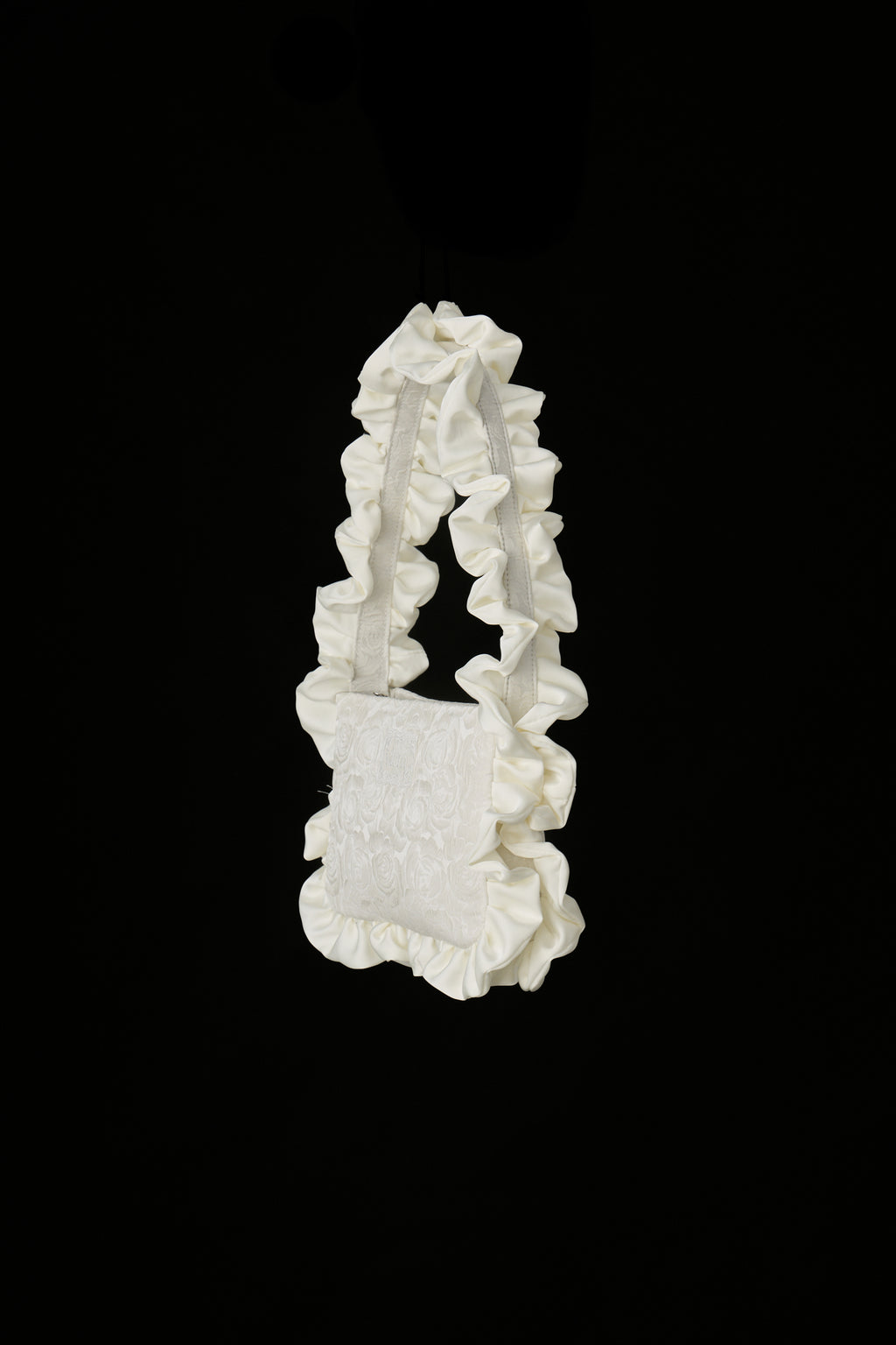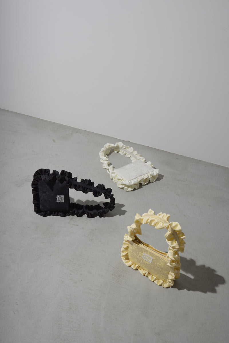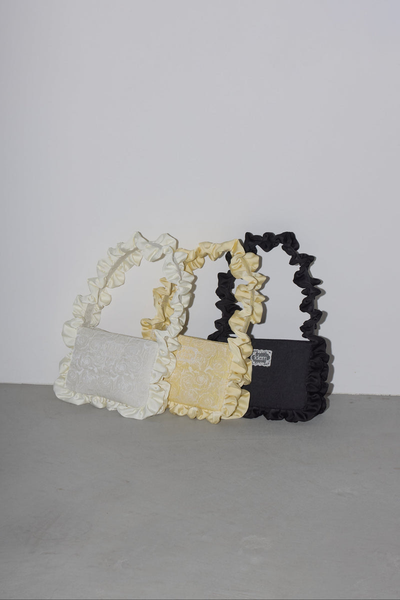 上品でクラシカルなデザインながら、サテンフリルがほどよく甘さを添える大人可愛いバッグ。