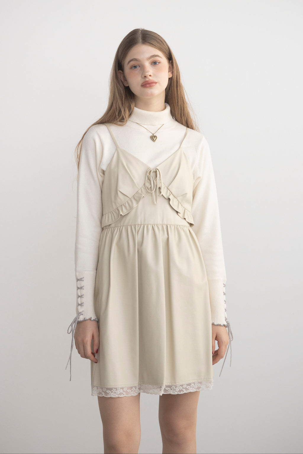 フリル&レースがアクセントの レザーミニワンピ。
