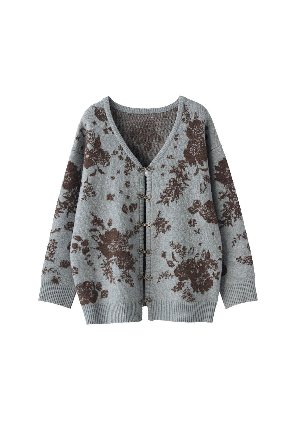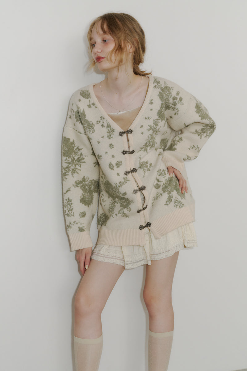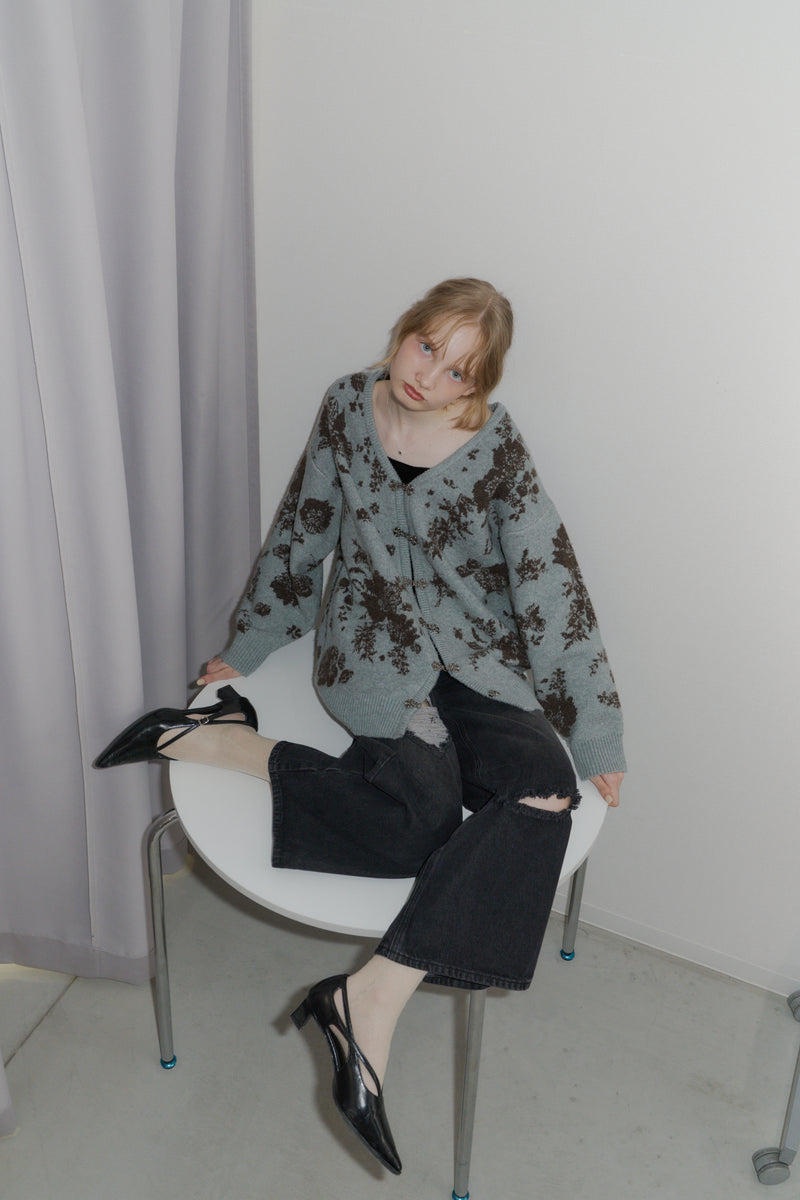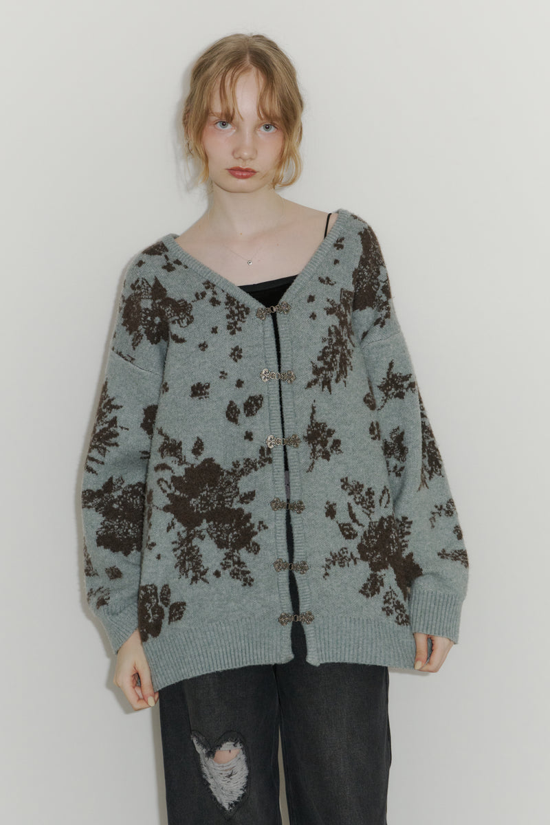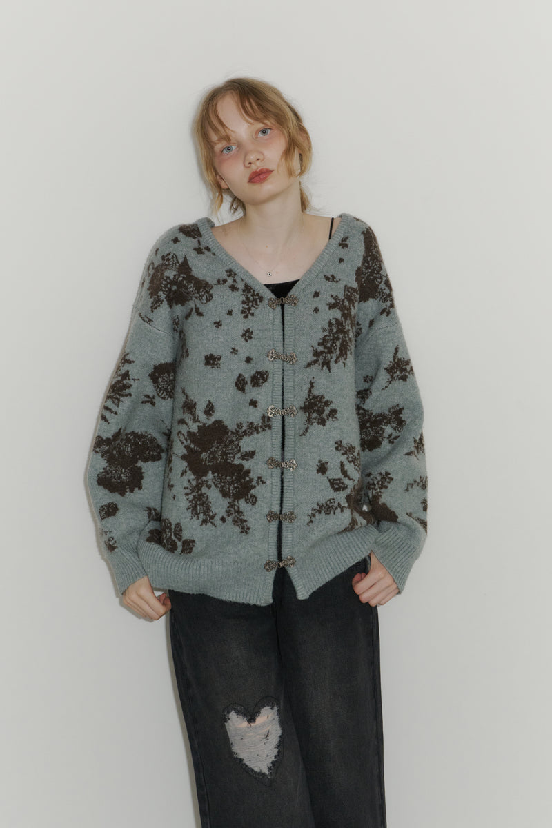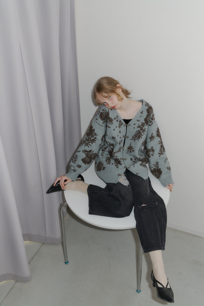 メタルフックと存在感のある花柄のニットカーディガンです。