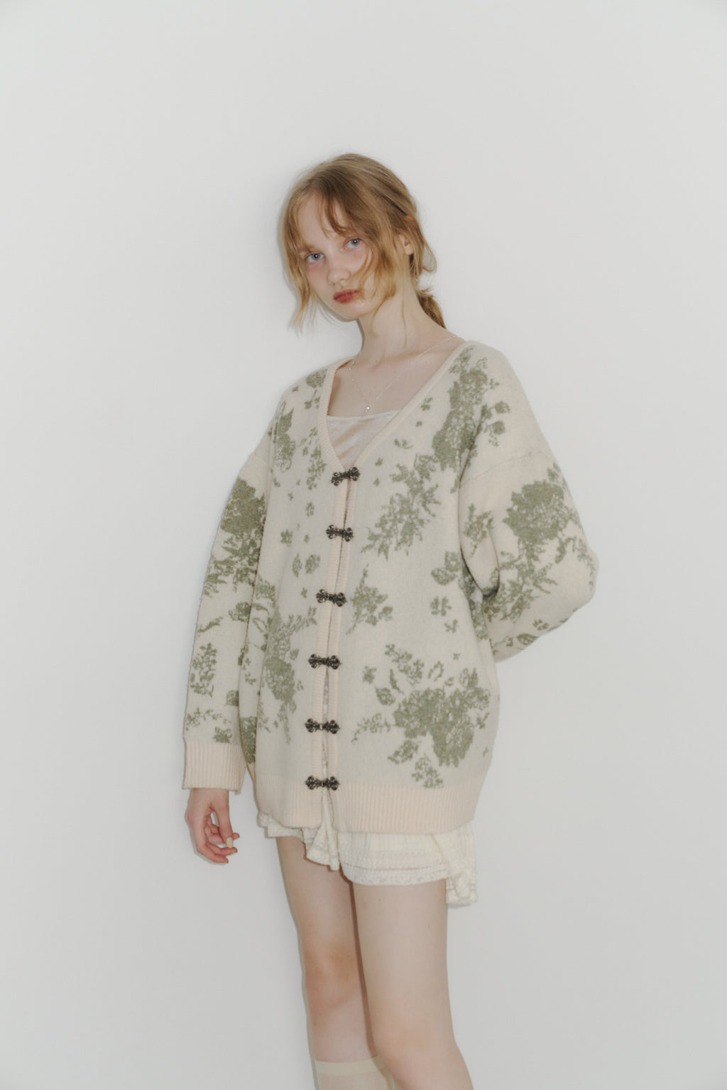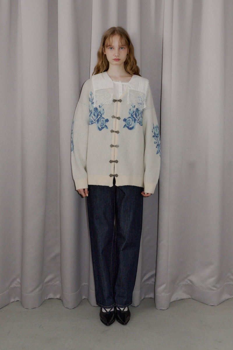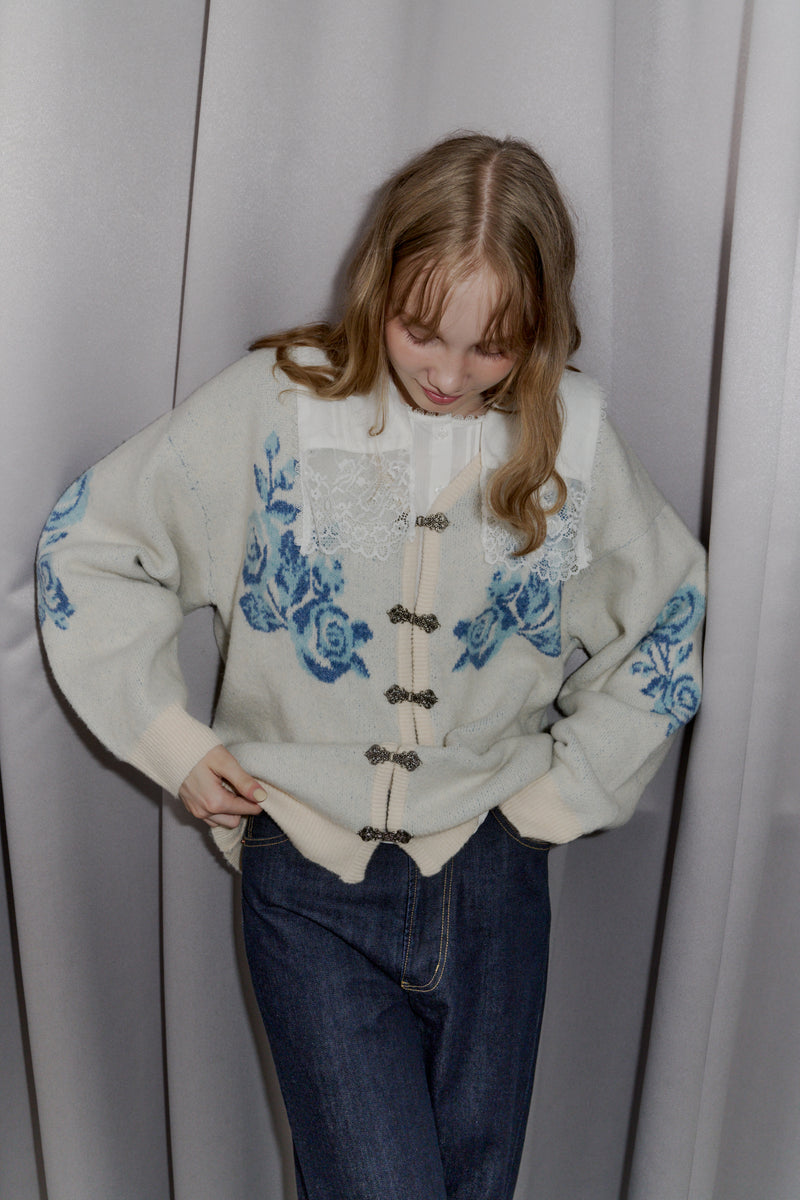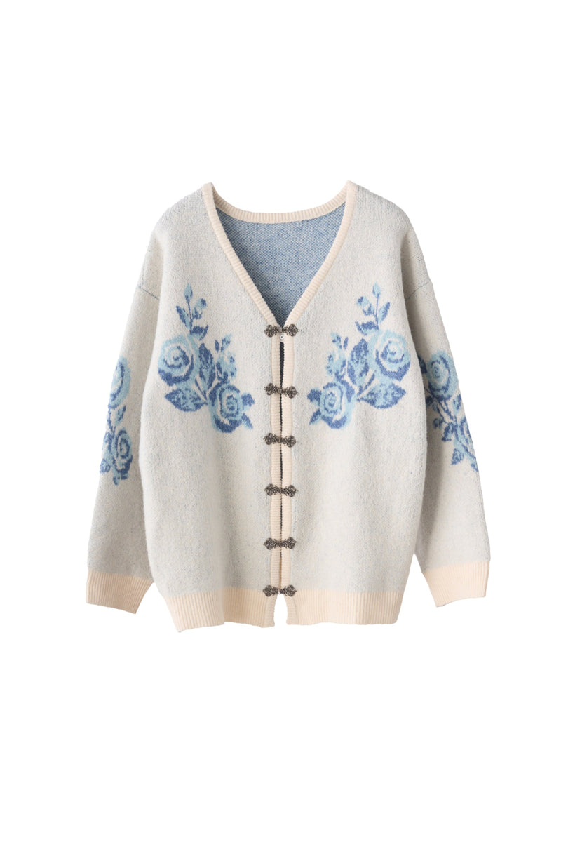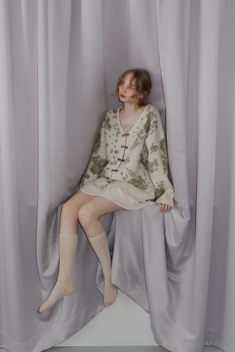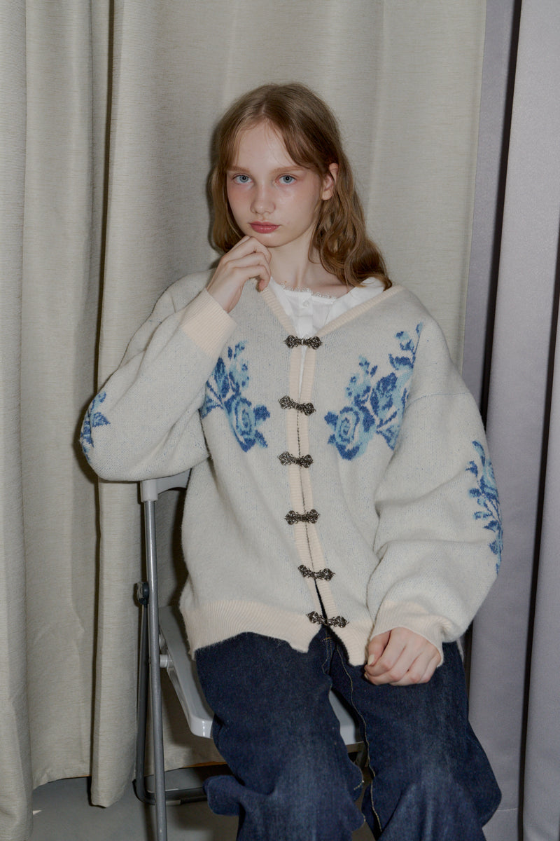 メタルフックと存在感のある花柄のニットカーディガンです。