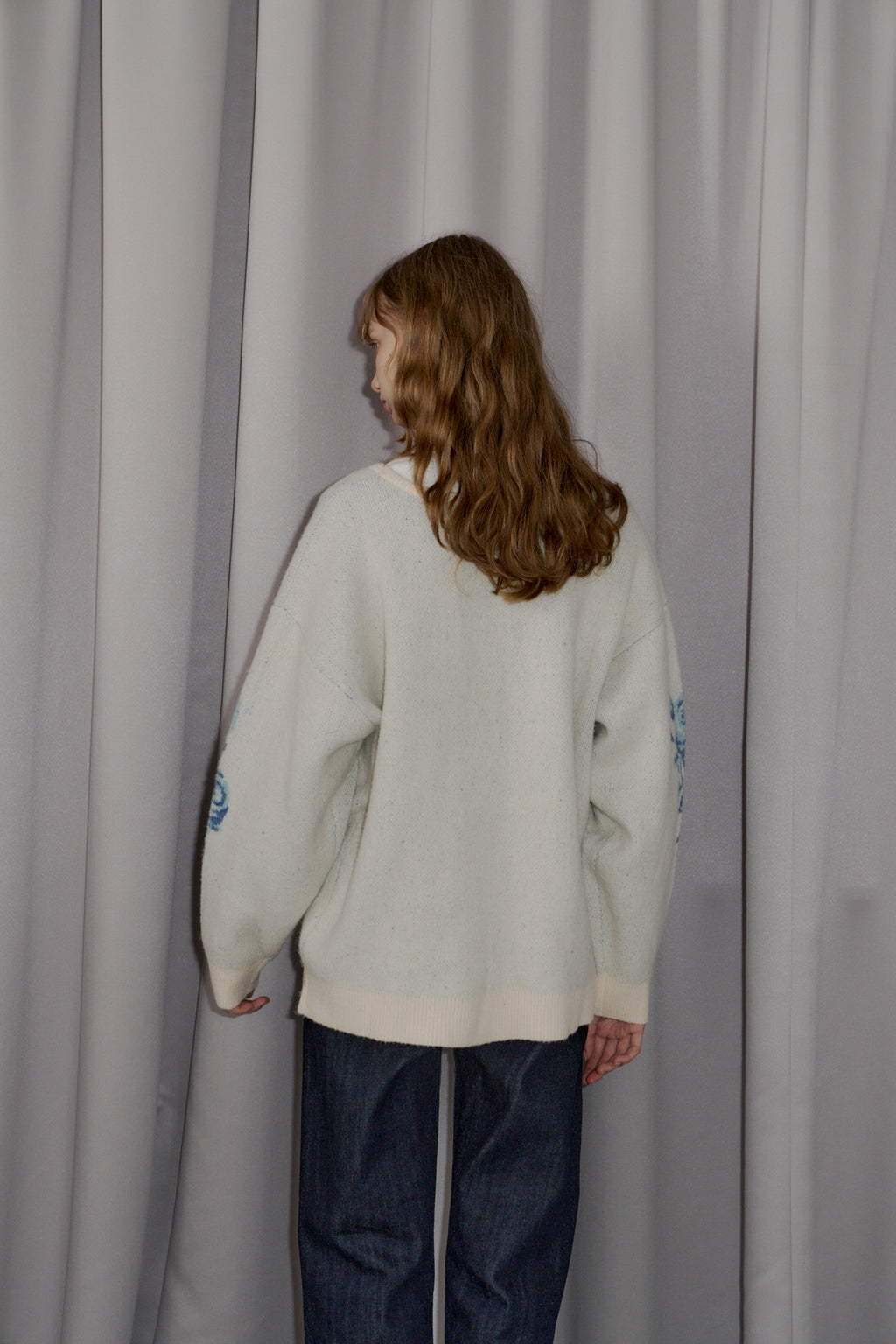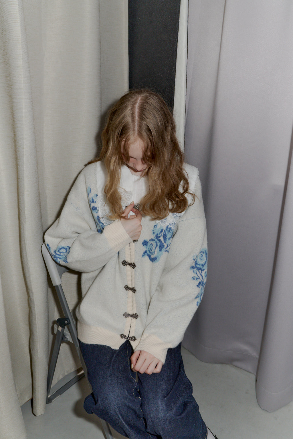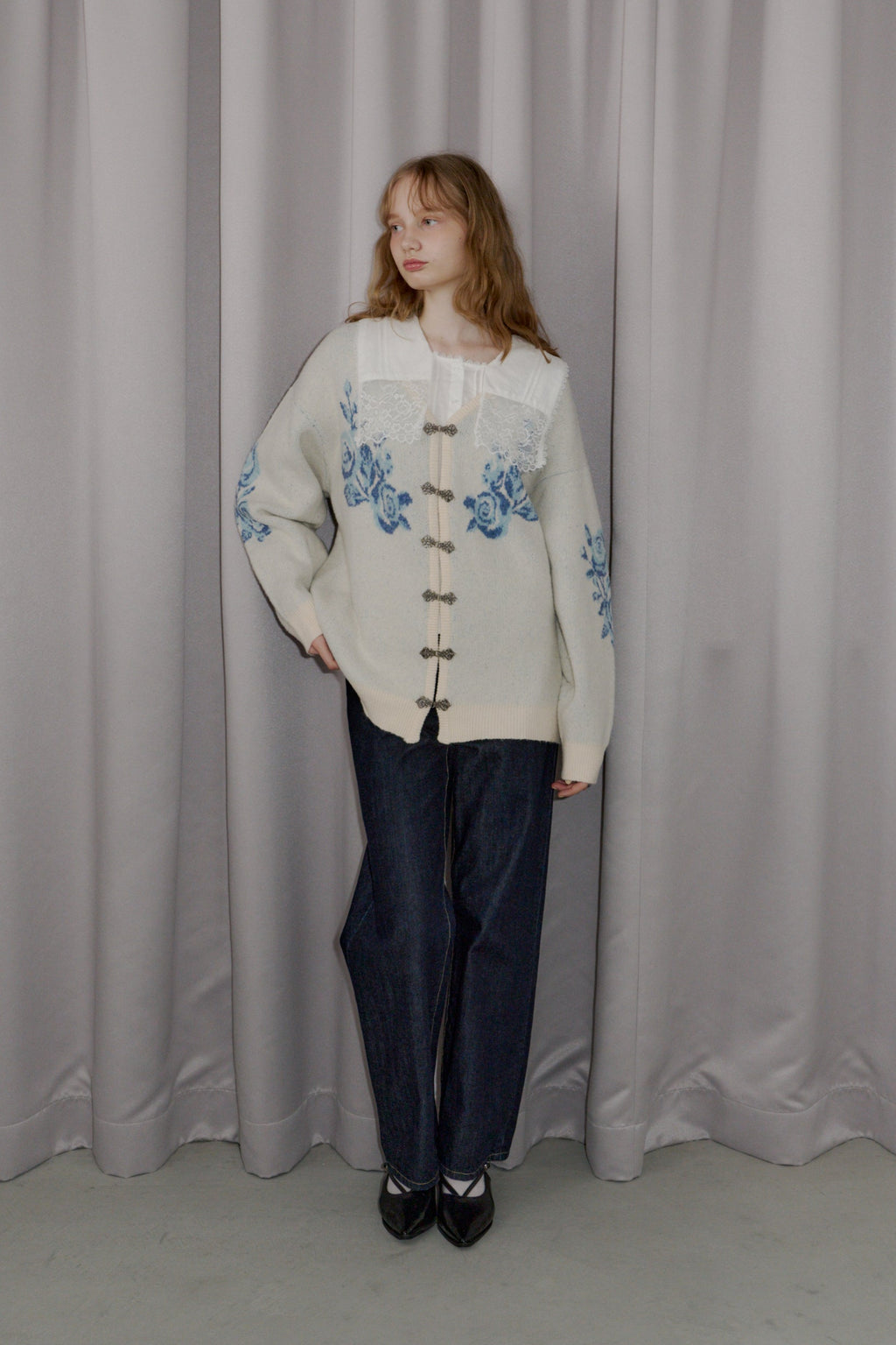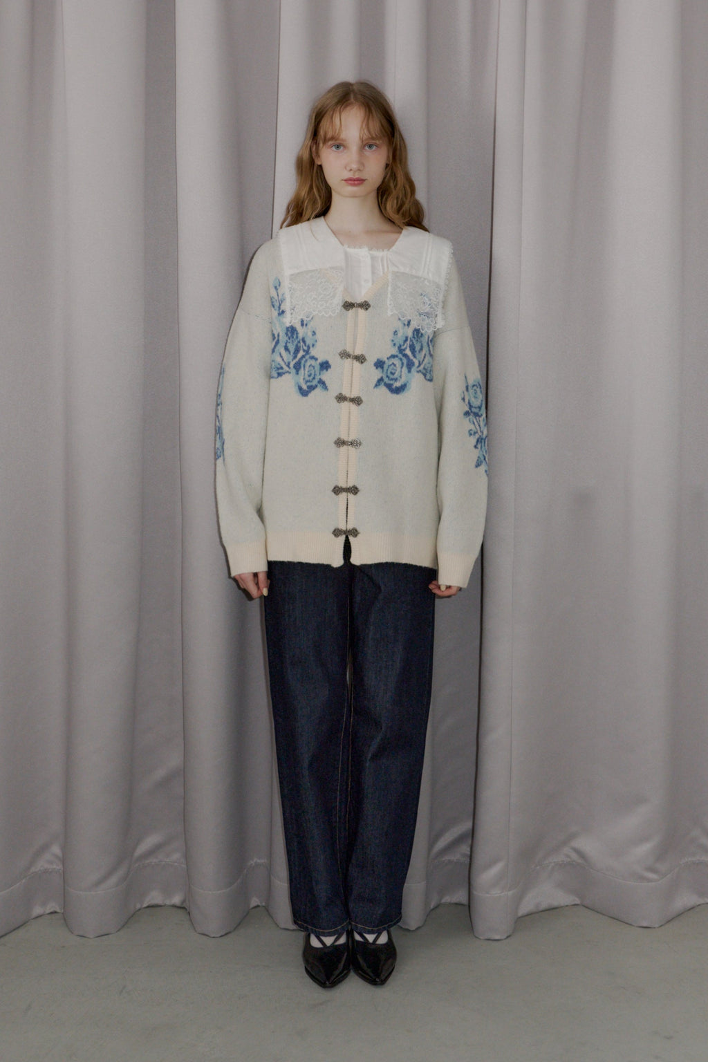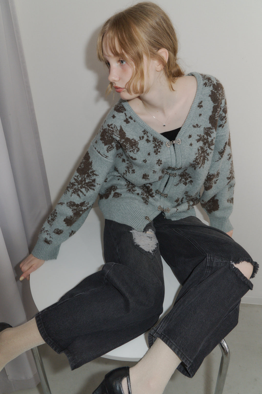 メタルフックと存在感のある花柄のニットカーディガンです。