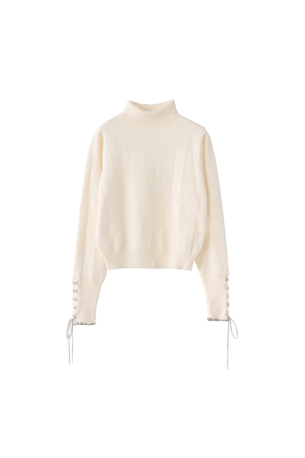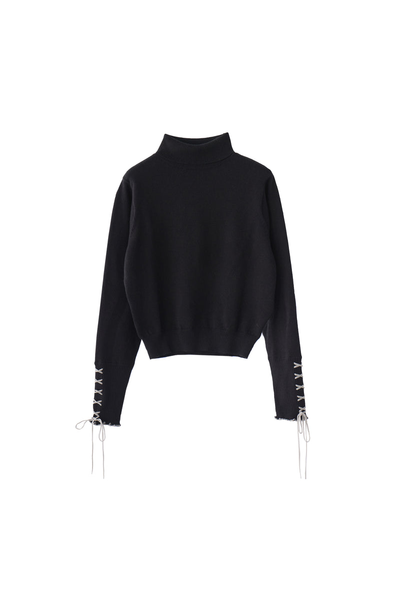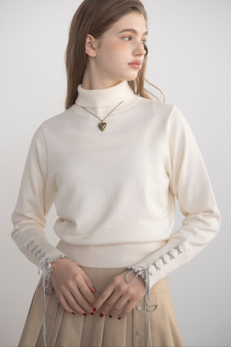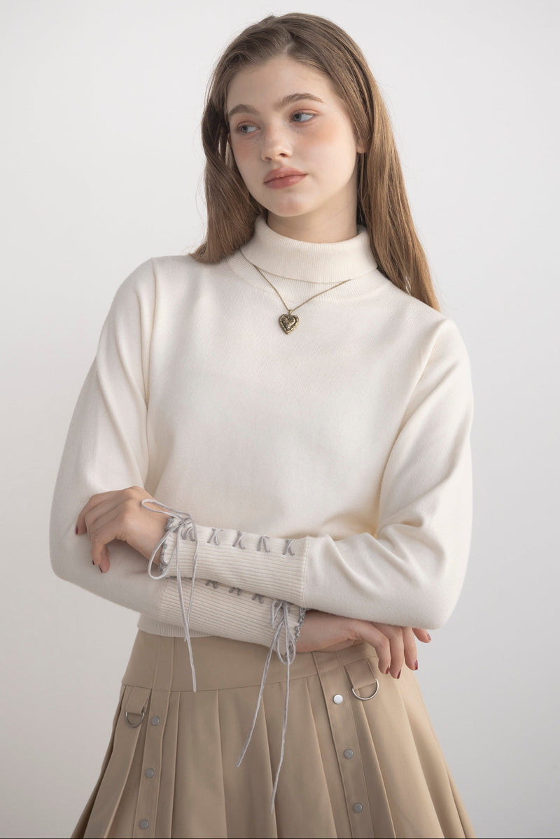 袖口のレースアップと配色メローが印象的なタートルネックニット。