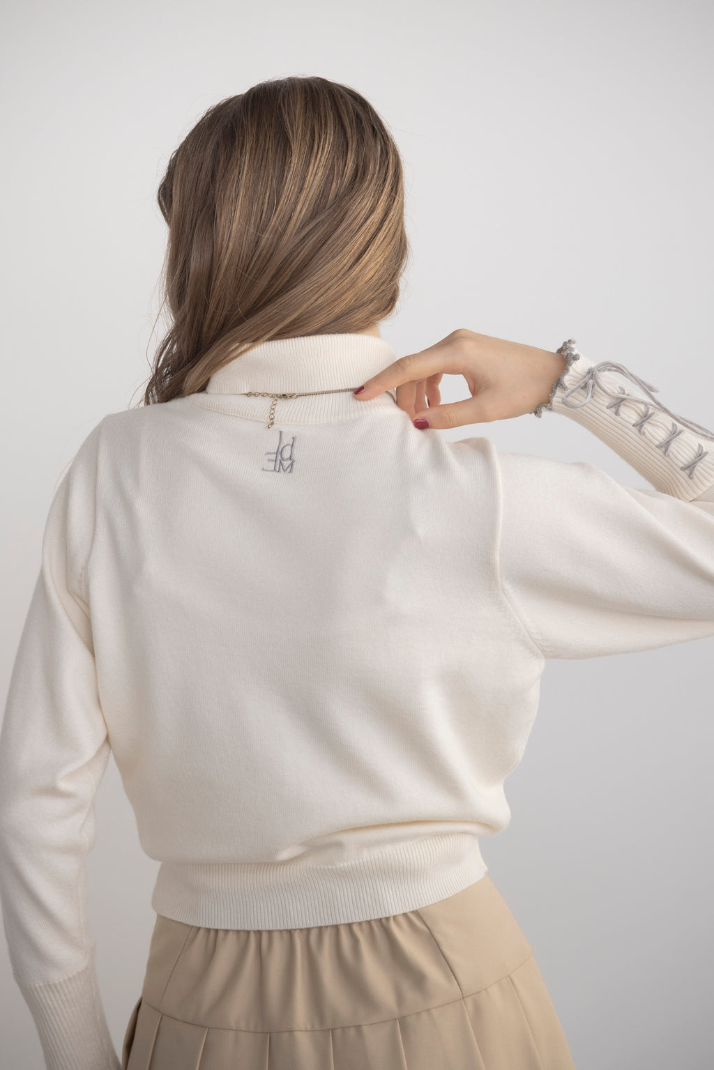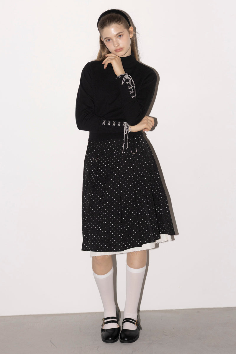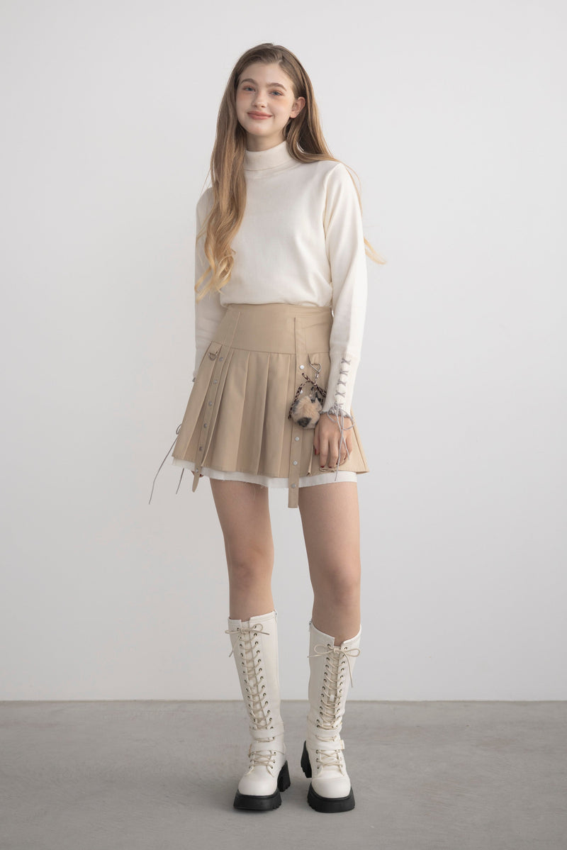 袖口のレースアップと配色メローが印象的なタートルネックニット。