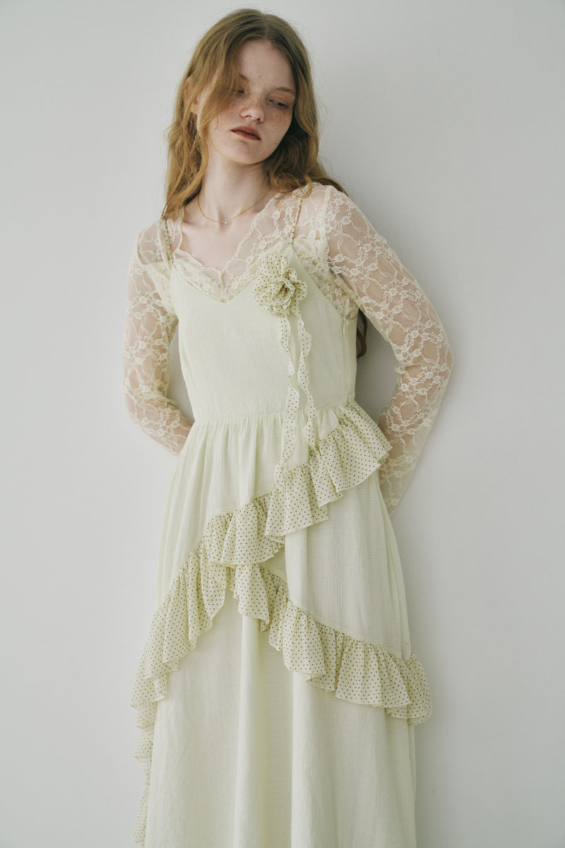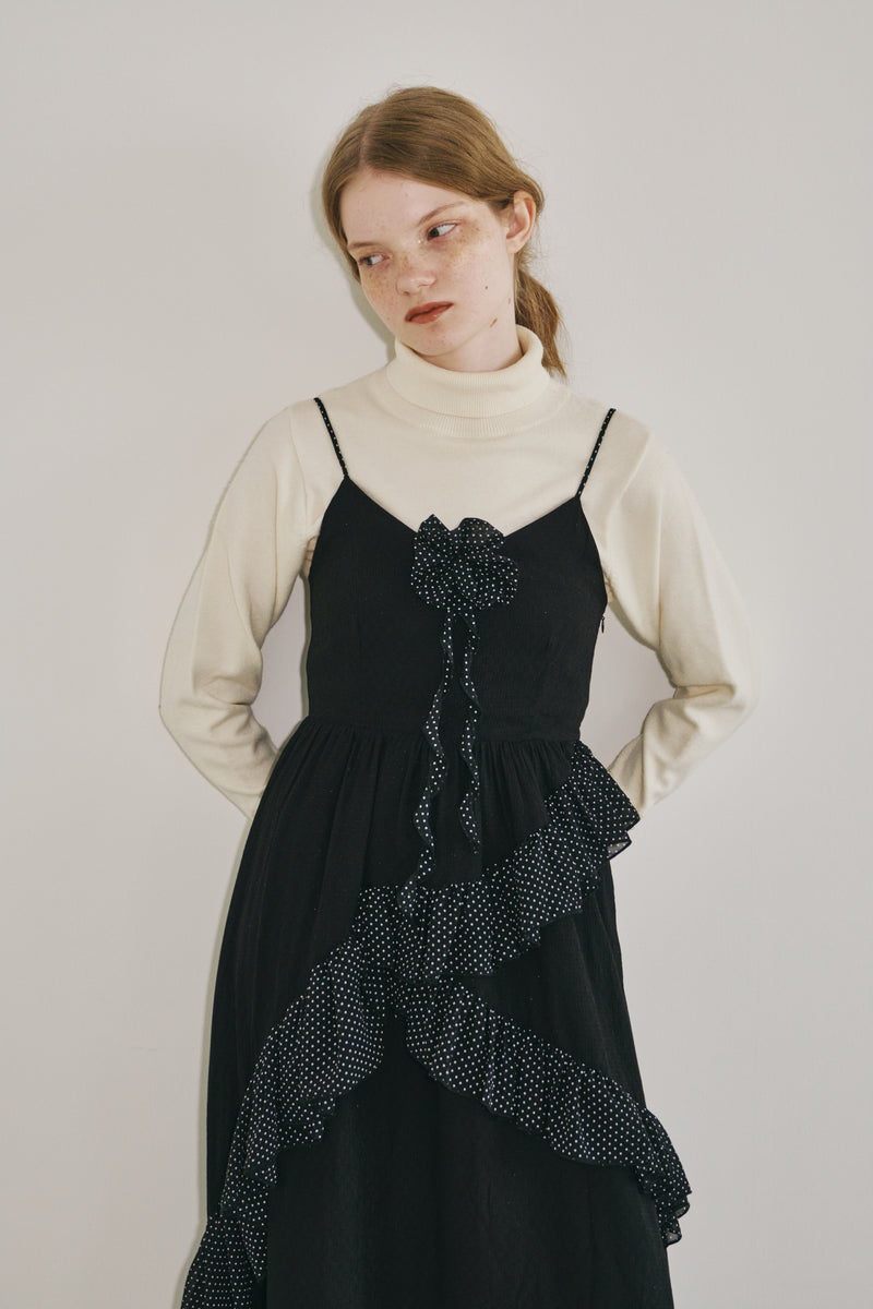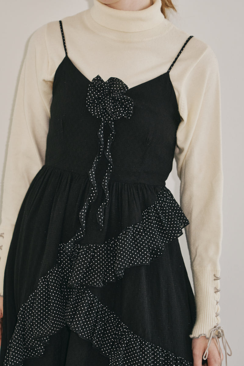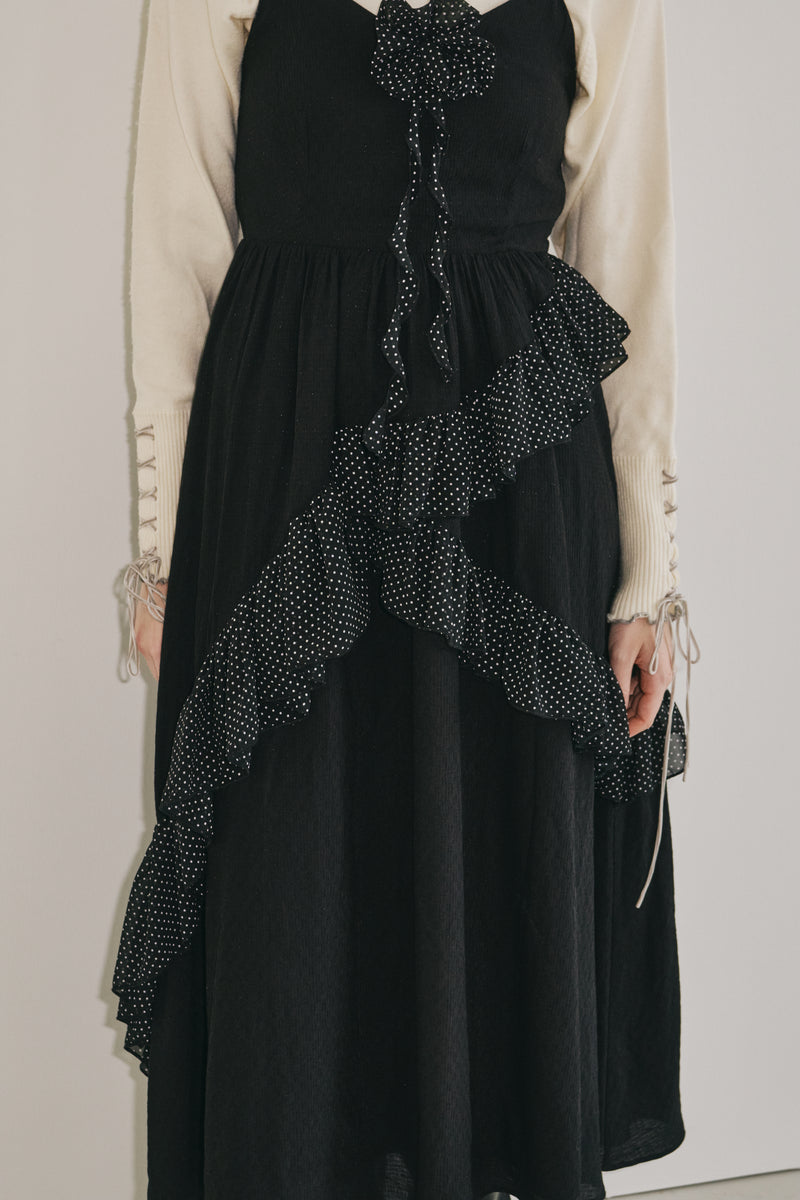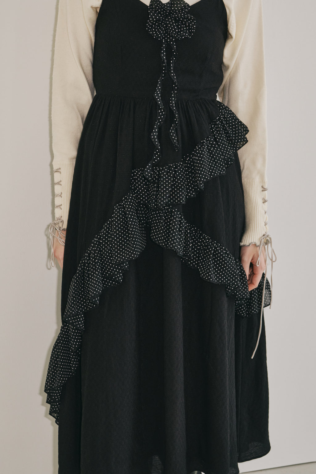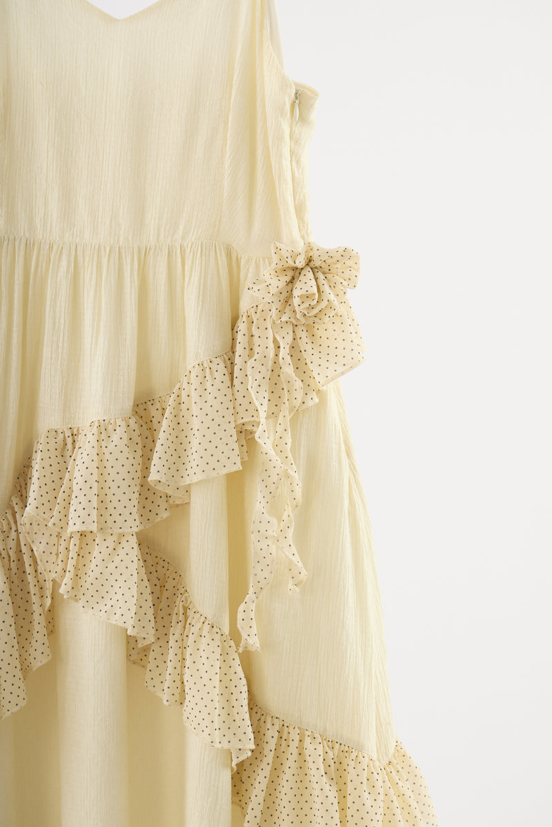 表面感のあるワッシャー生地にドット柄フリルをドッキングし、動きのある華やかなデザインをプラス。