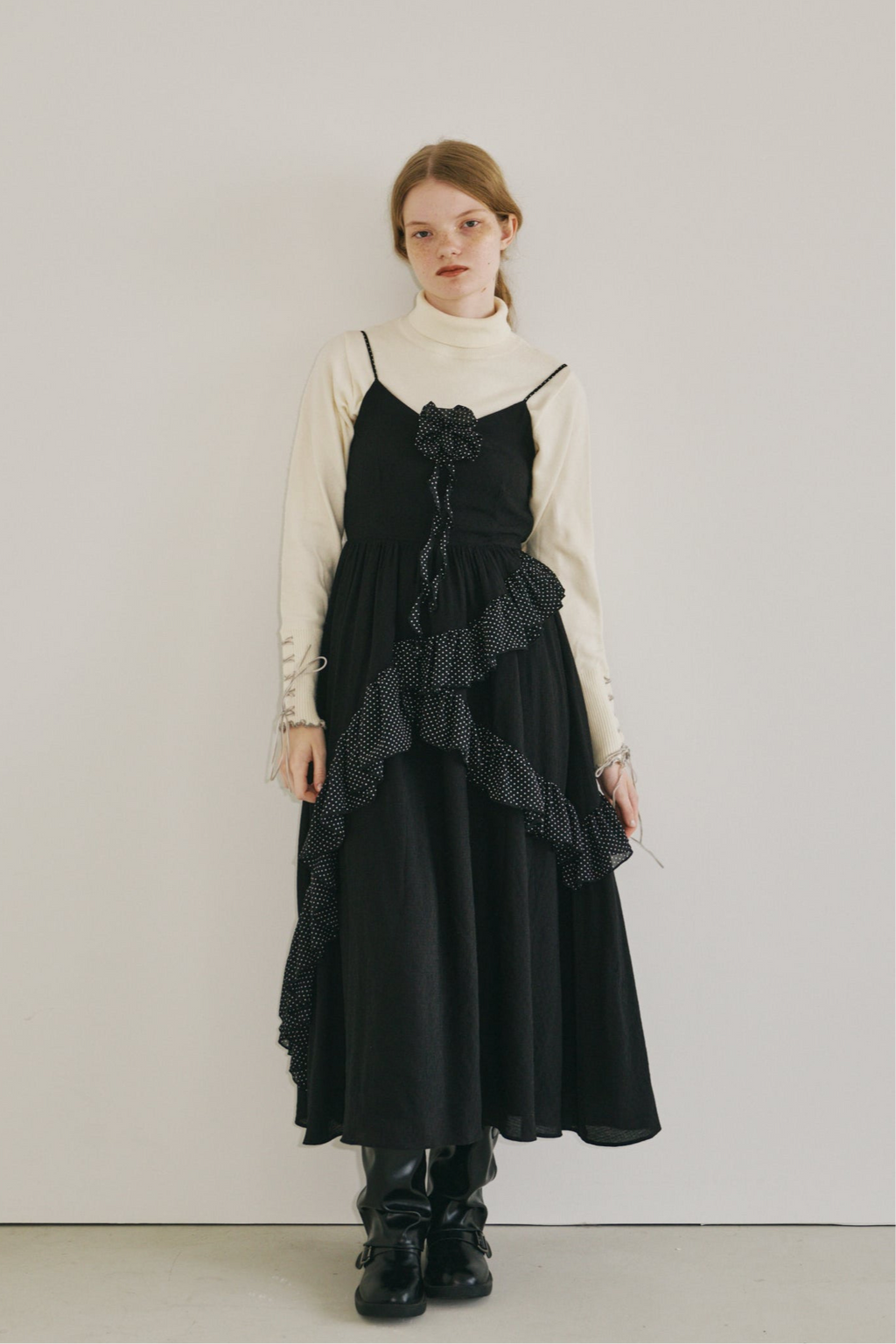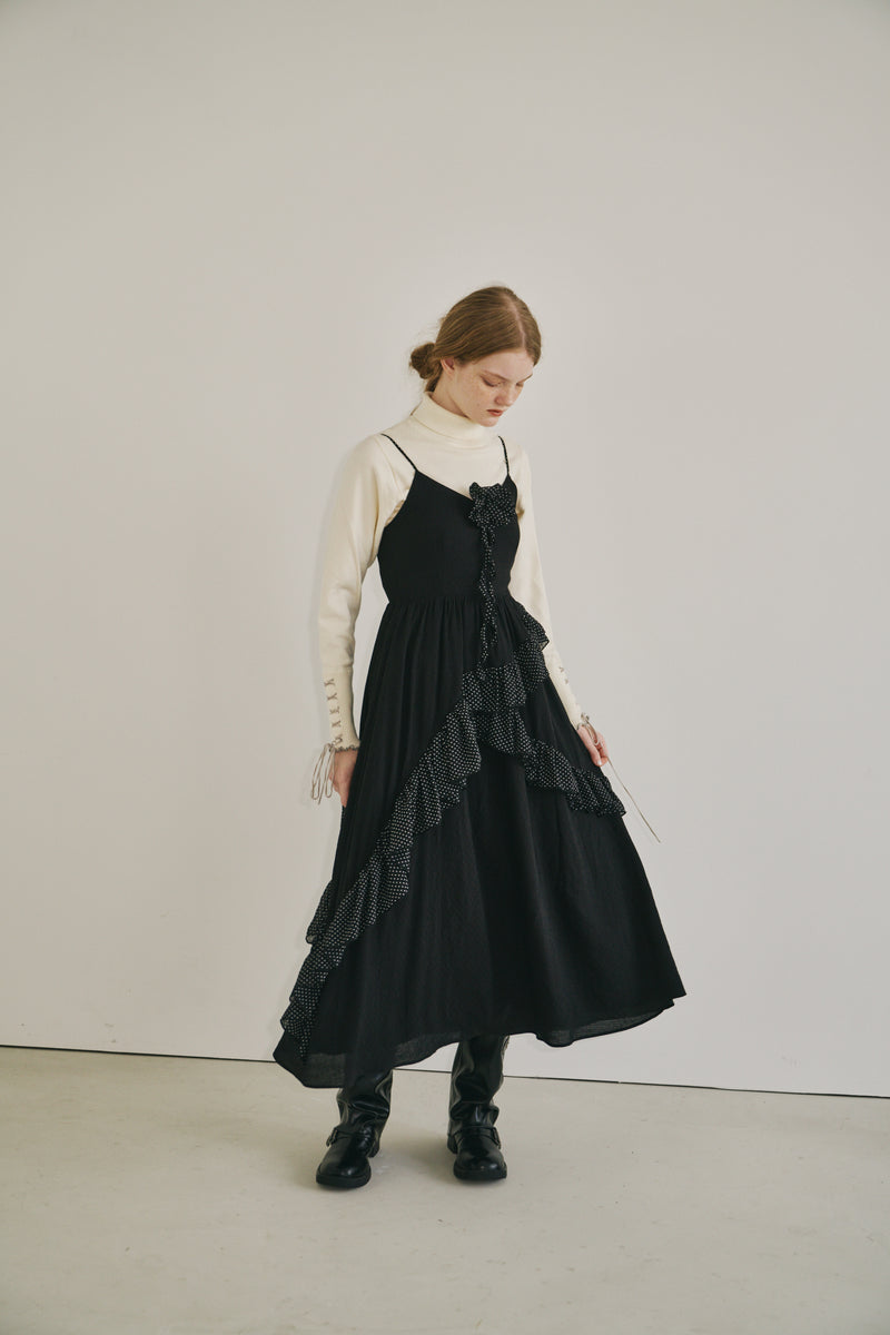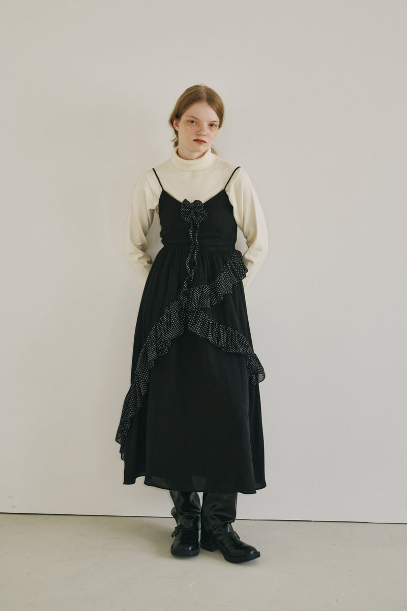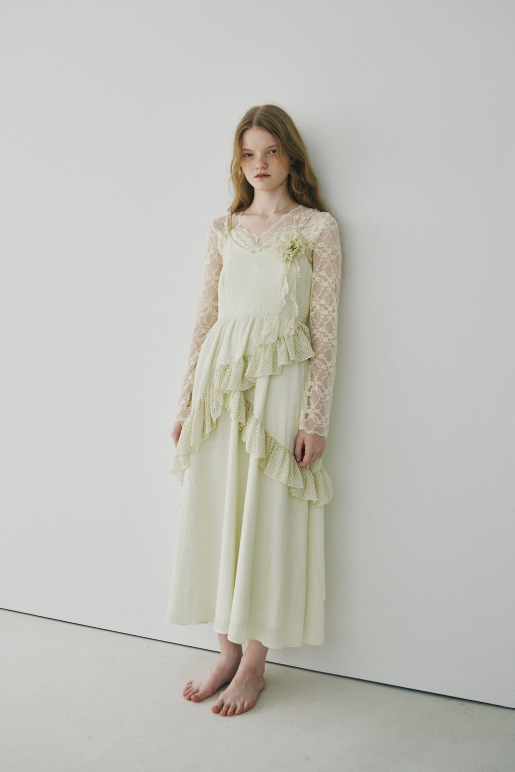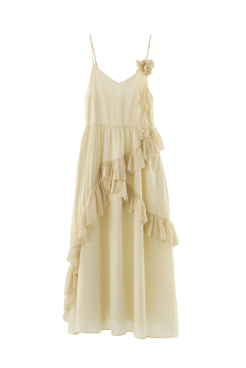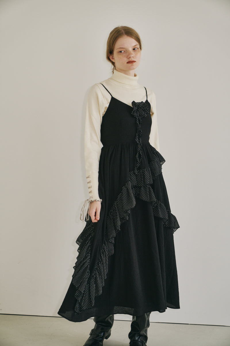 表面感のあるワッシャー生地にドット柄フリルをドッキングし、動きのある華やかなデザインをプラス。