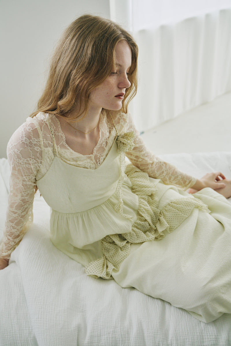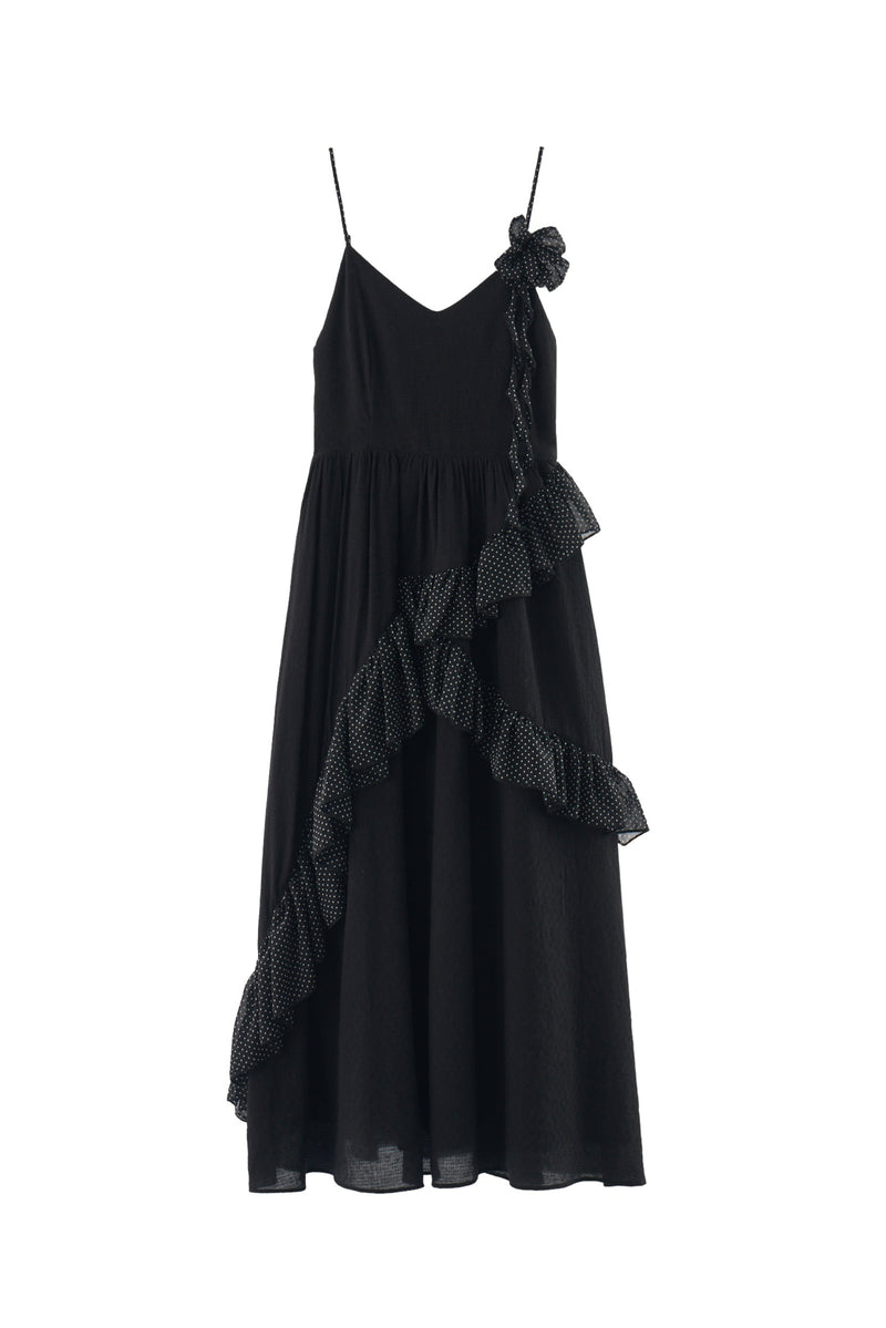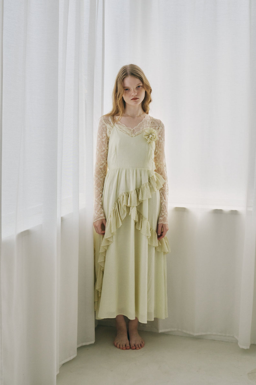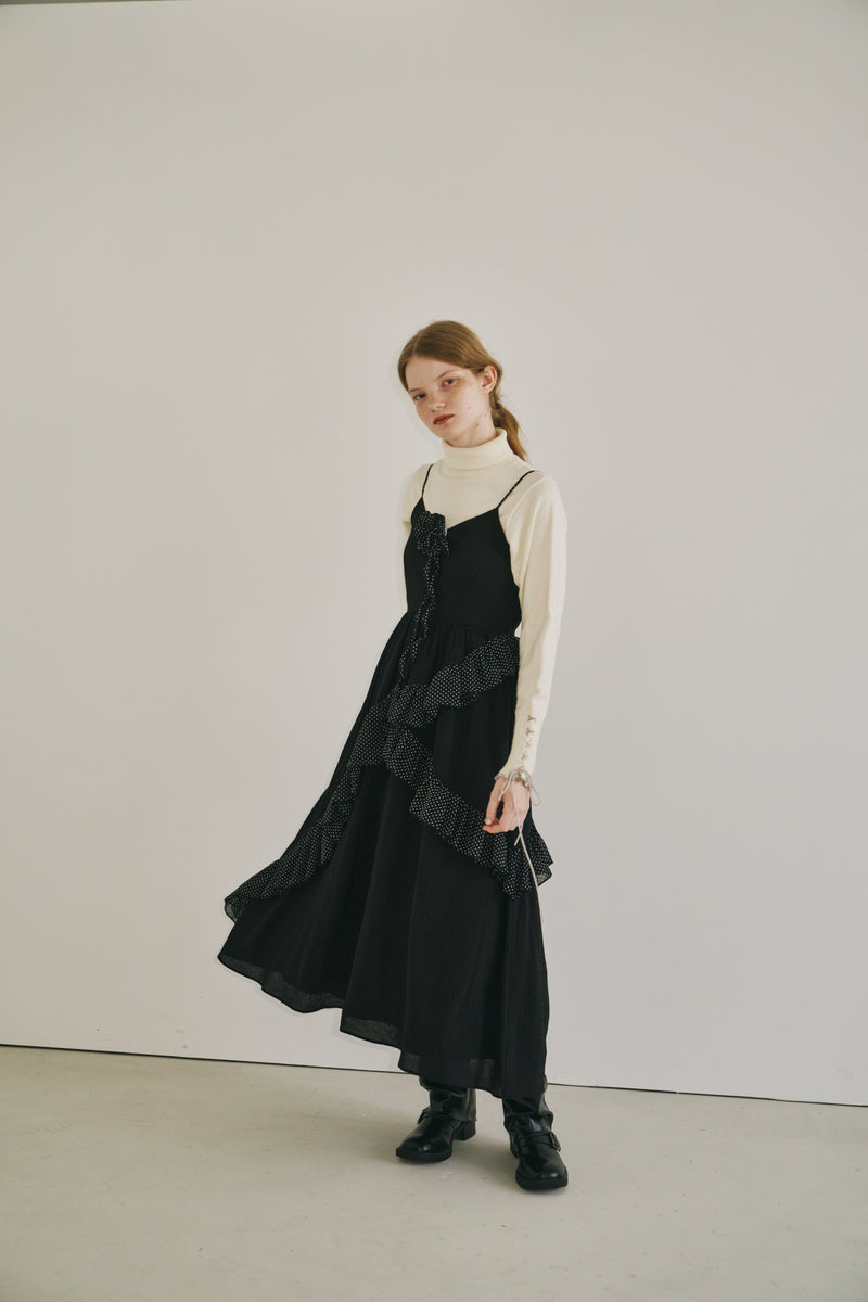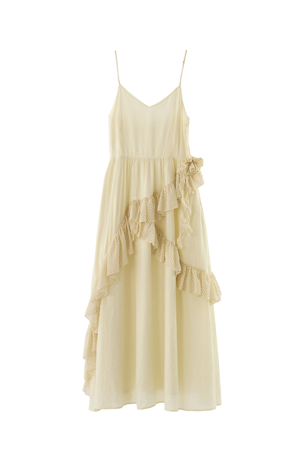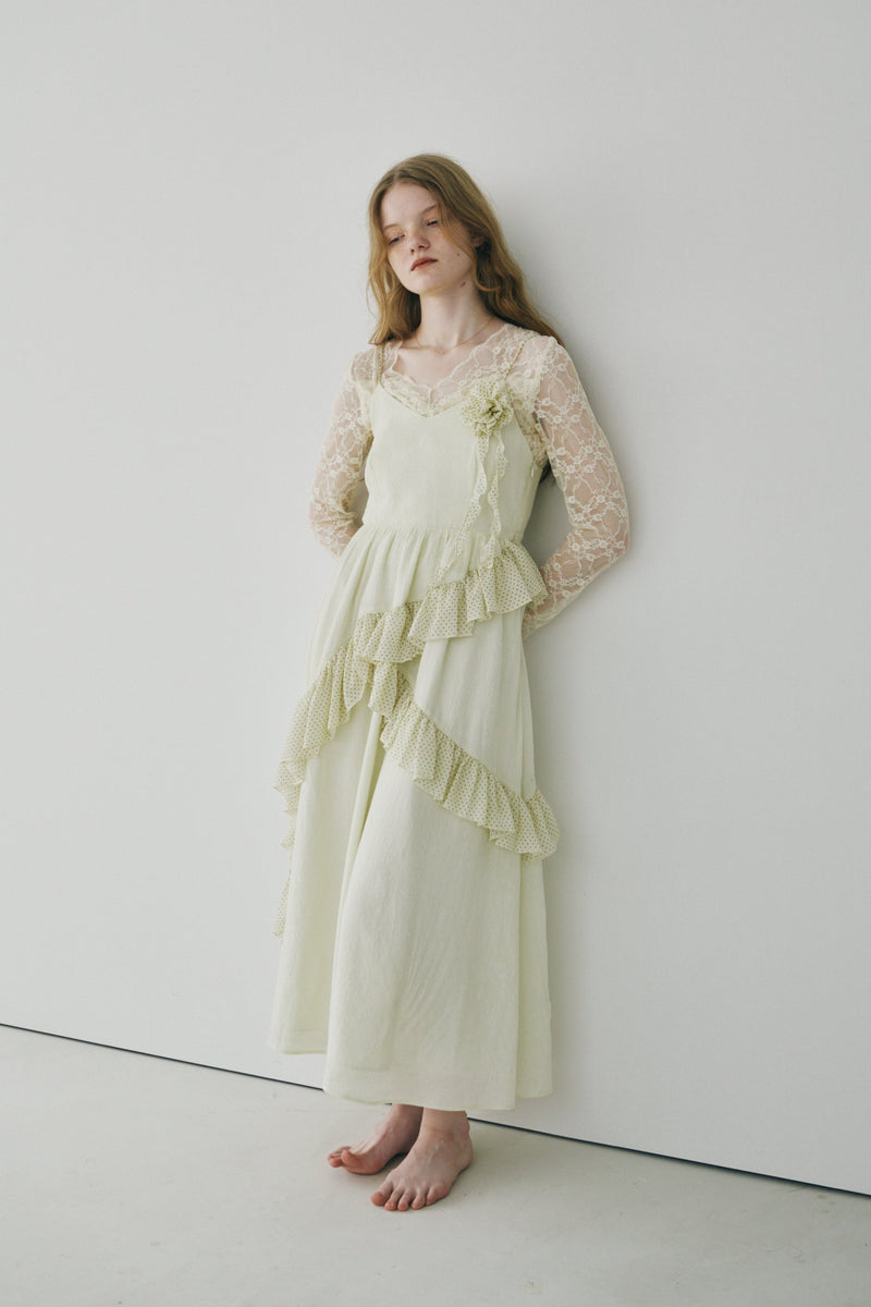 表面感のあるワッシャー生地にドット柄フリルをドッキングし、動きのある華やかなデザインをプラス。