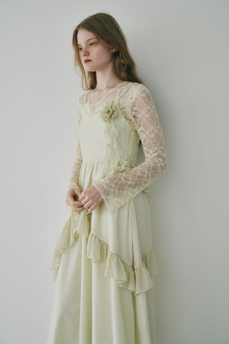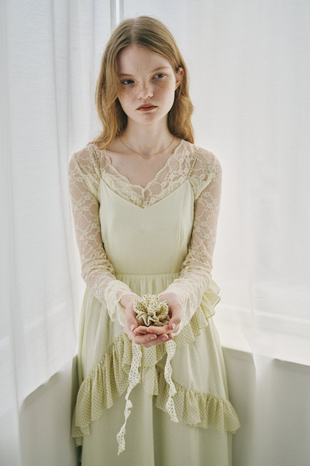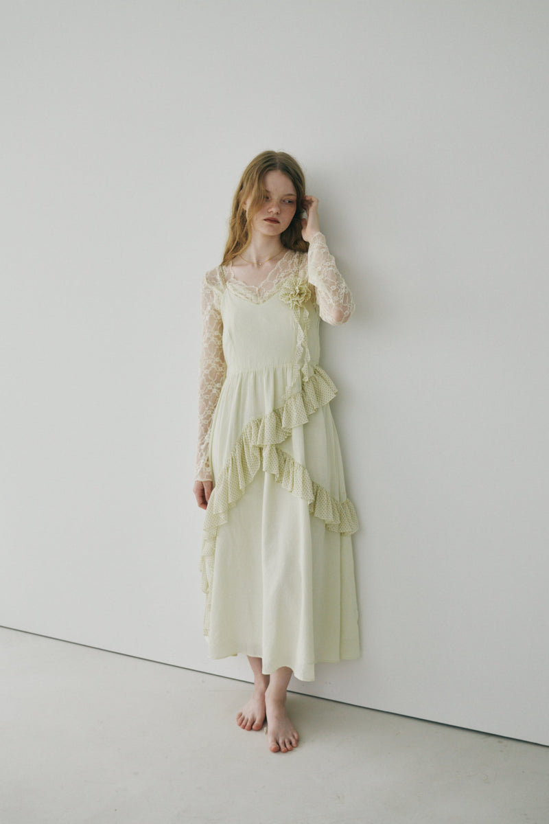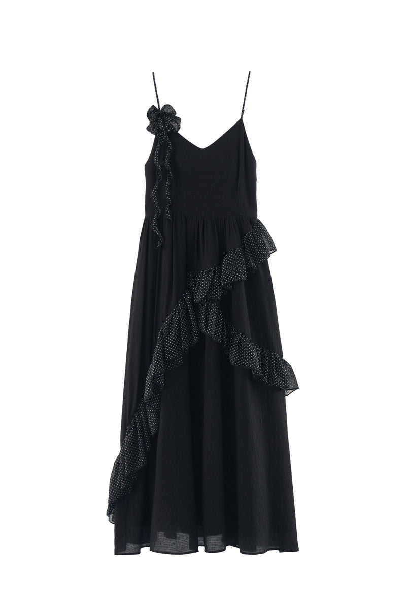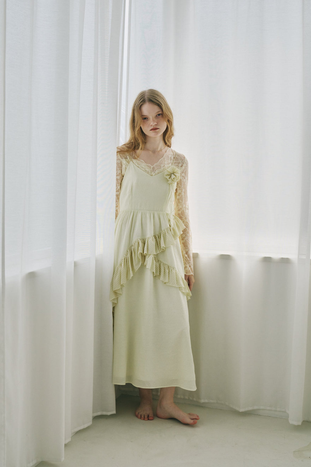 表面感のあるワッシャー生地にドット柄フリルをドッキングし、動きのある華やかなデザインをプラス。