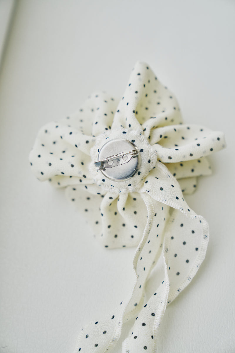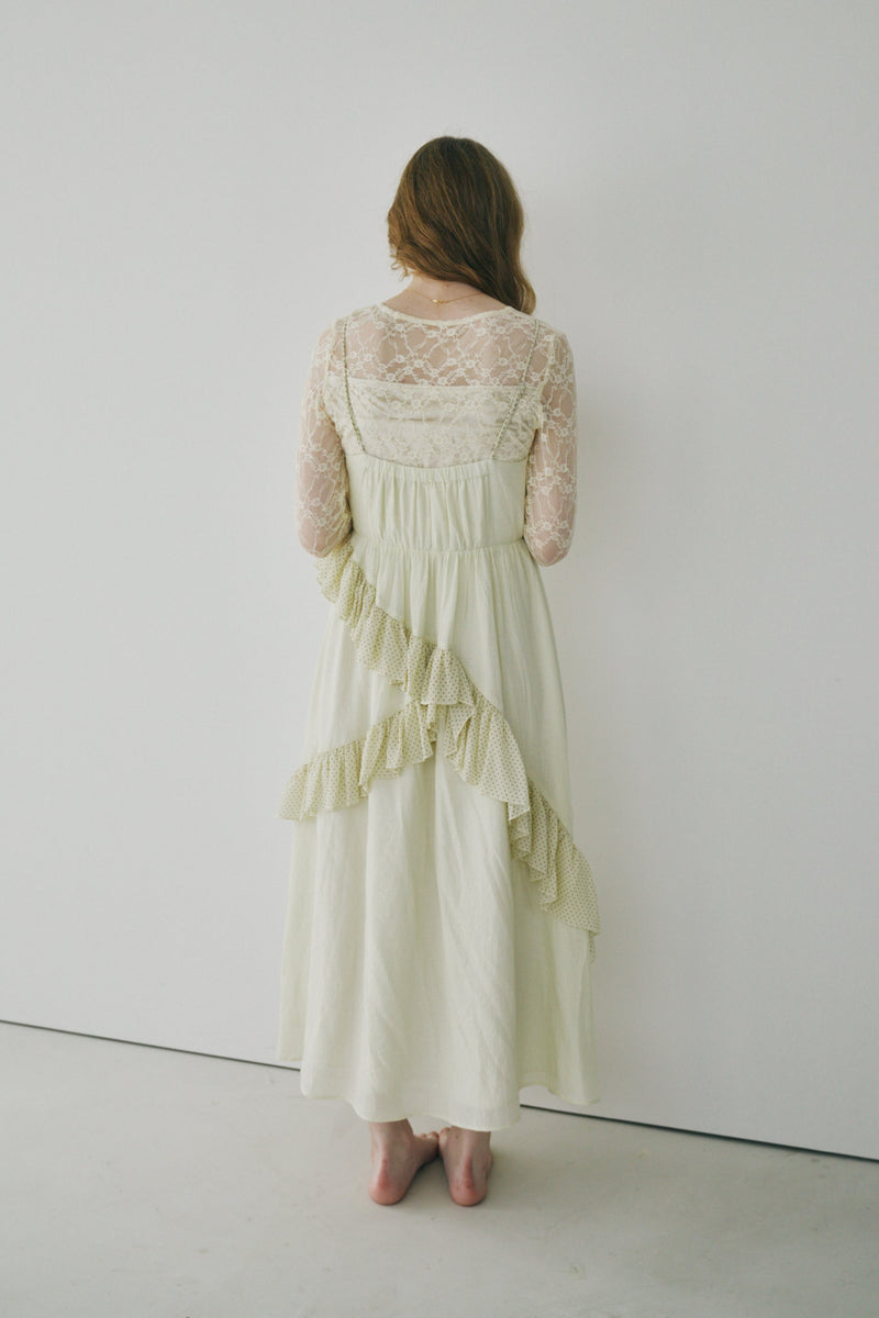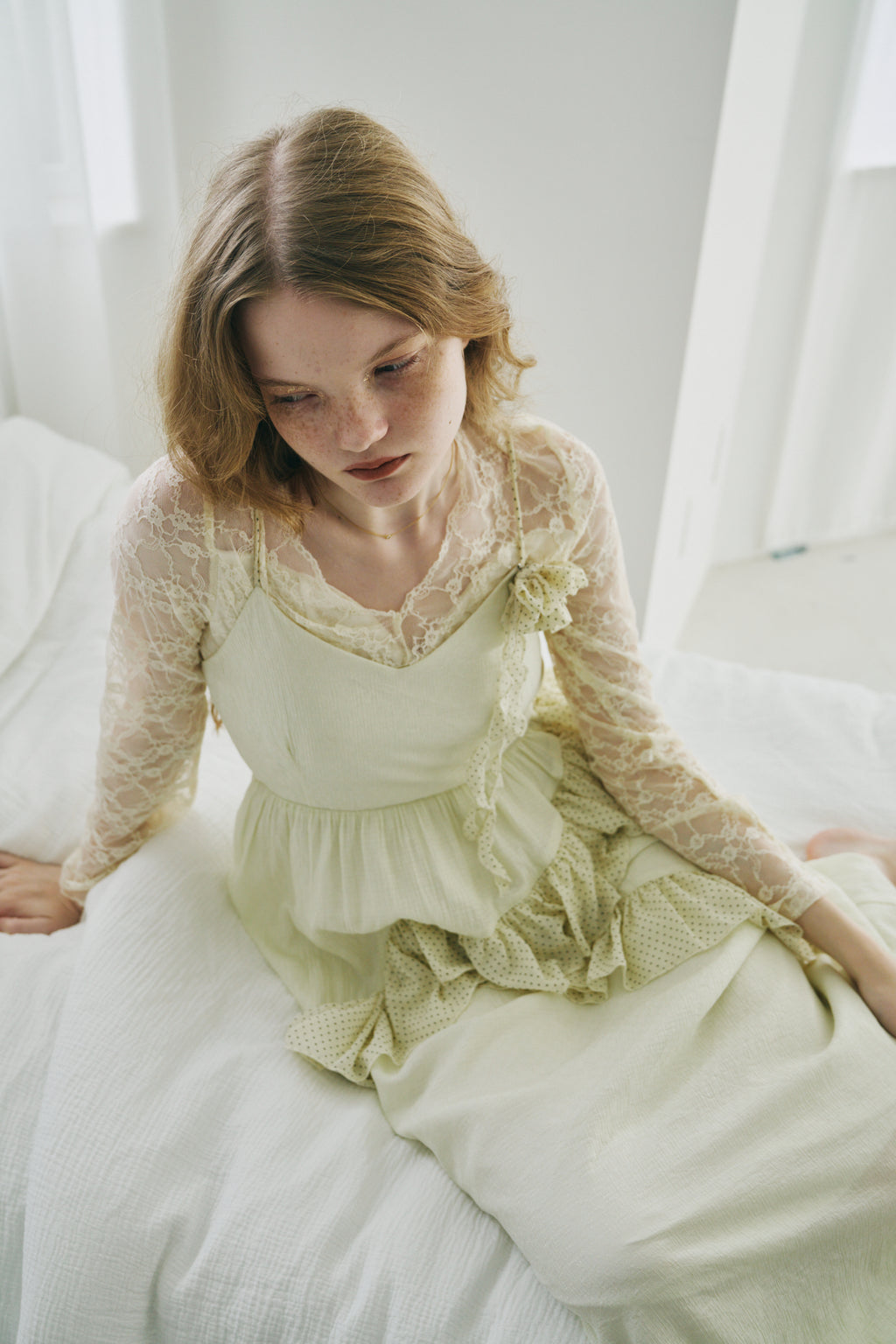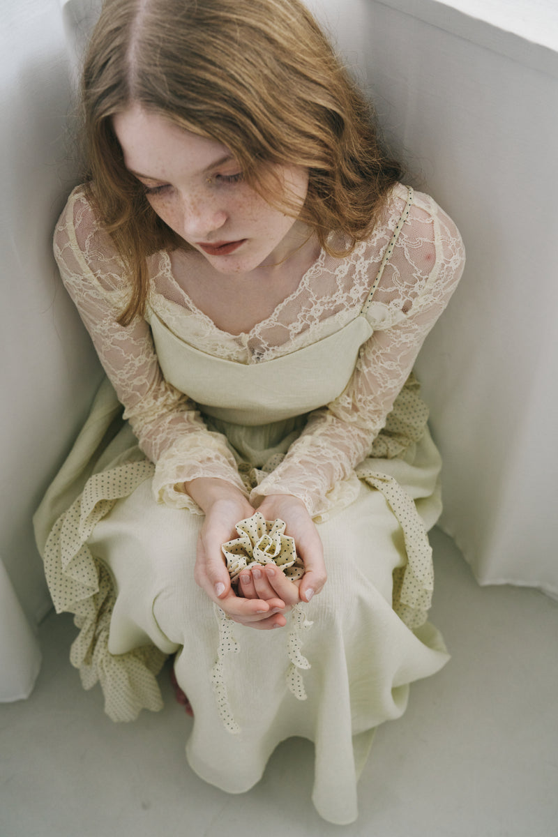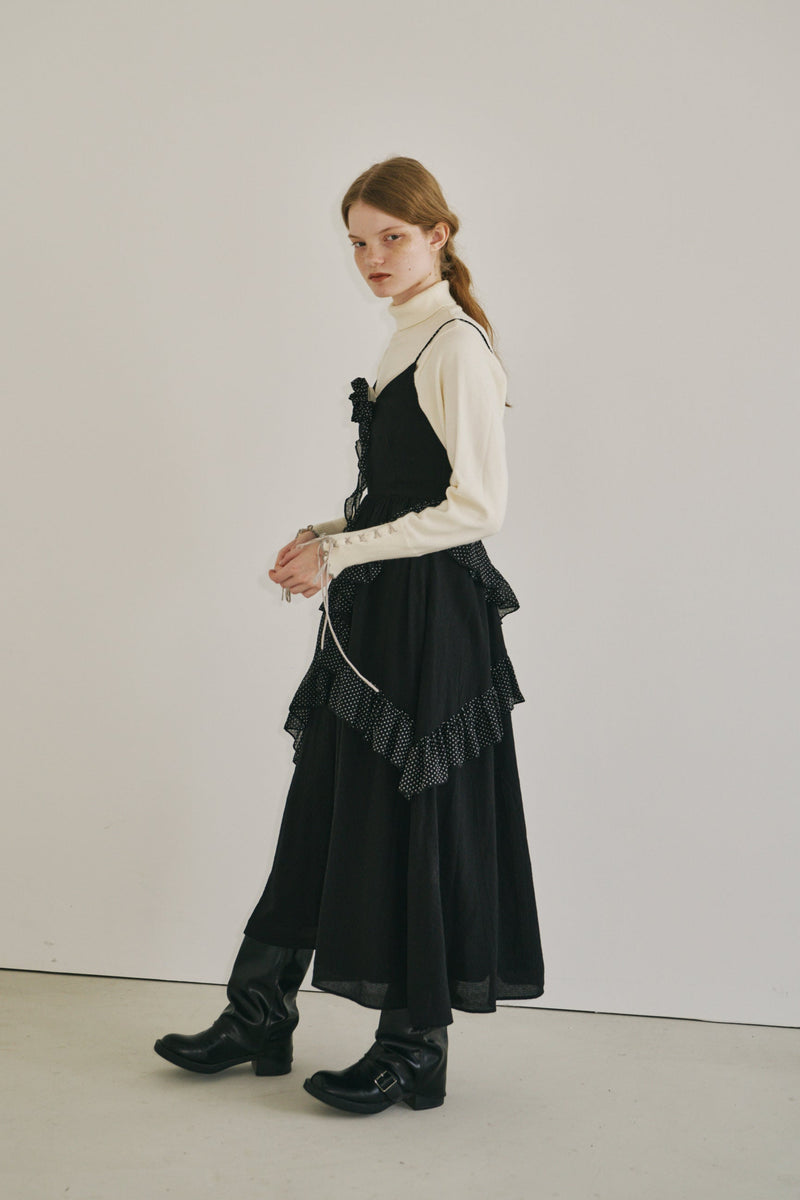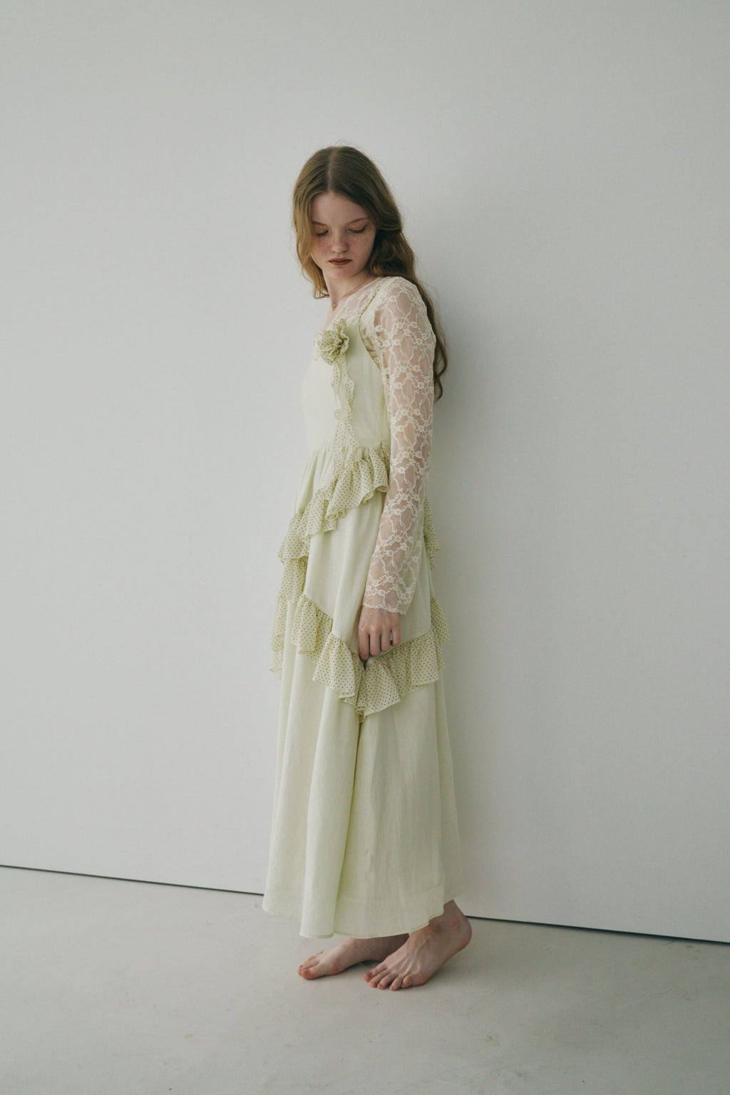 表面感のあるワッシャー生地にドット柄フリルをドッキングし、動きのある華やかなデザインをプラス。