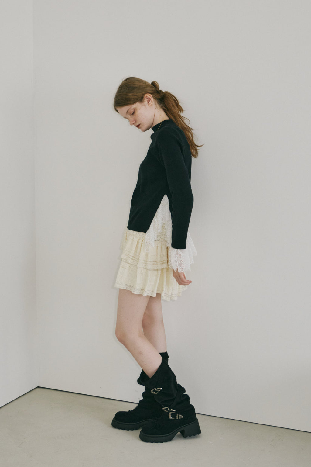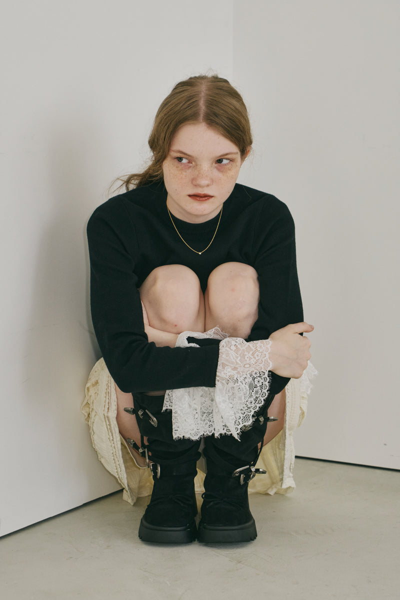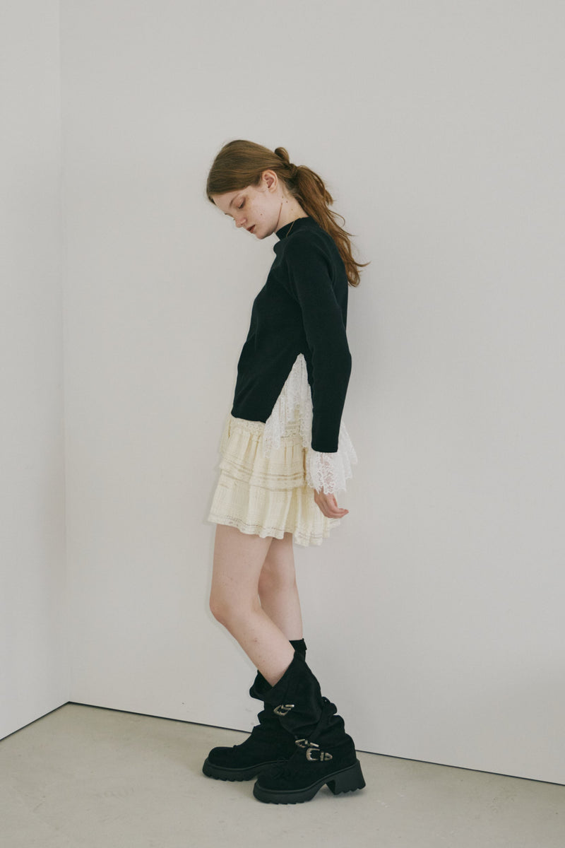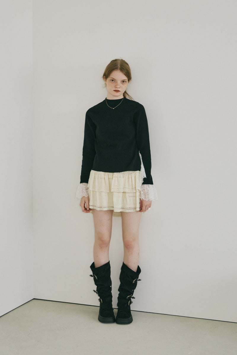 シンプルなタートルネックに袖口と裾から覗くレースを効かせた一枚。ロングシーズン頼れる万能ニットで、オン・オフ問わず幅広いスタイルにフィットします。