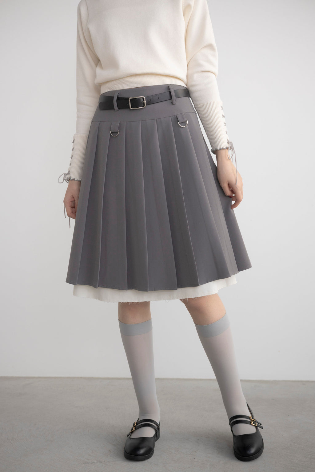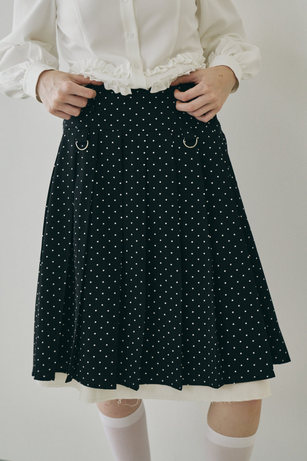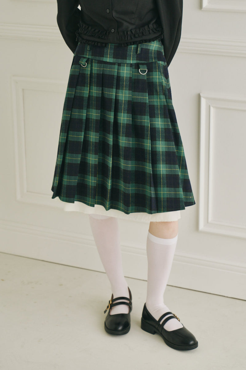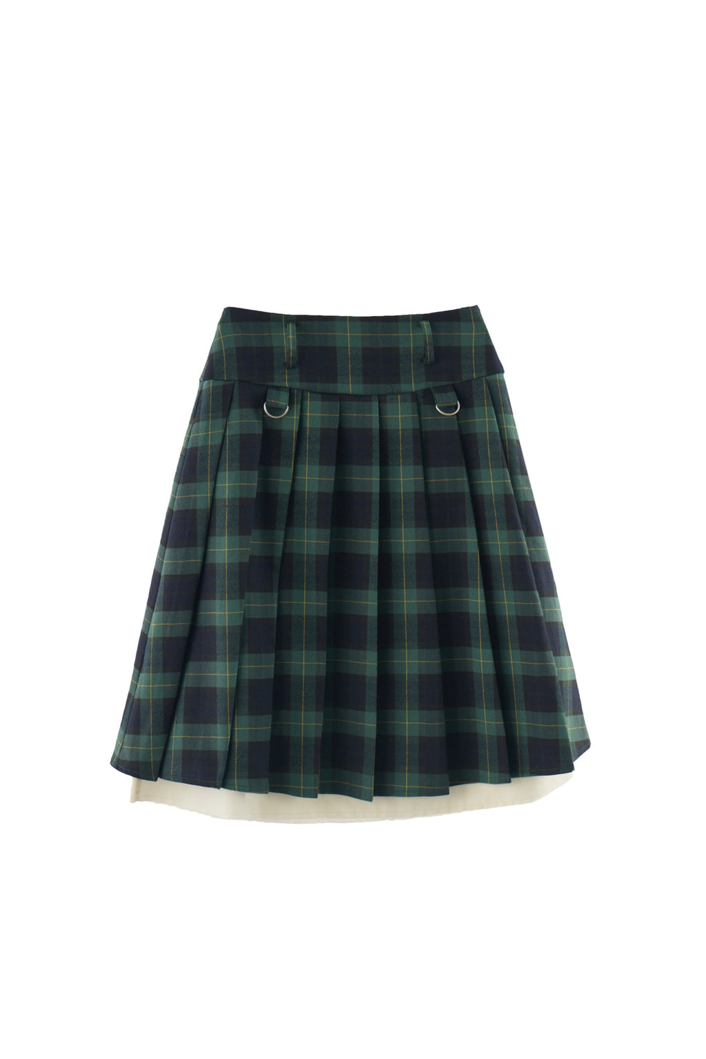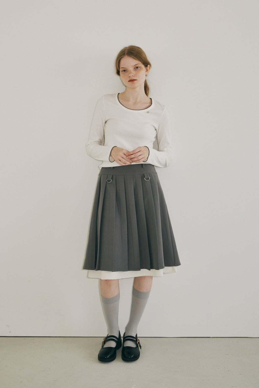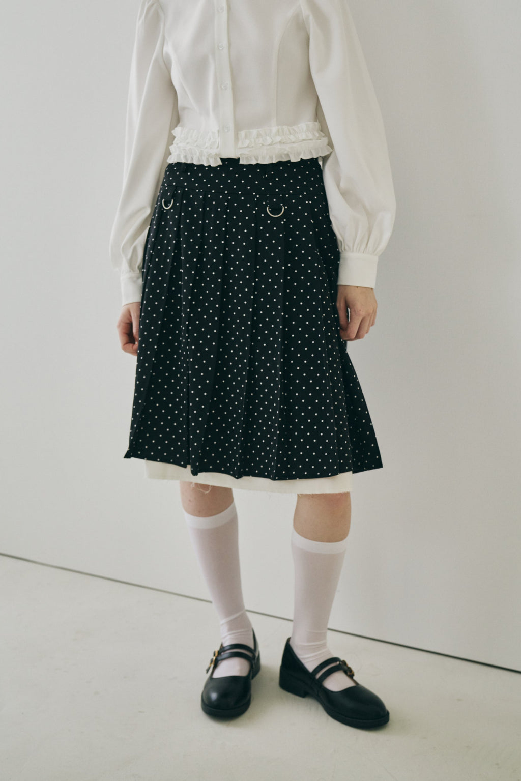プリーツとレイヤード風デザインが存在感を放つミディ丈スカート。