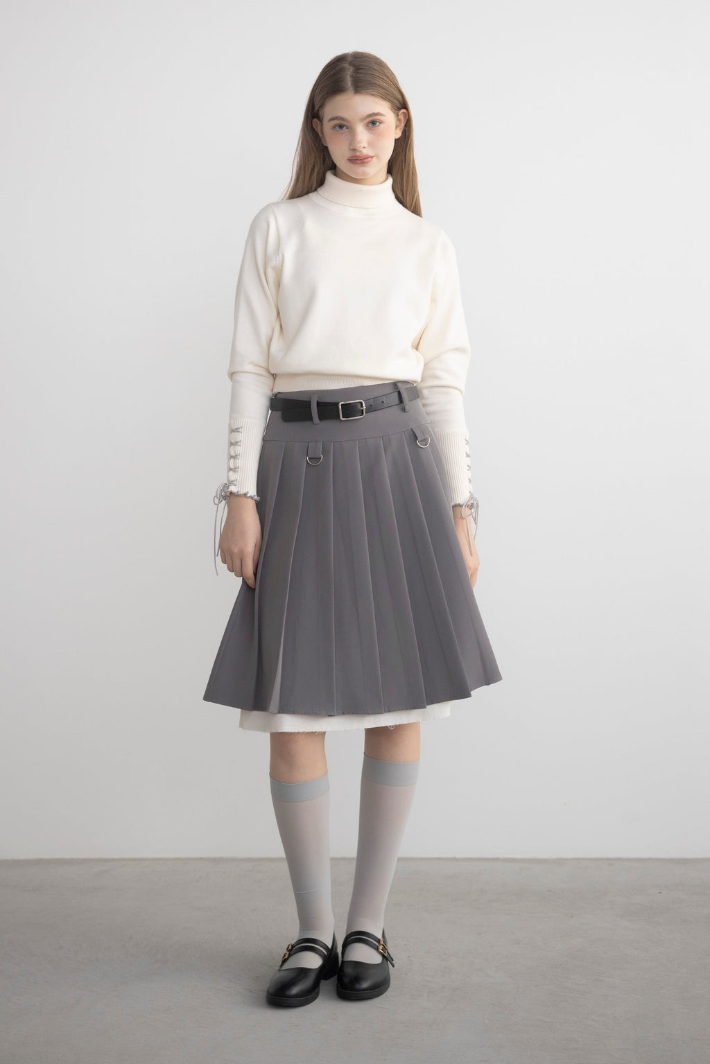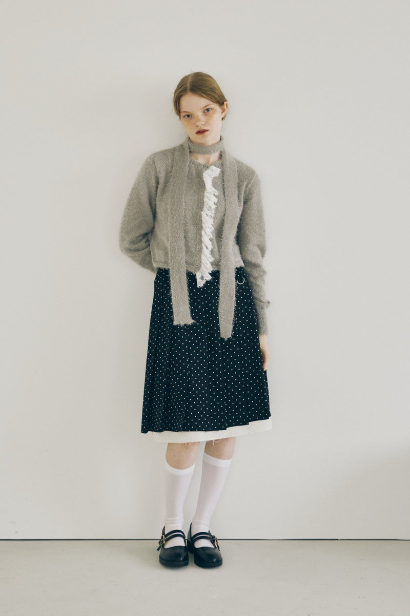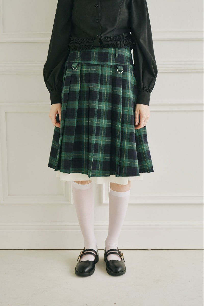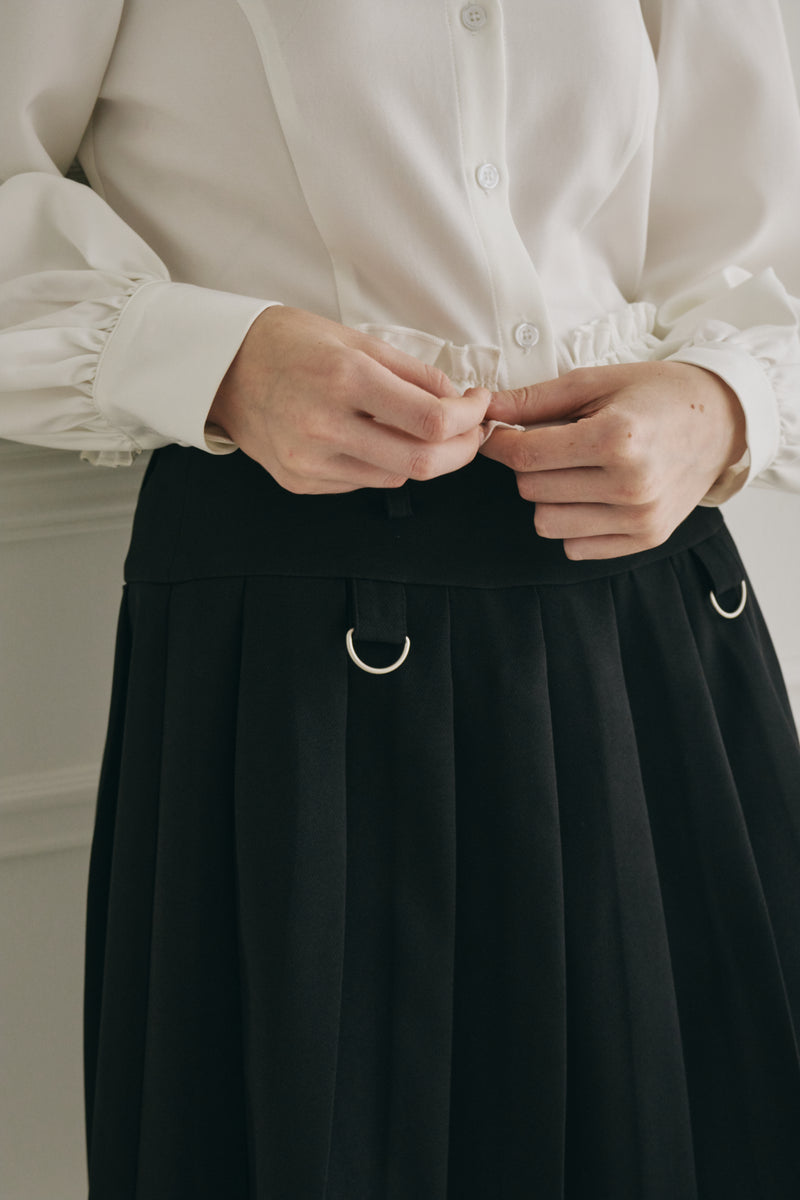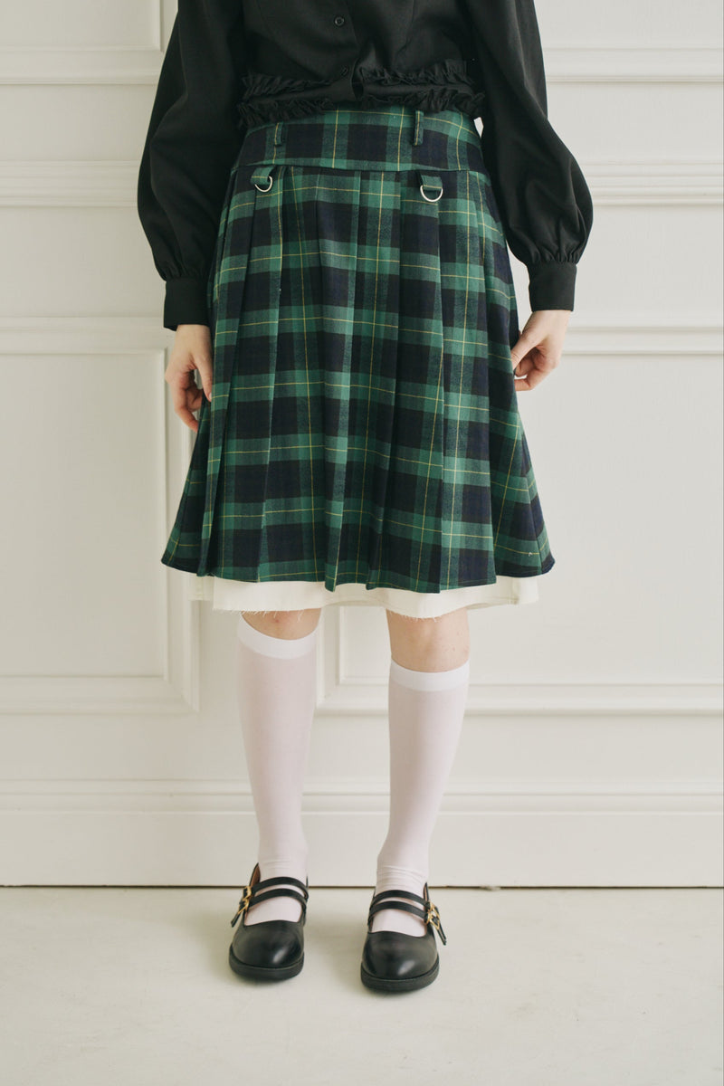 プリーツとレイヤード風デザインが存在感を放つミディ丈スカート。