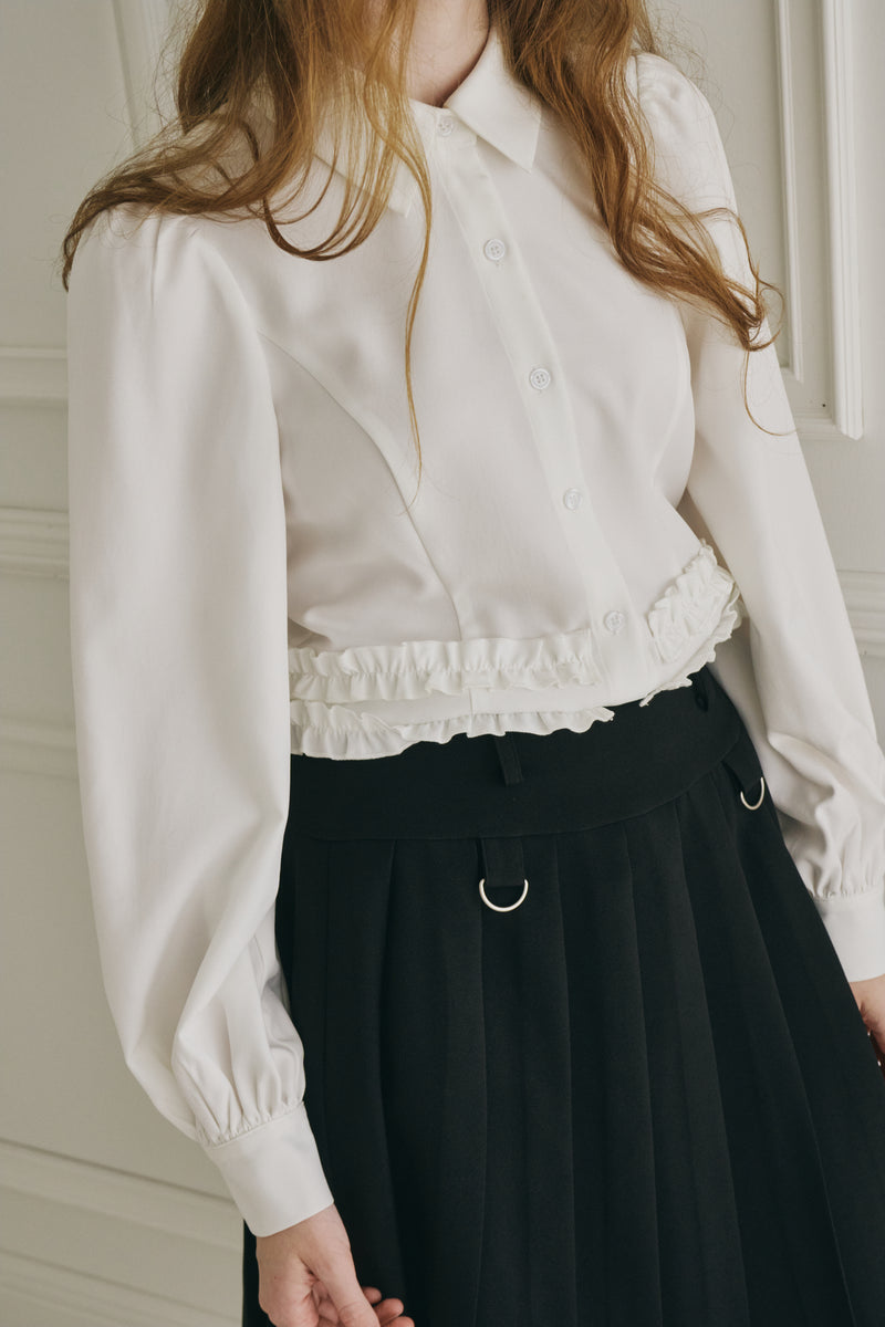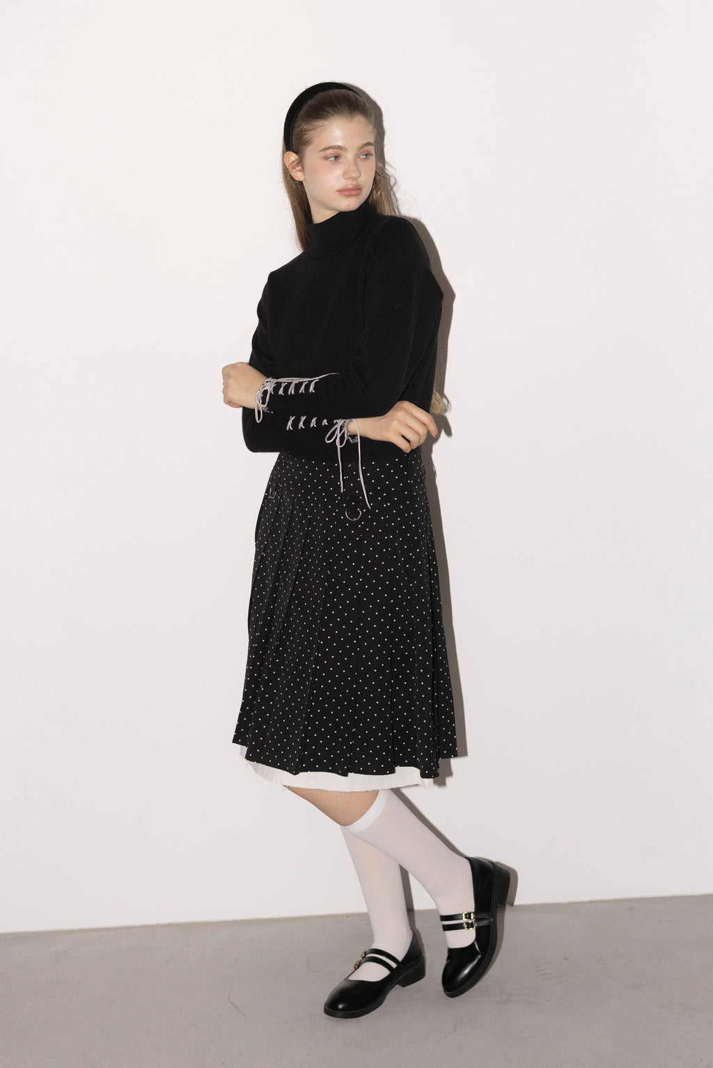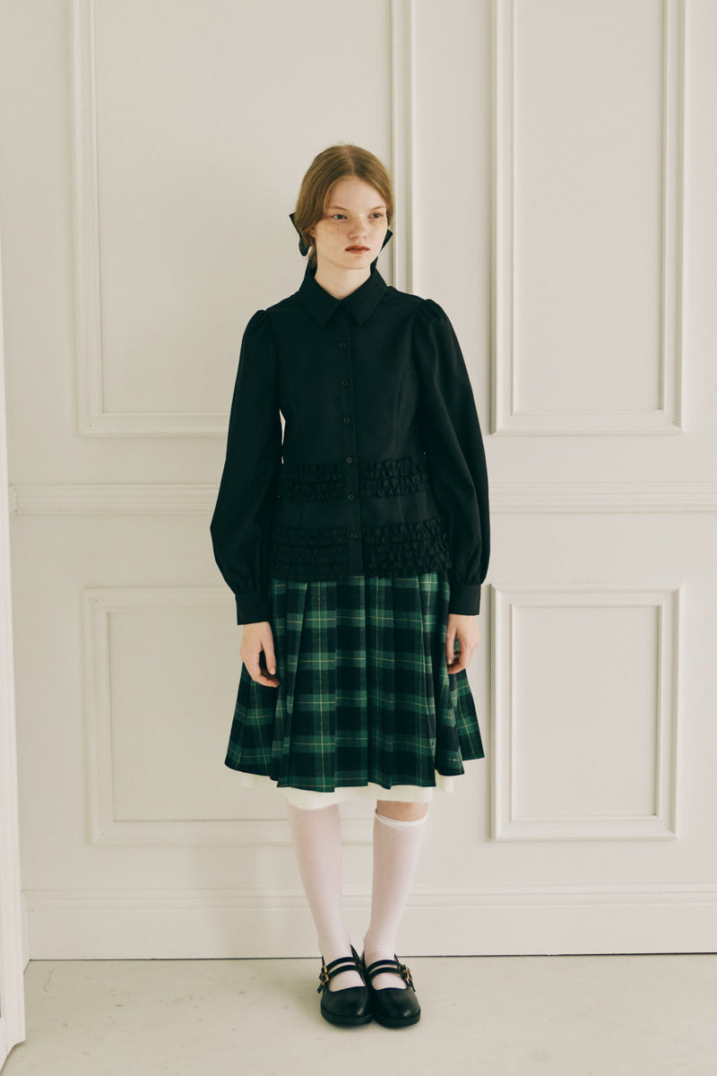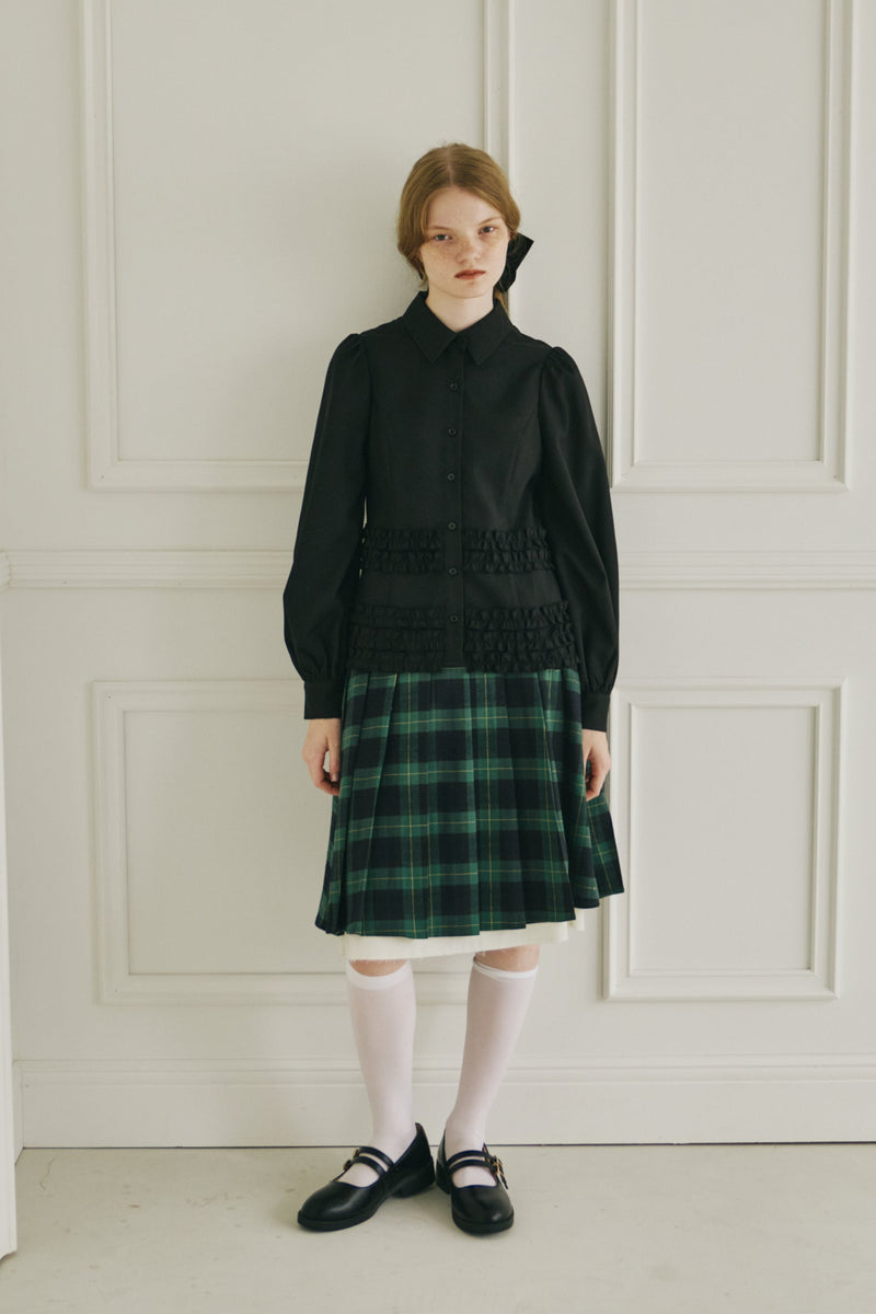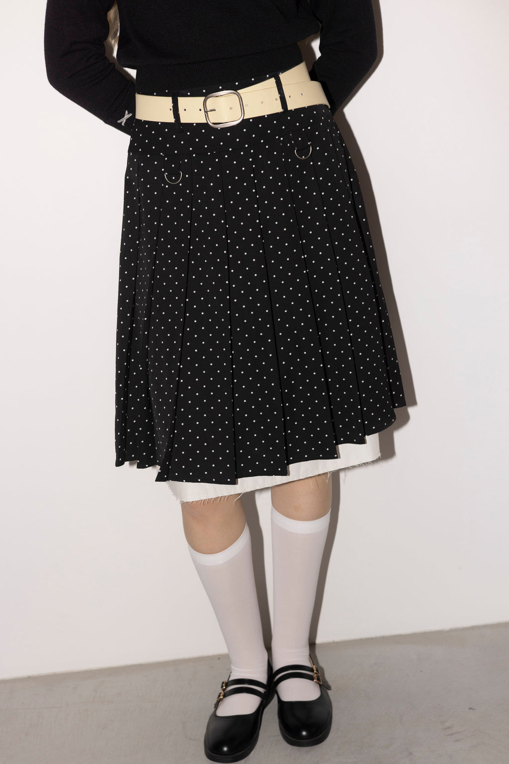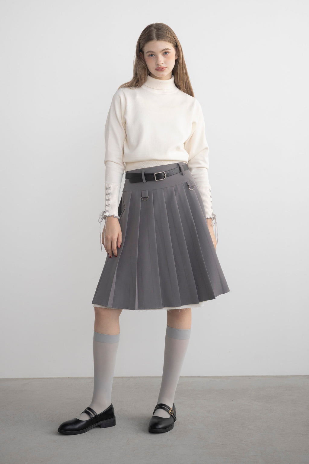 プリーツとレイヤード風デザインが存在感を放つミディ丈スカート。