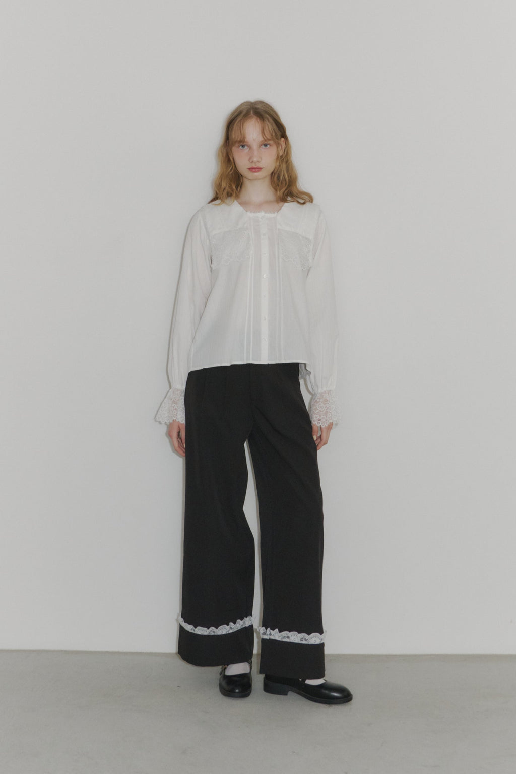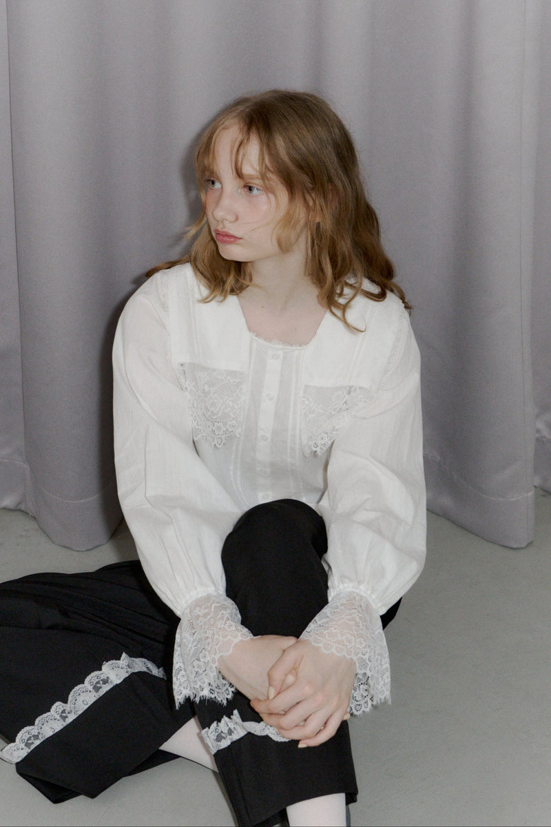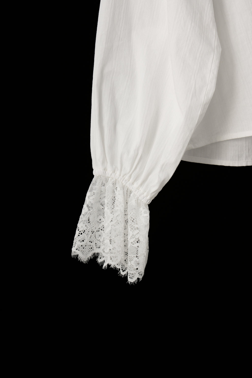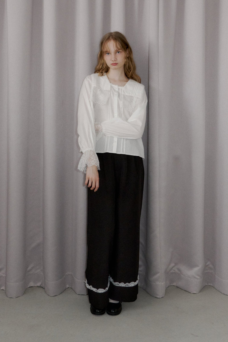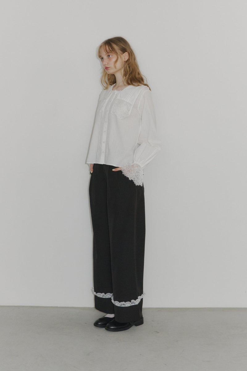 襟とレースが特徴的な華やかブラウス。デニムやワイドパンツと合わせれば、甘さを程よく抑えた大人カジュアルに。