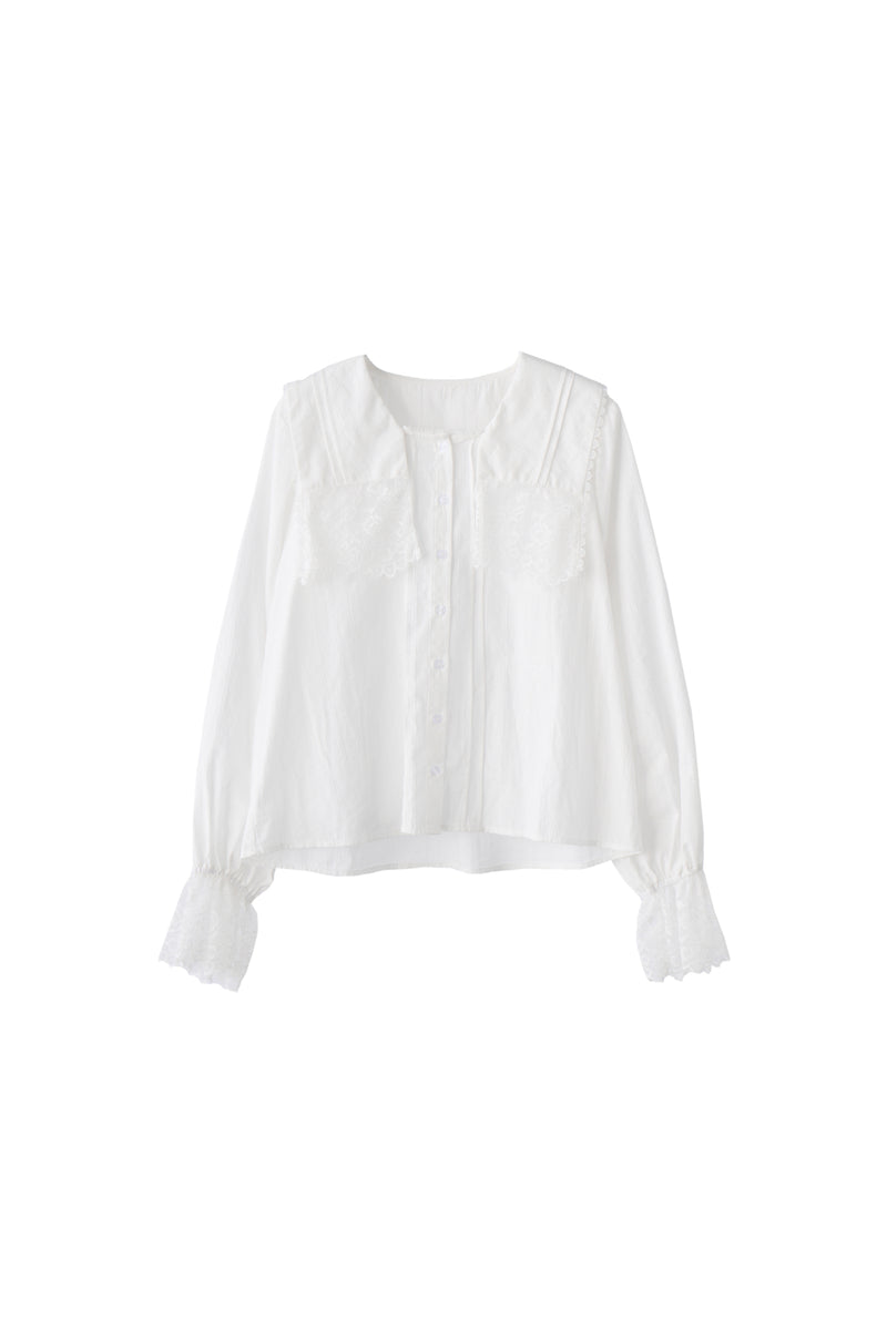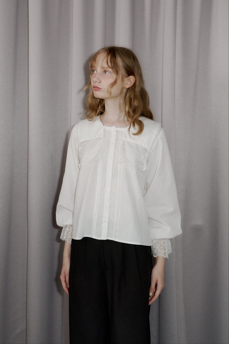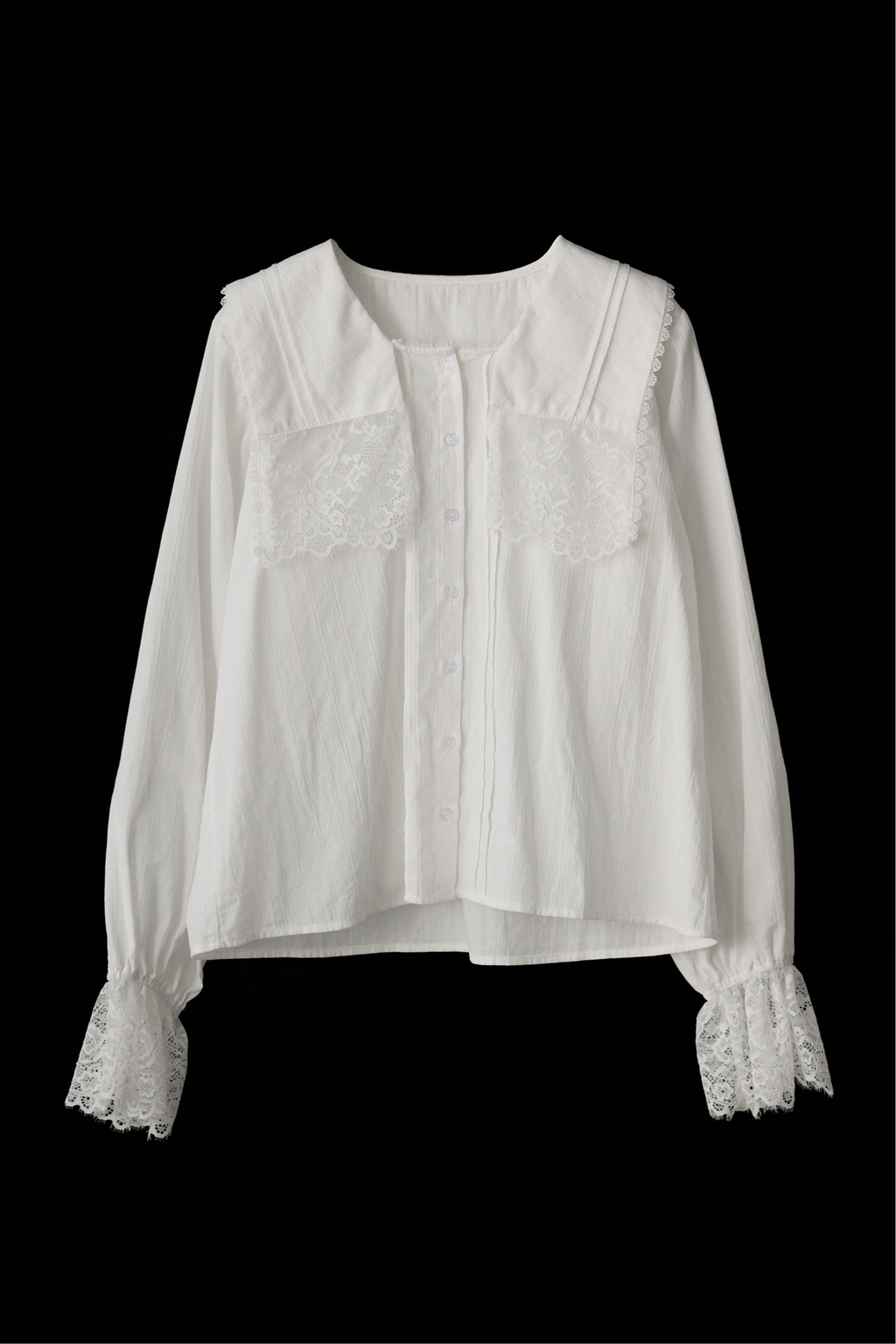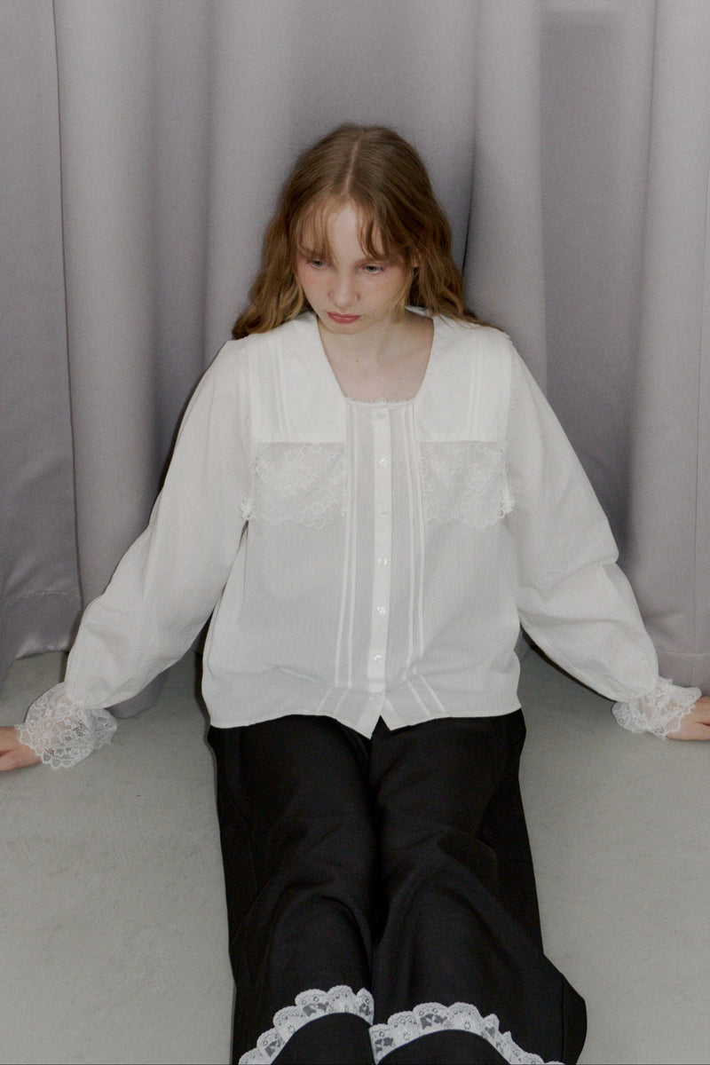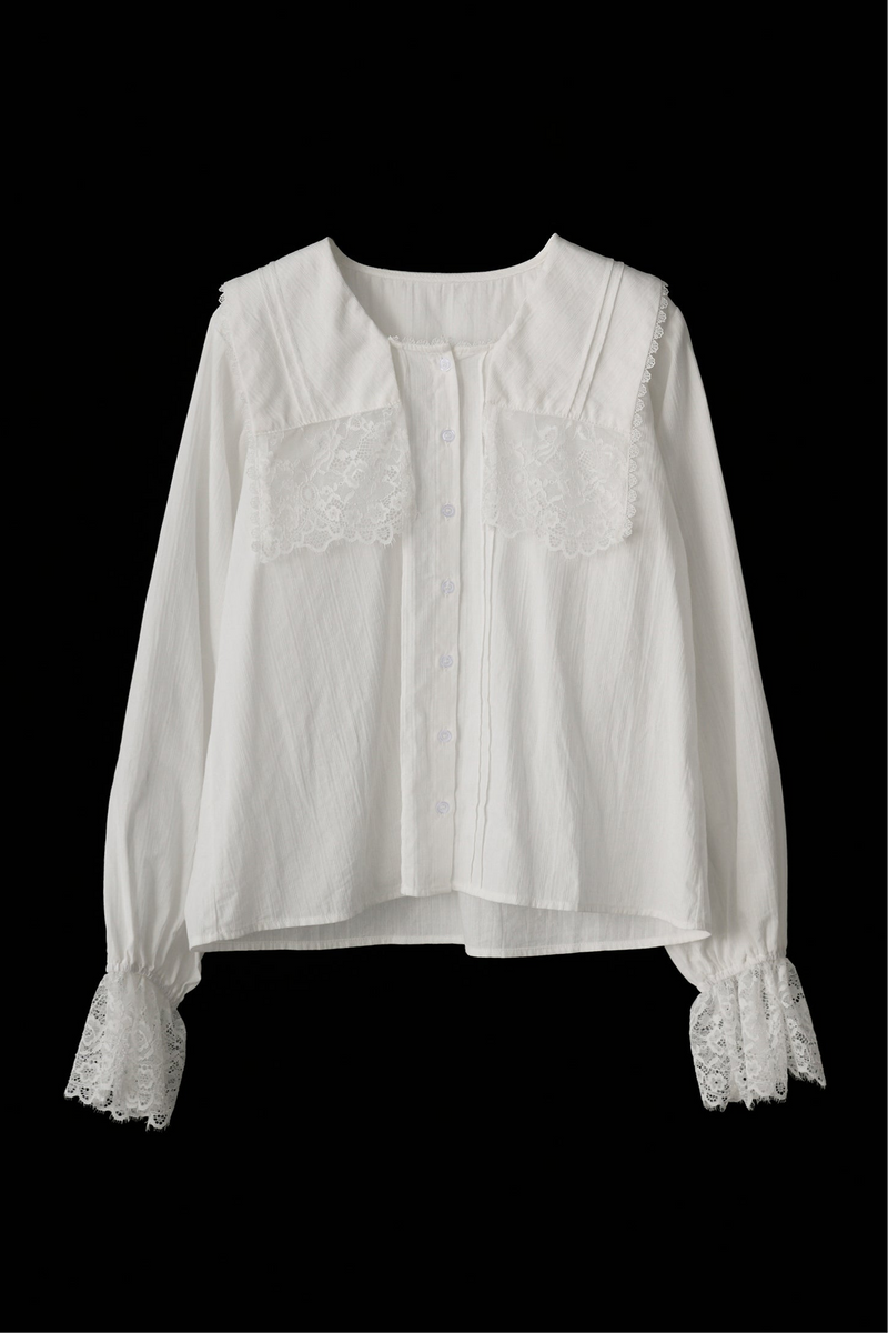 襟とレースが特徴的な華やかブラウス。デニムやワイドパンツと合わせれば、甘さを程よく抑えた大人カジュアルに。
