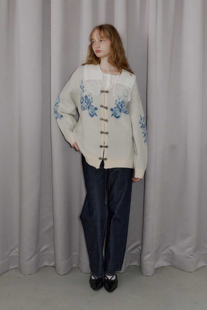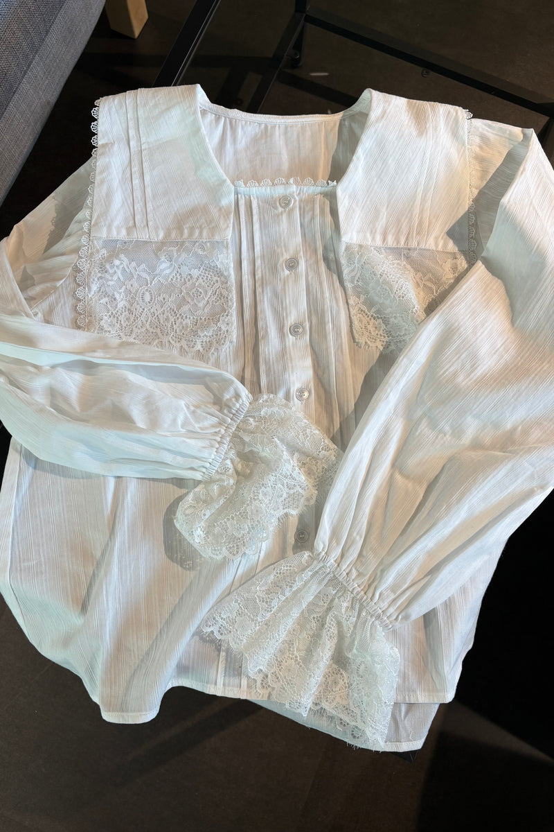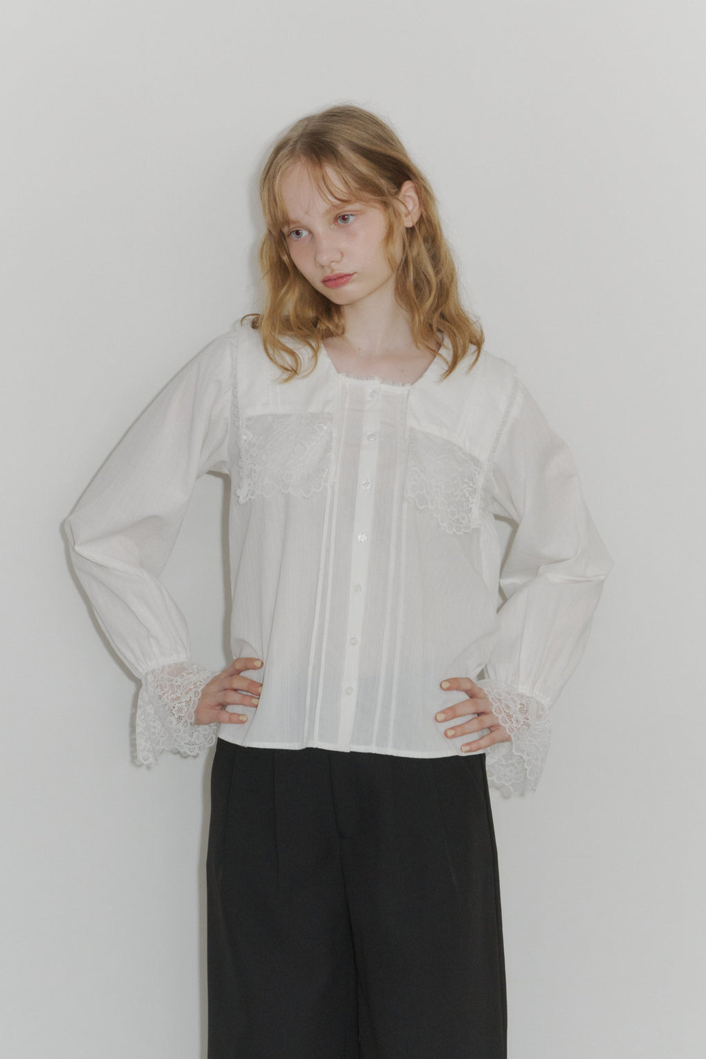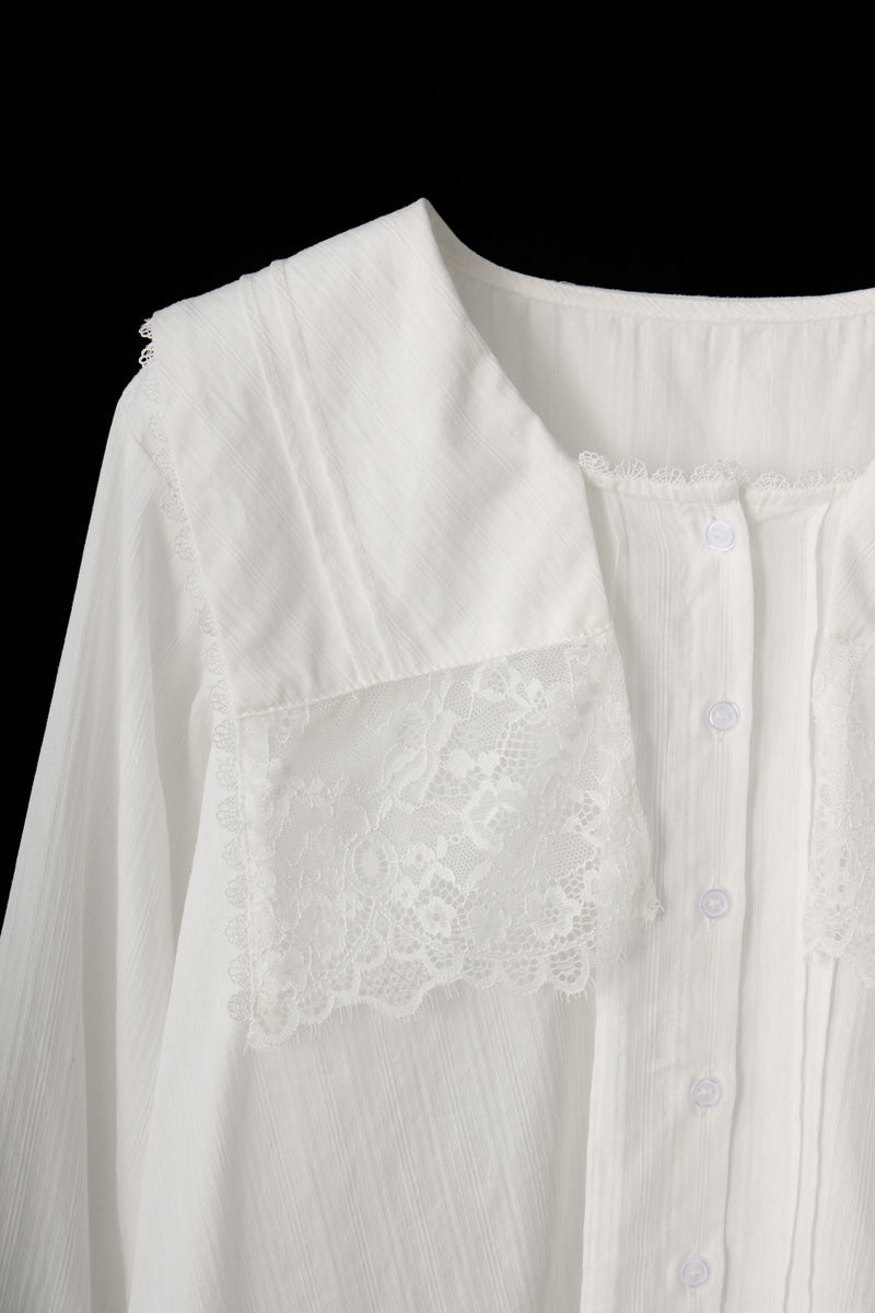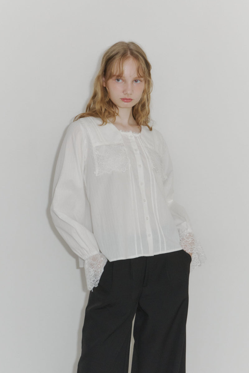 襟とレースが特徴的な華やかブラウス。デニムやワイドパンツと合わせれば、甘さを程よく抑えた大人カジュアルに。
