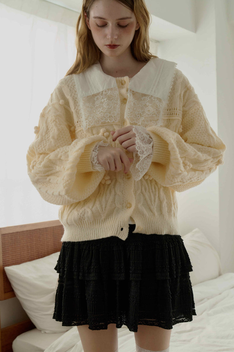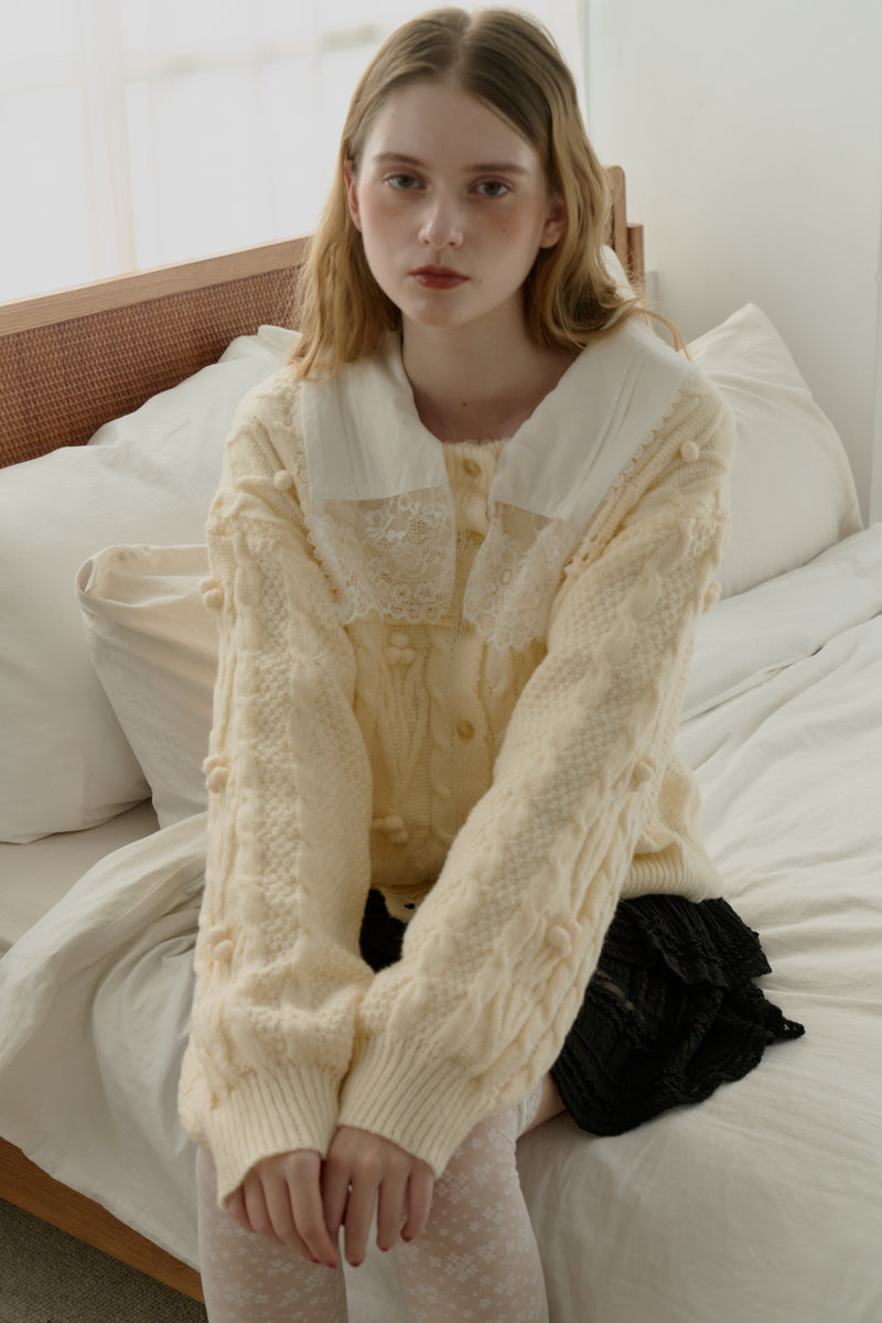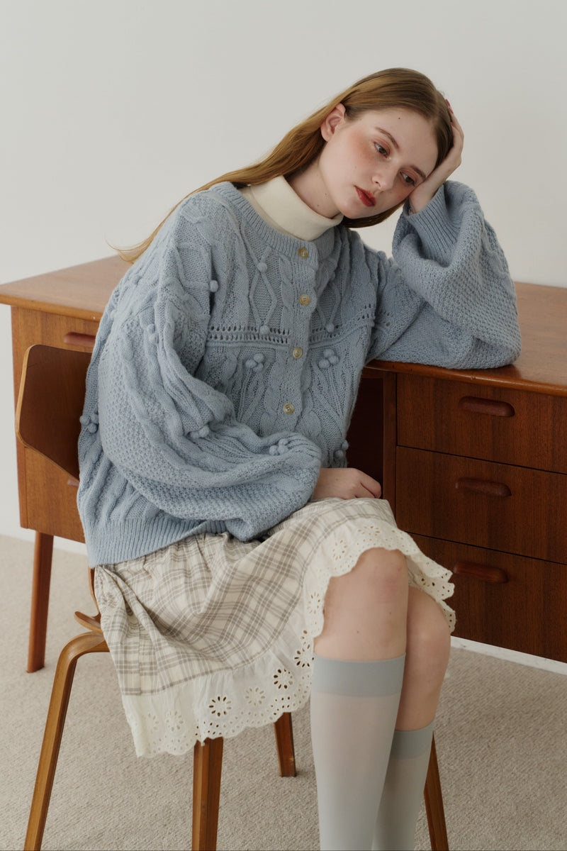 丸みのあるボリューム袖と上品なケーブルデザインで柔かな印象に。