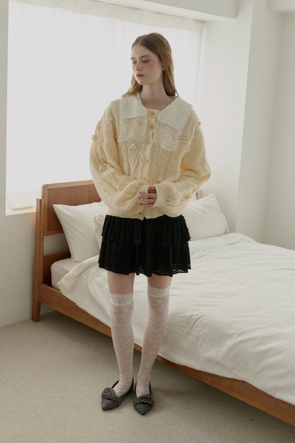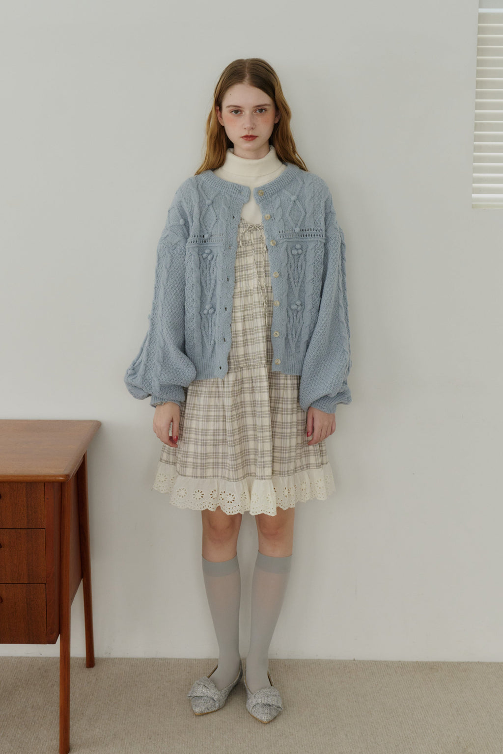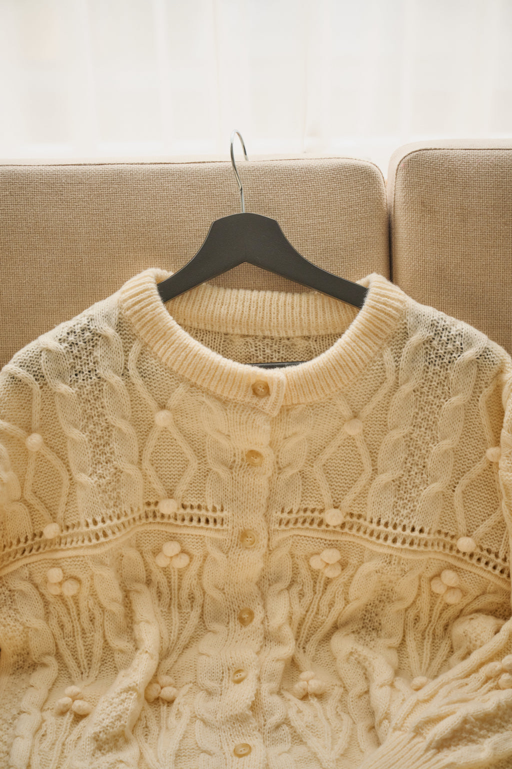 丸みのあるボリューム袖と上品なケーブルデザインで柔かな印象に。