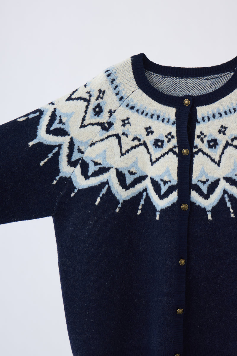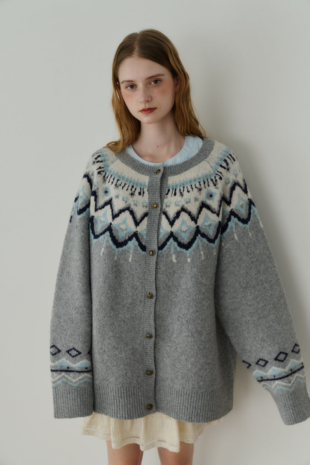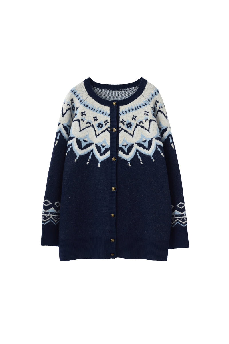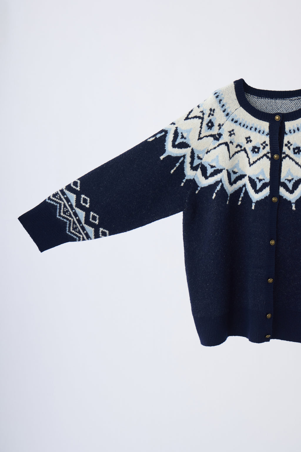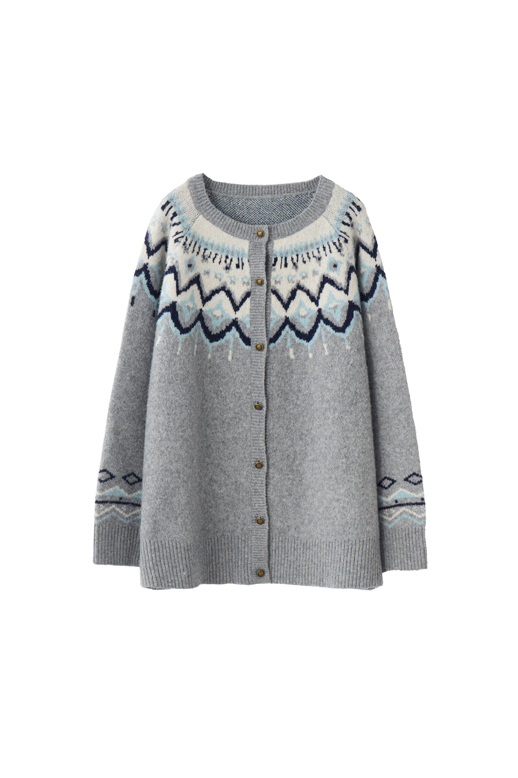 甘すぎないシックな配色が魅力のノルディックカーデは、1枚でも羽織りとしても活躍。