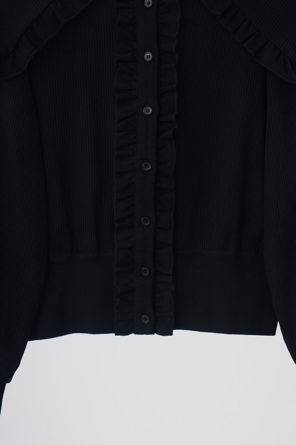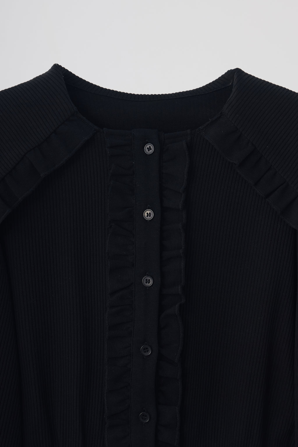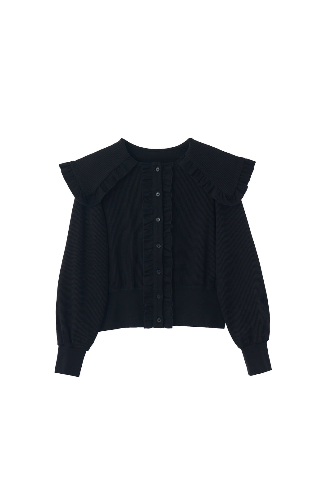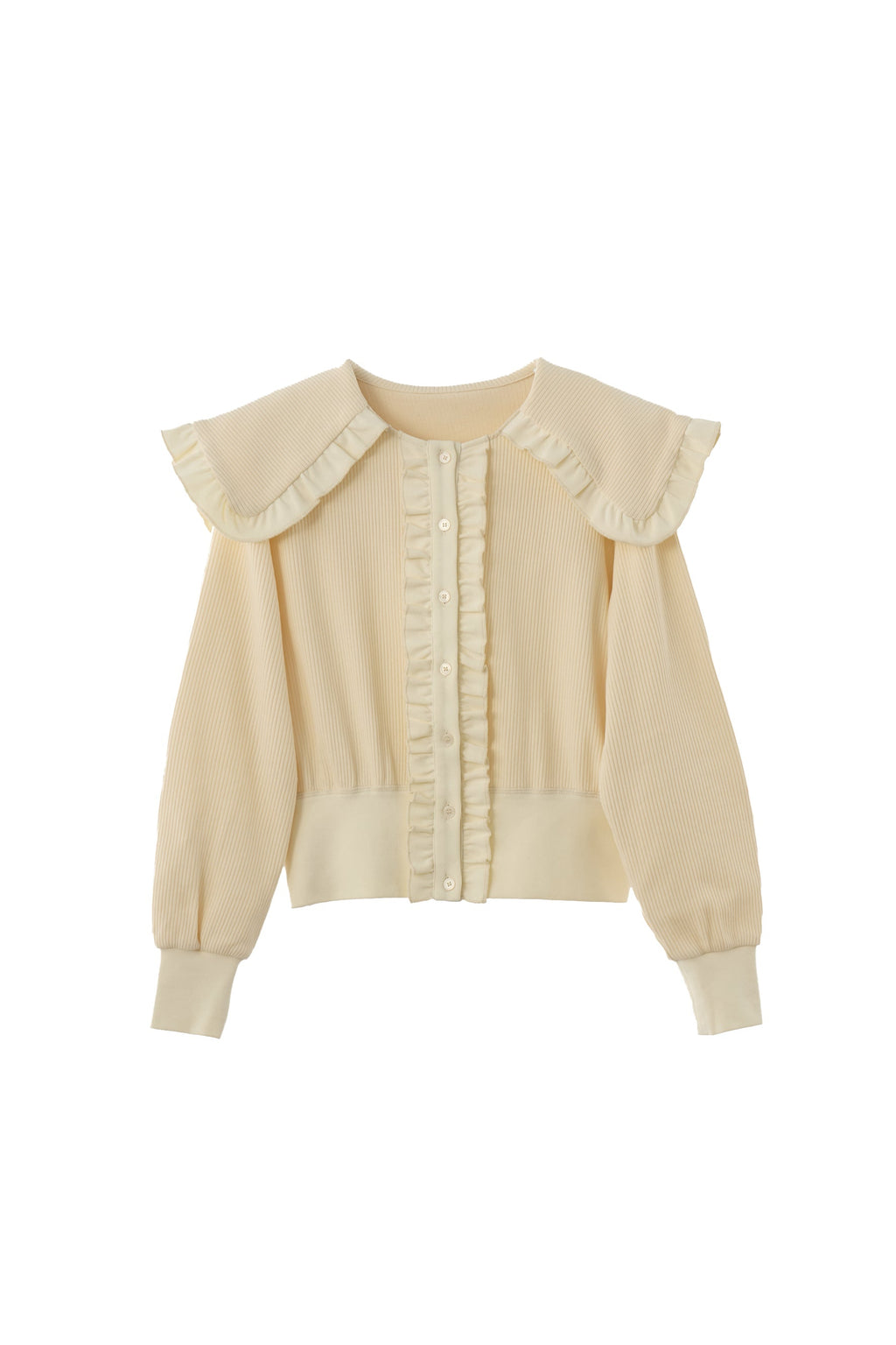 存在感のあるビッグフリルカラーが映えるリブカーディガン
