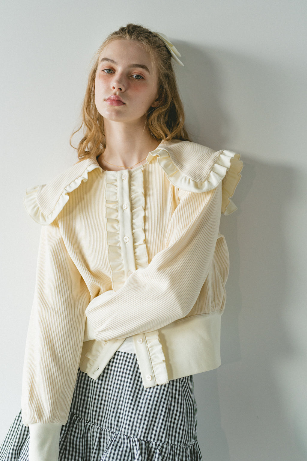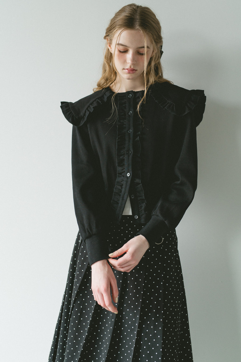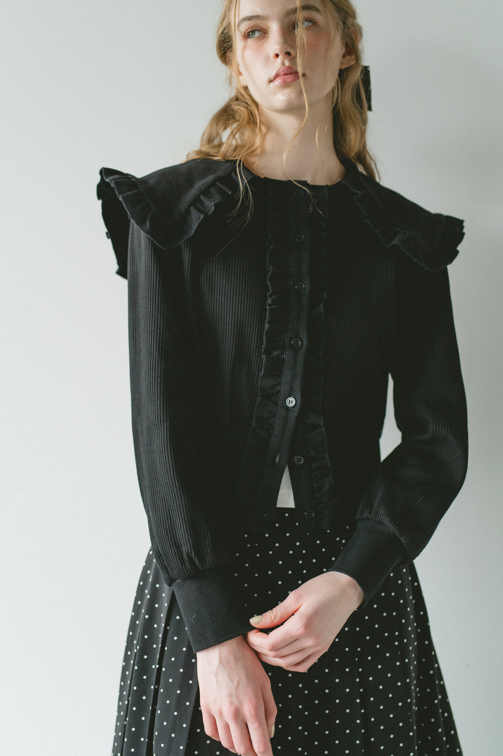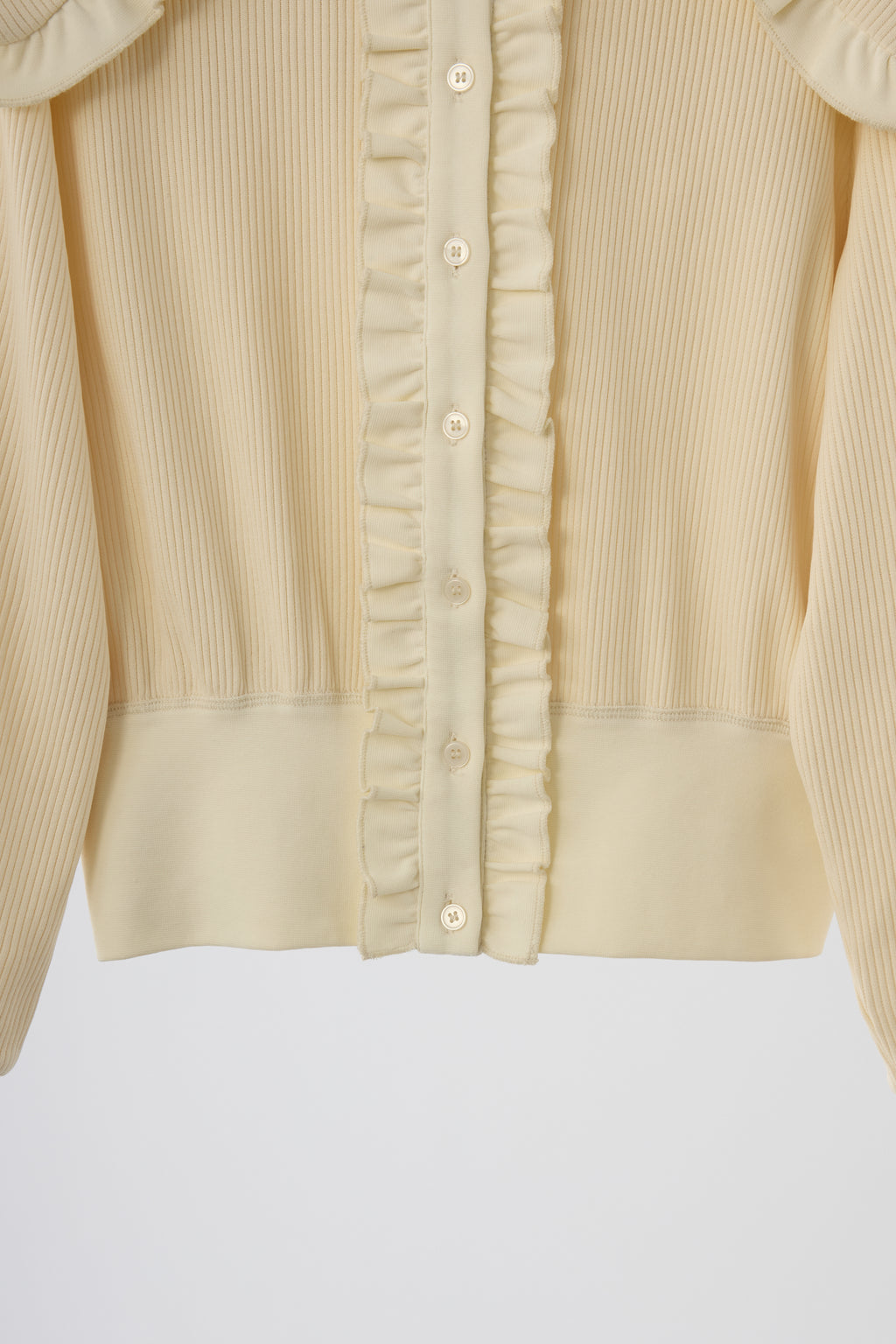 存在感のあるビッグフリルカラーが映えるリブカーディガン