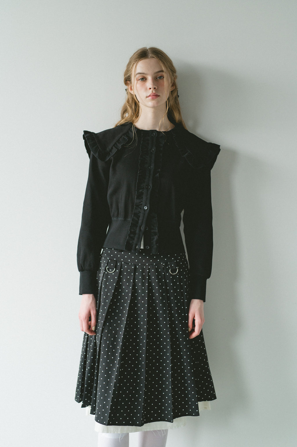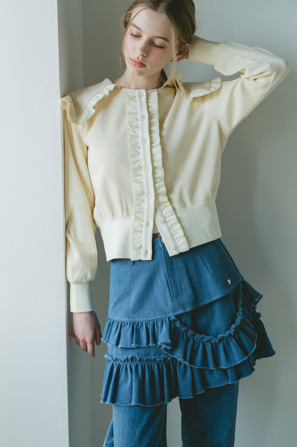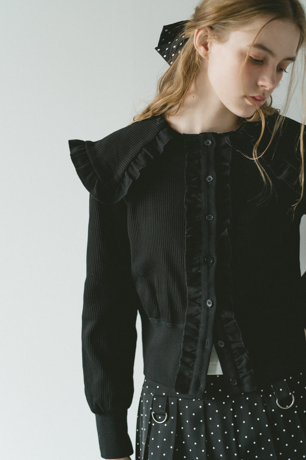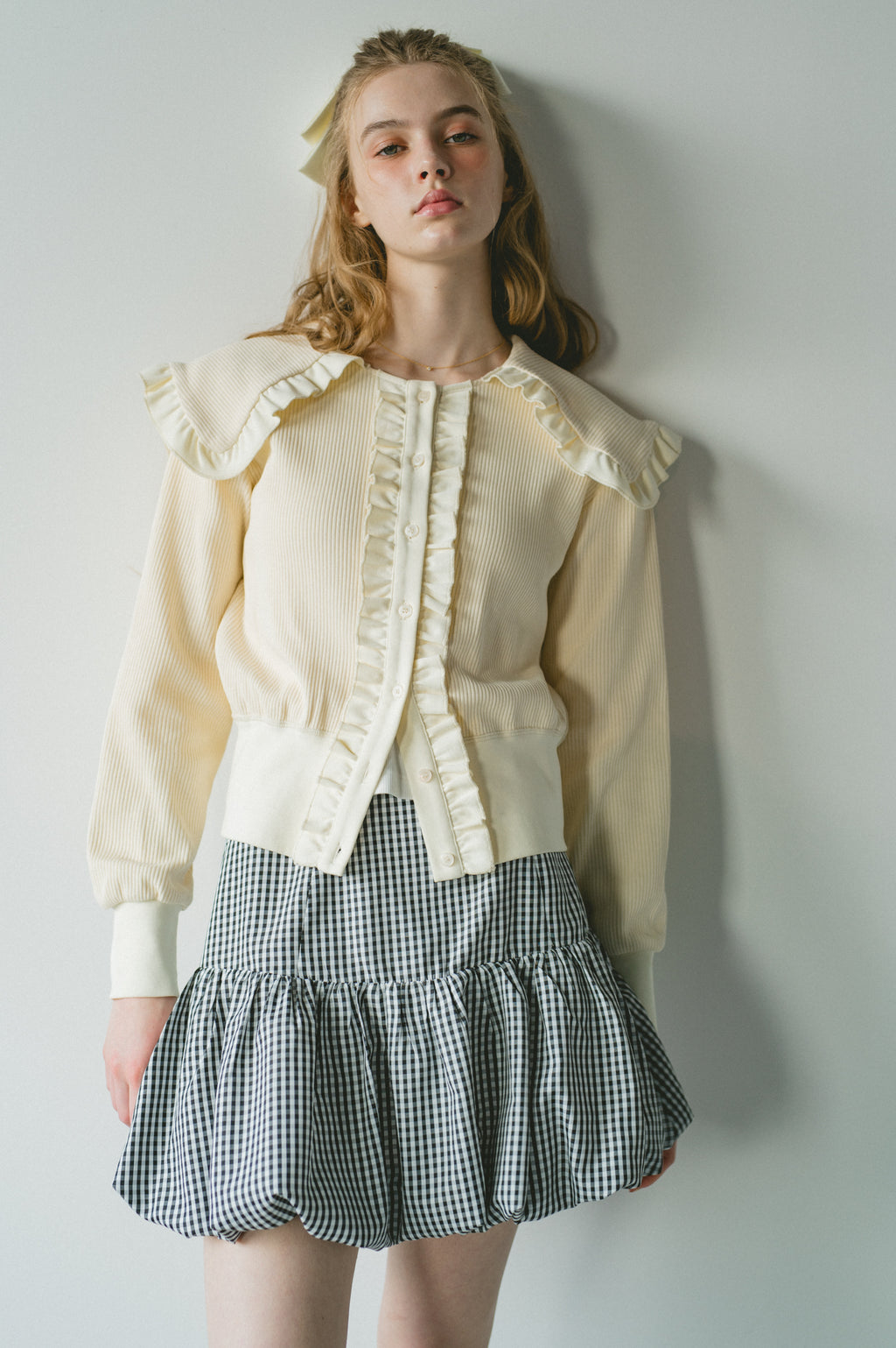 存在感のあるビッグフリルカラーが映えるリブカーディガン