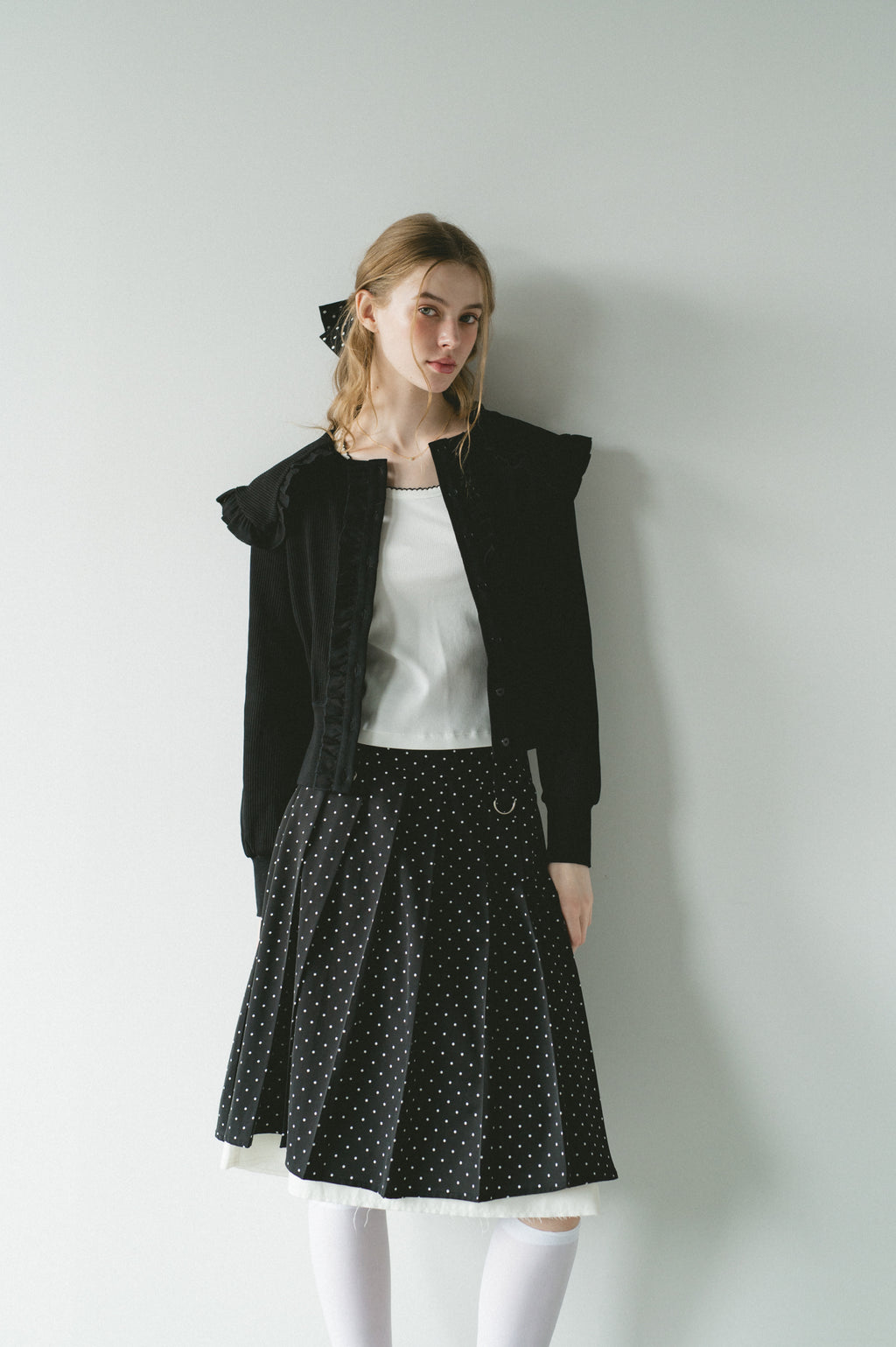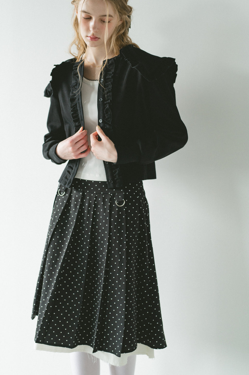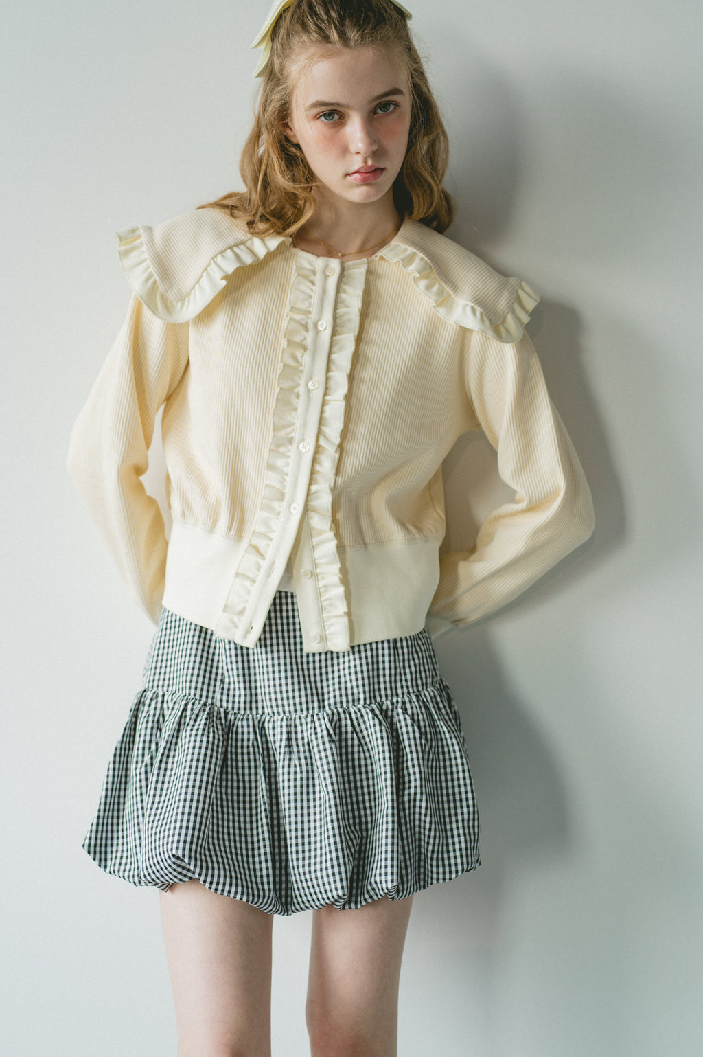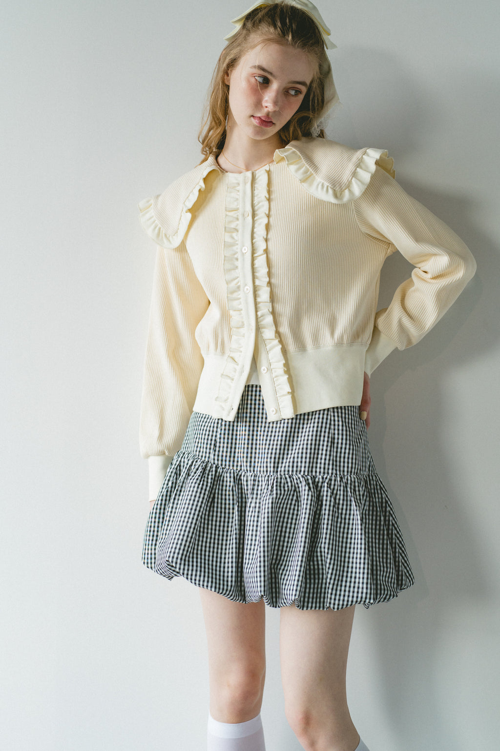 存在感のあるビッグフリルカラーが映えるリブカーディガン
