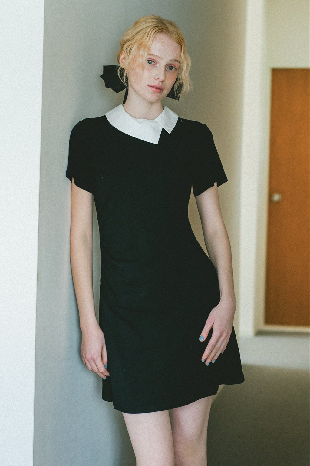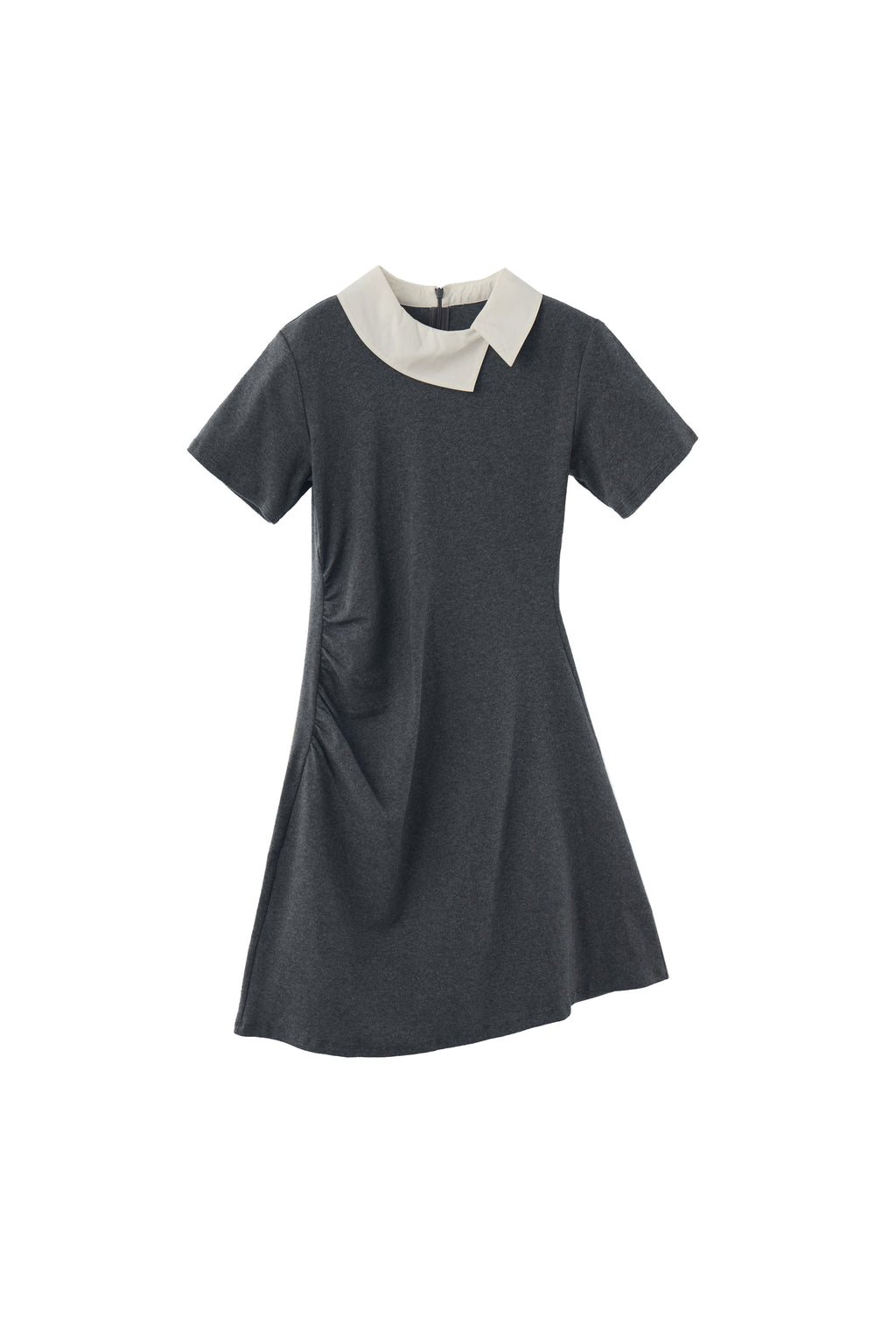 広がりのアシンメトリー衿が映える上品なワンピース