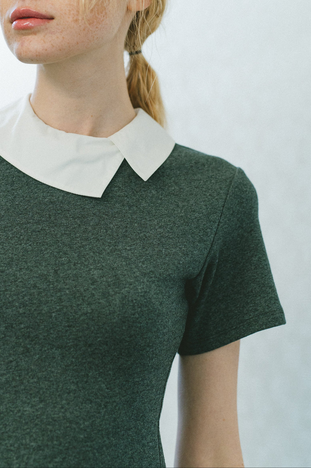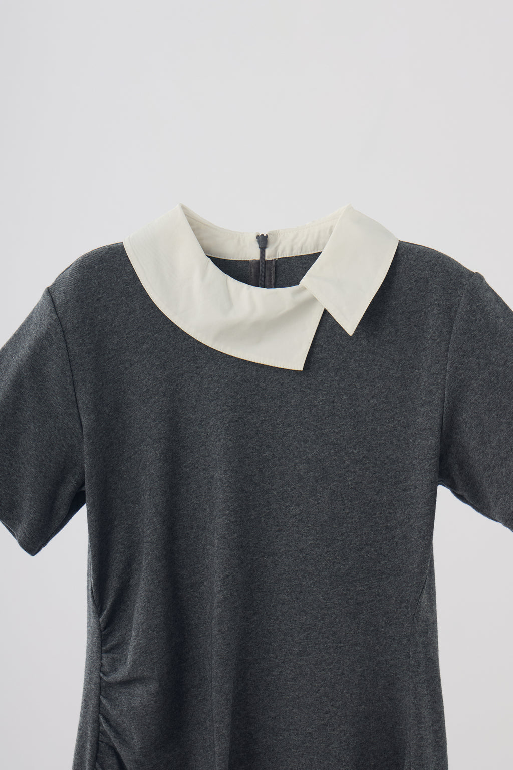 ・レイヤード風の衿デザインで顔周りにアクセント