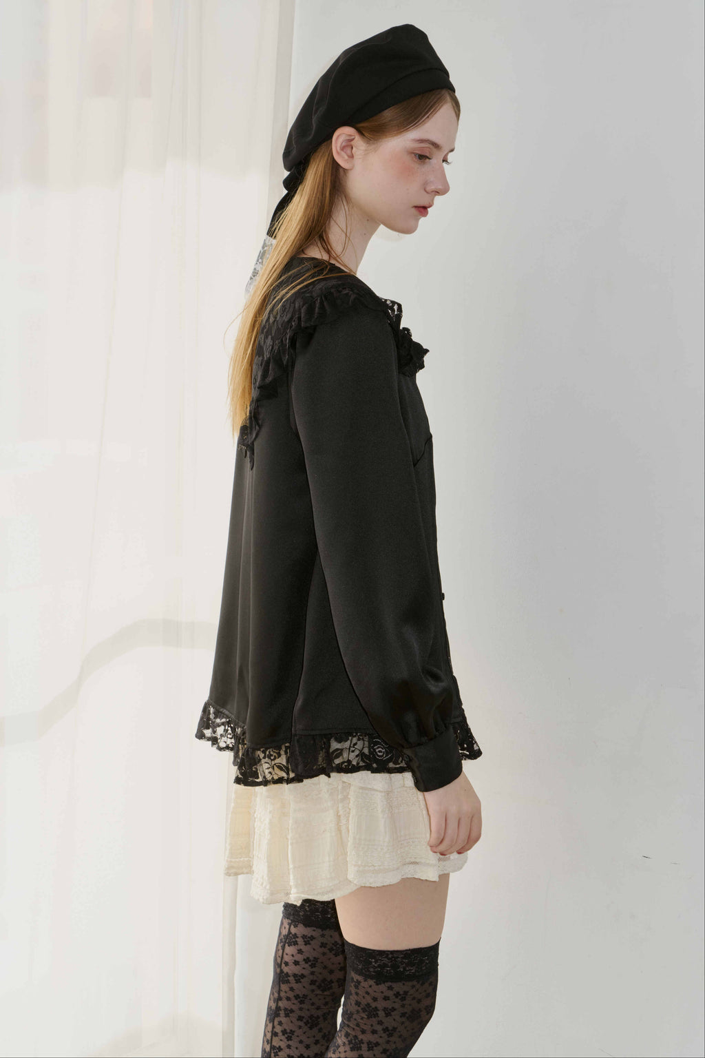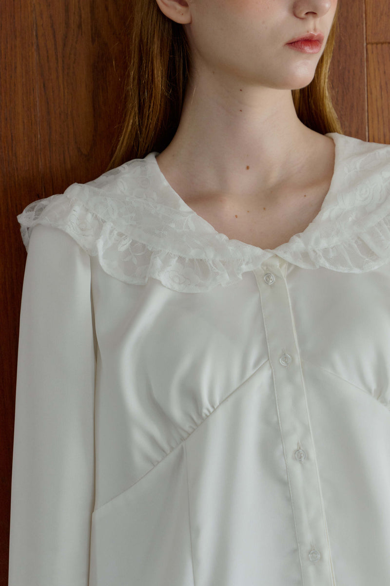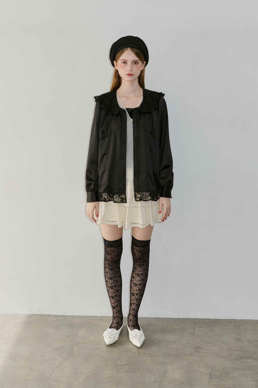 ・襟周りを繊細なレースフリルで縁取りフェミニンな表情に