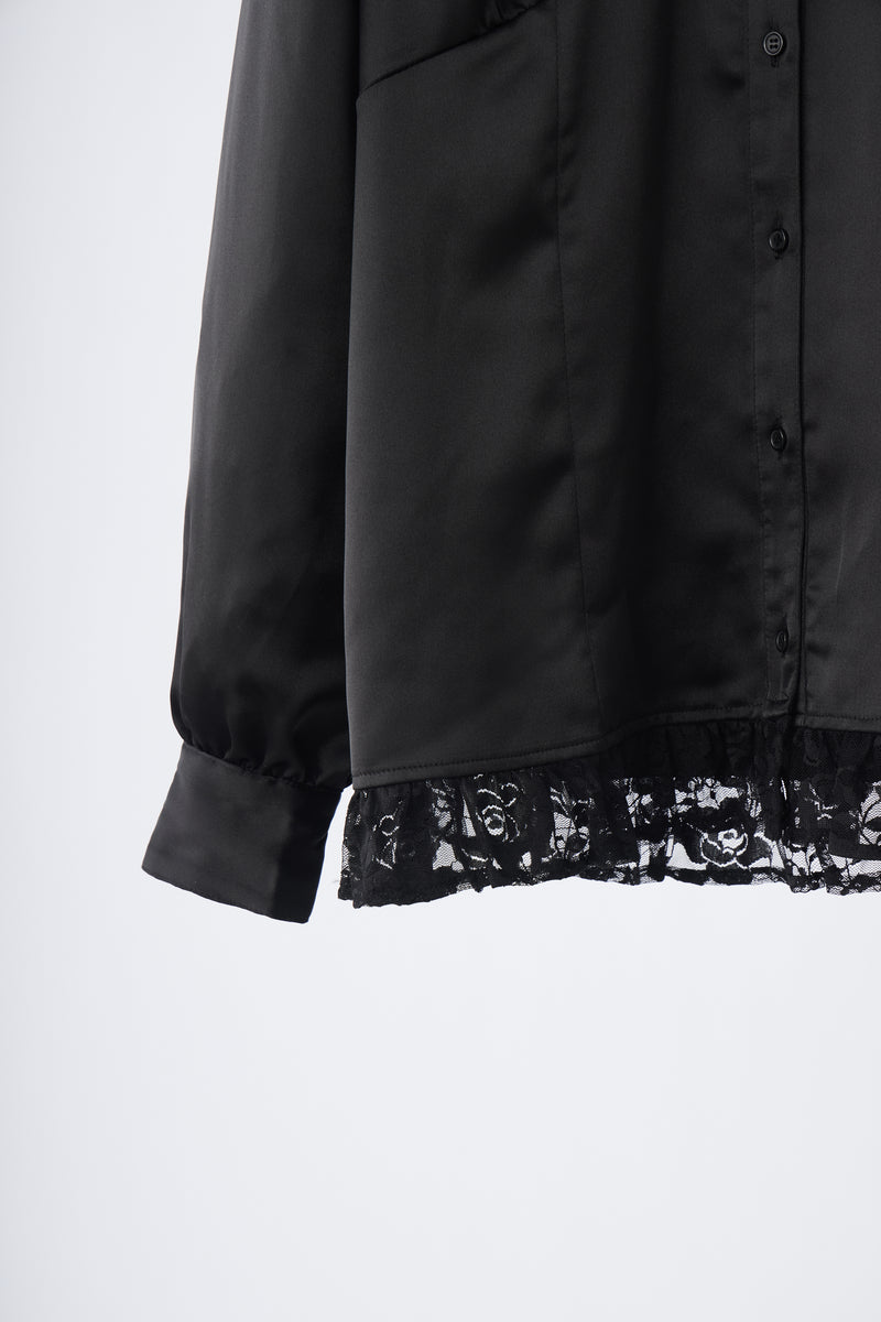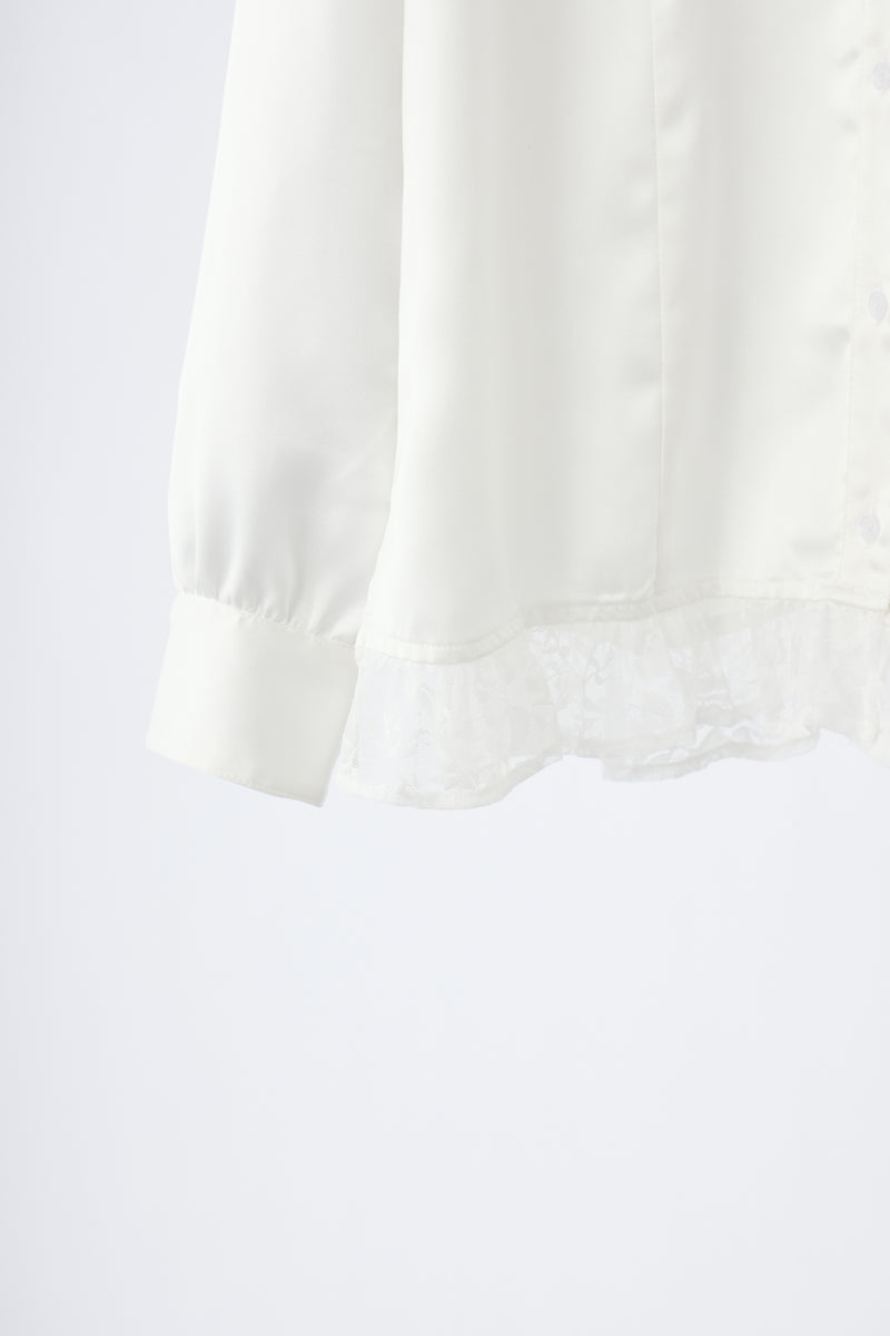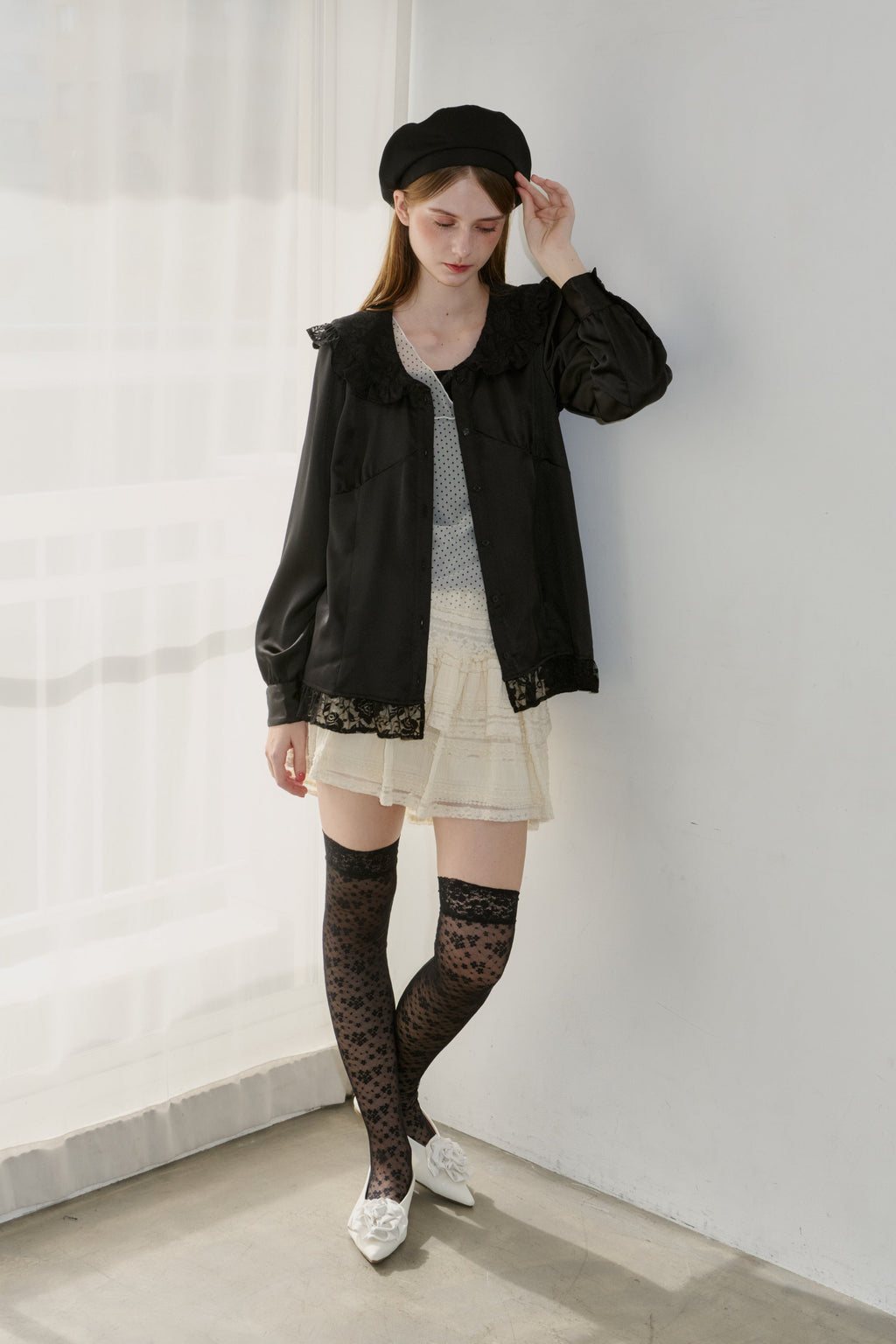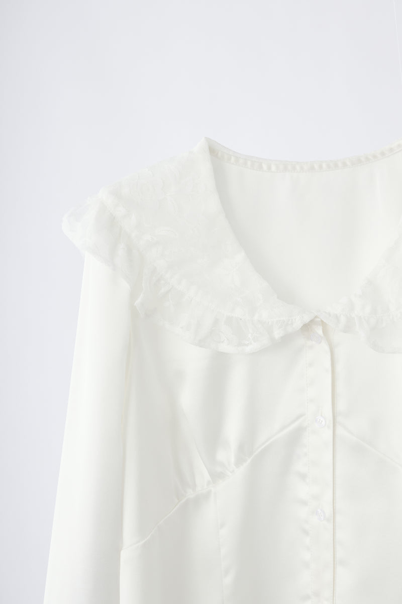 ・襟周りを繊細なレースフリルで縁取りフェミニンな表情に